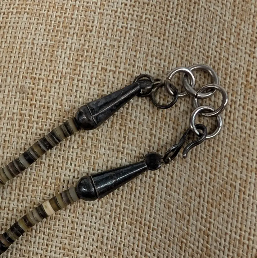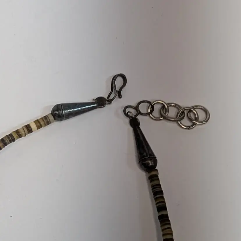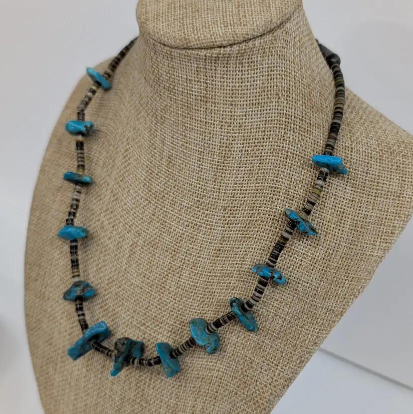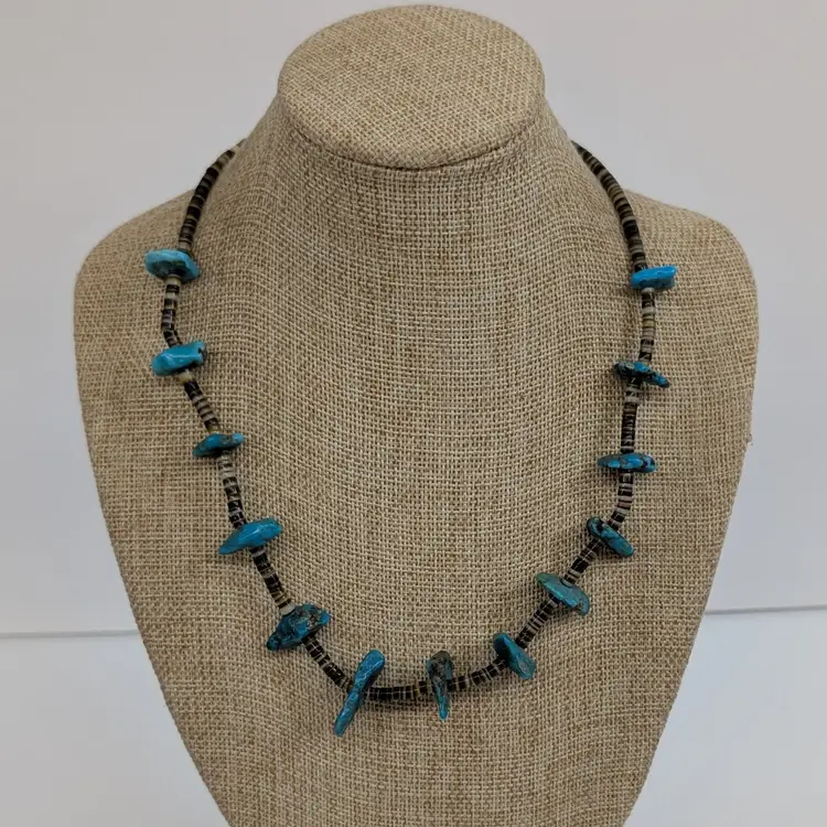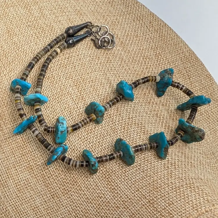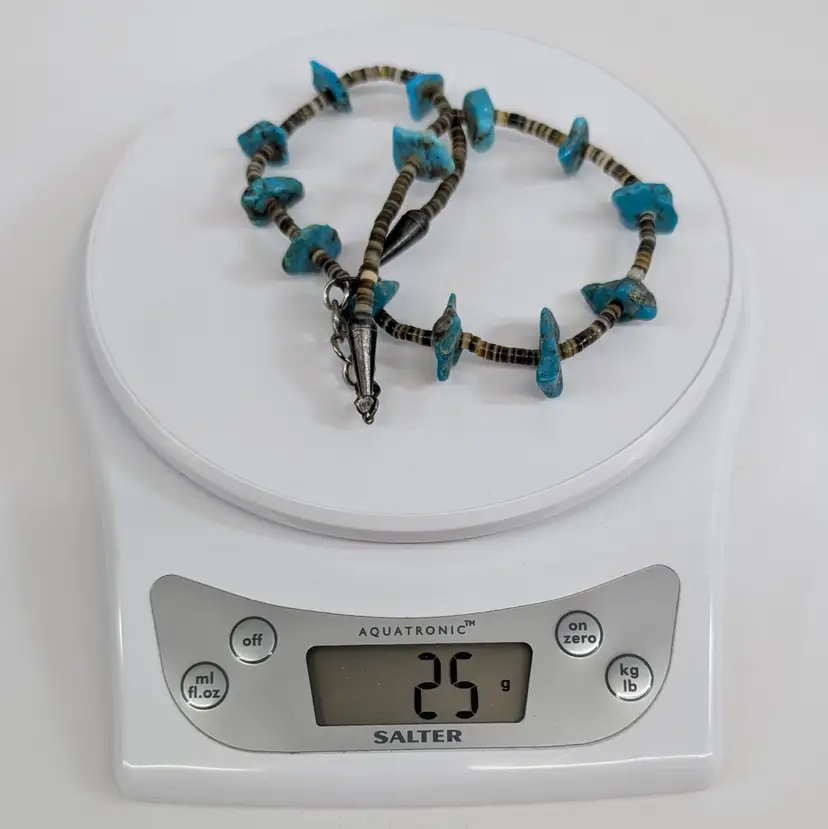 Beautiful mix of dark brown and cream heishi shell beads and turquoise tab beads. The ends are sterling but 4 jump rings have been added as an extender and they are not sterling. In nice, used condition. Measurements ~ 16.25 to 17"