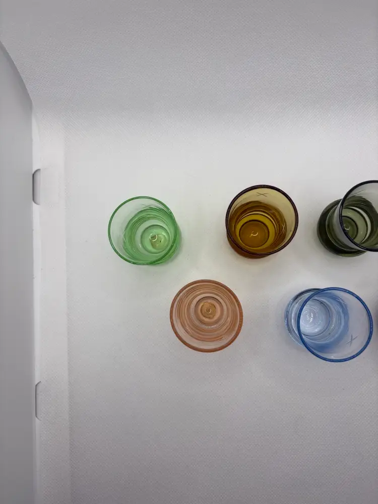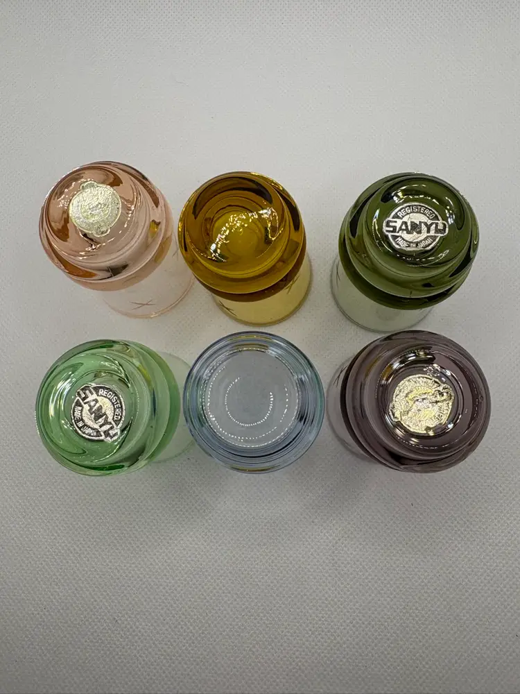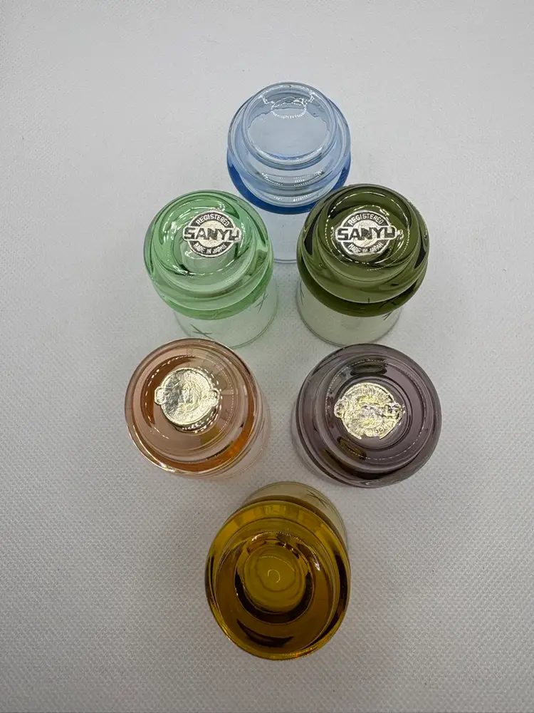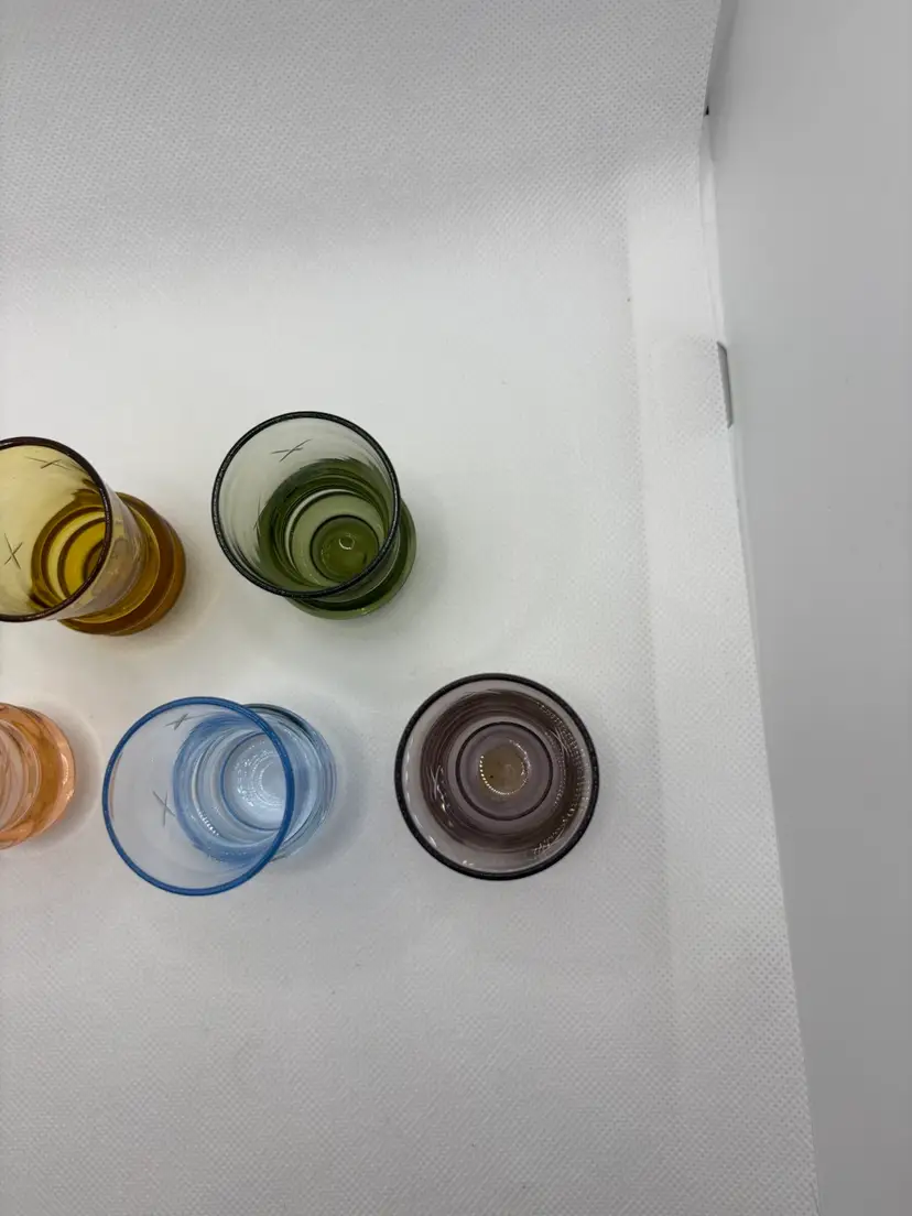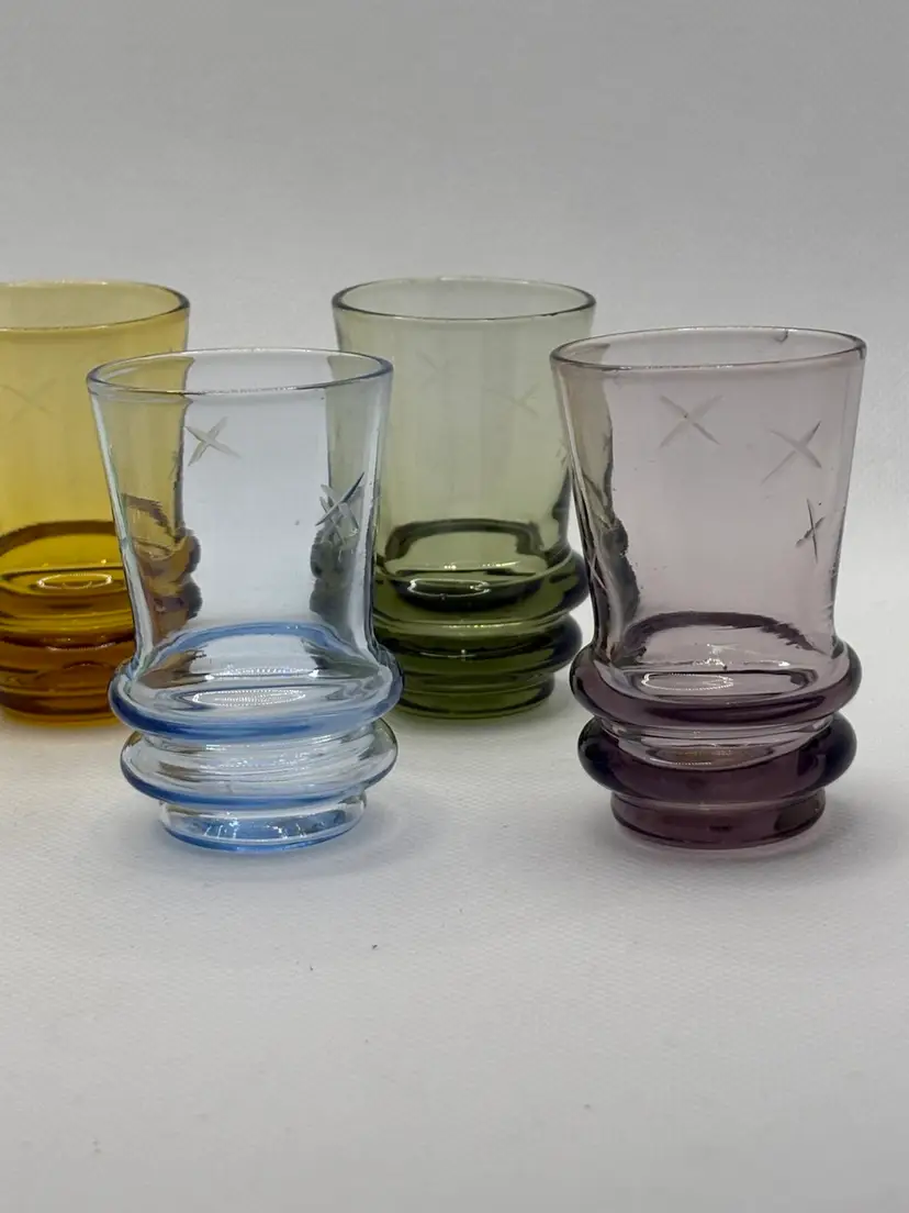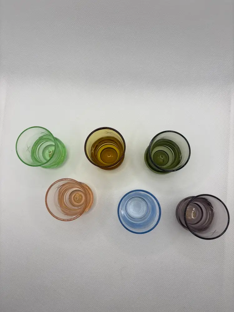 Set of Six SANYU shot glasses 50/60s era atomic starburst pattern. All six individual colors. Made in Japan really cool shot glasses. 4 of the six still have the original stickers on the bottom. Very rare and can not find any with stickers still attached online. Thanks for looking!