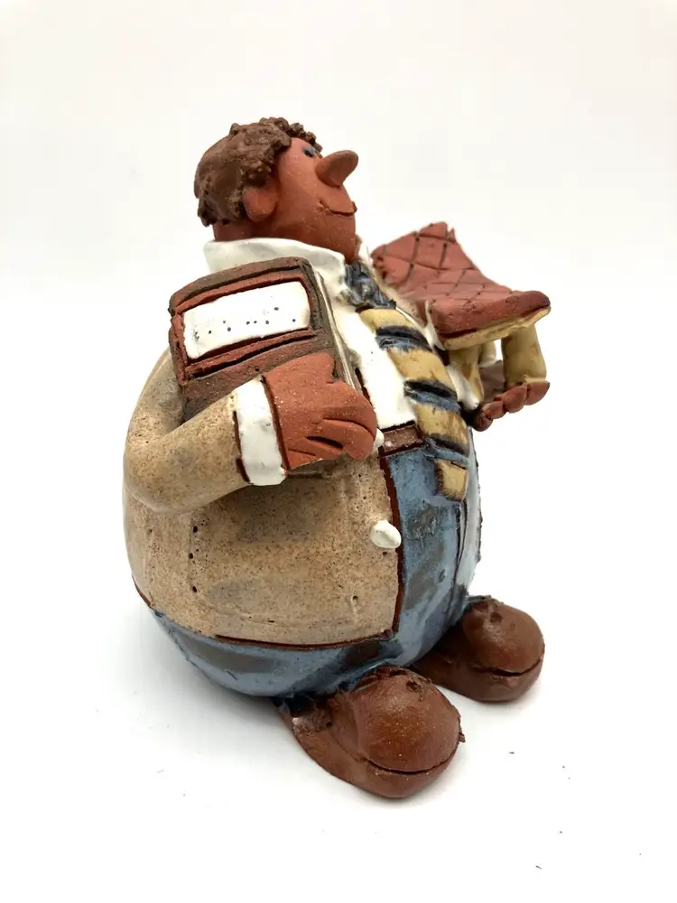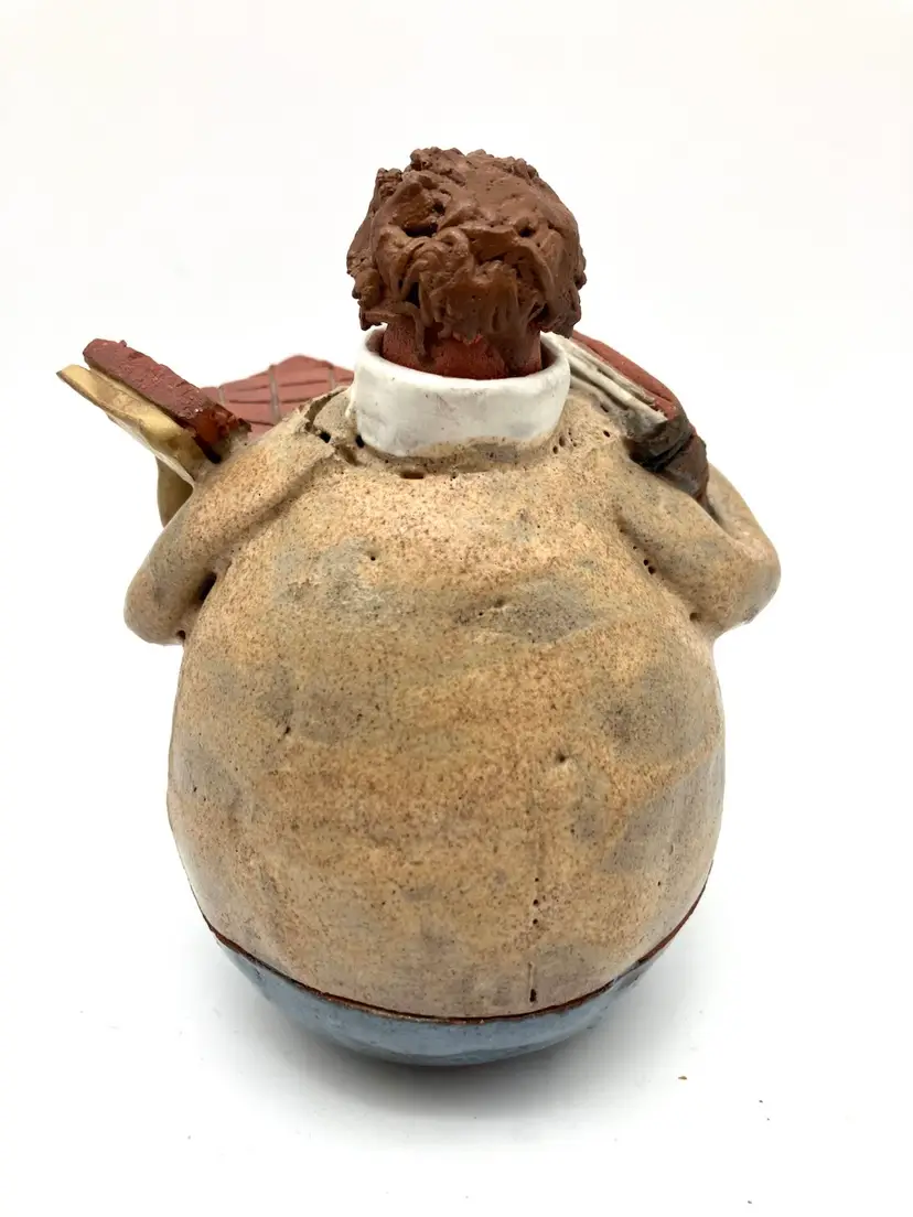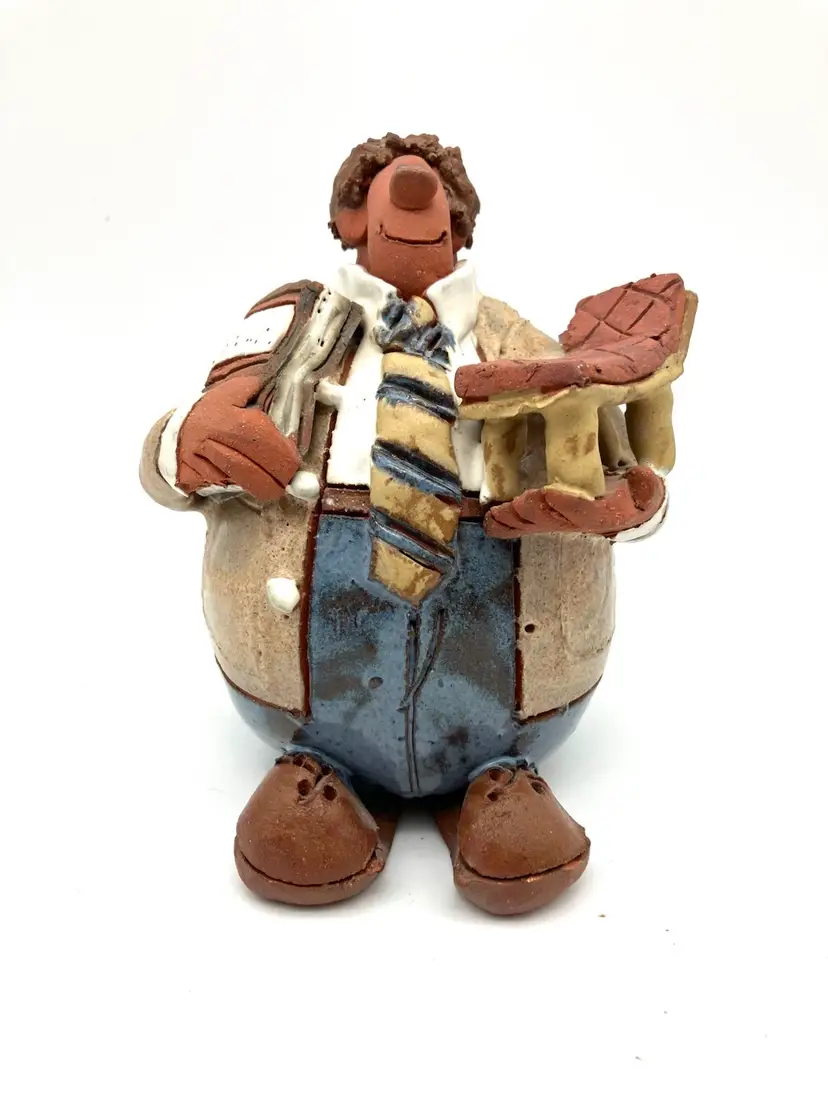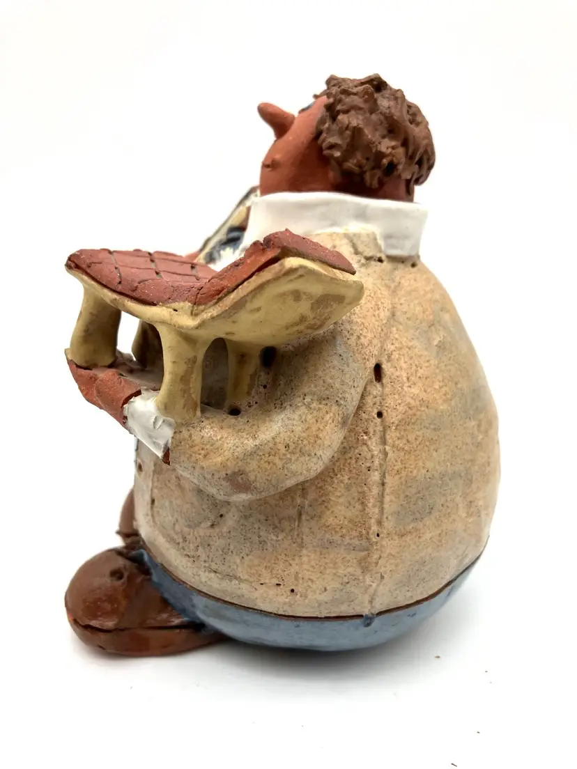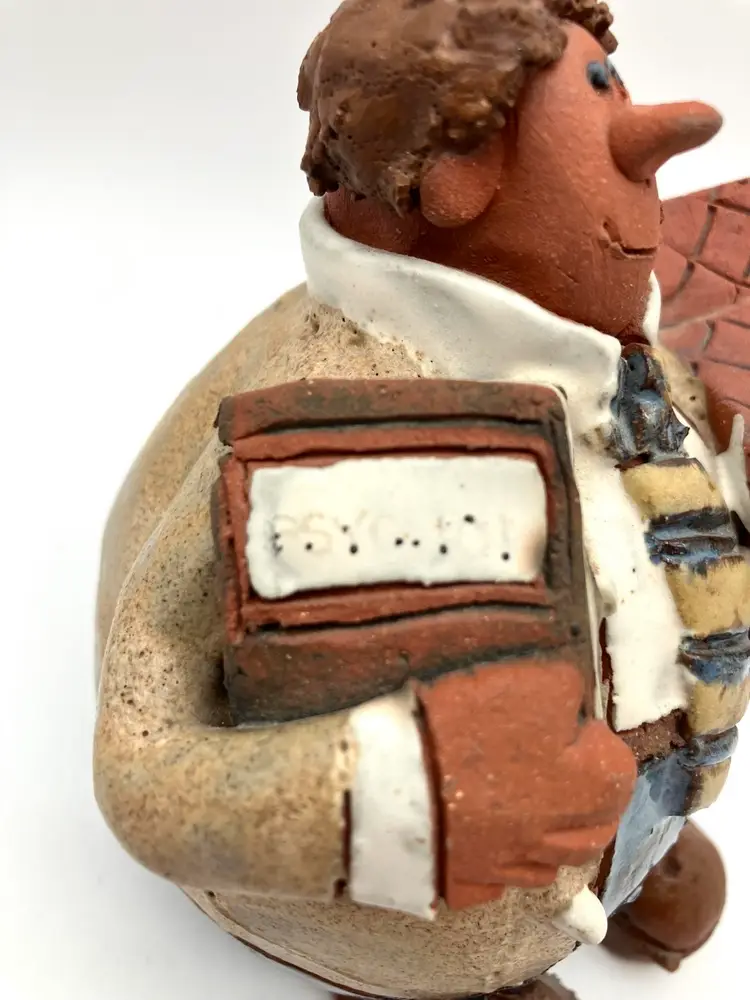 Sara meadows is known for her whimsical and quirky “balloon people” figures. This one depicts a man holding a book with the faded word “Psychiatry” and a very small couch. Perhaps he is a pet psychiatrist? 😜 nonetheless, he is in excellent condition. 5” tall x 4.25” wide and 4.125” deep. Sara was based in Kennet Square, PA