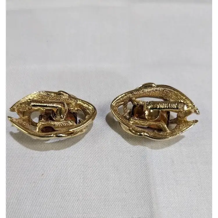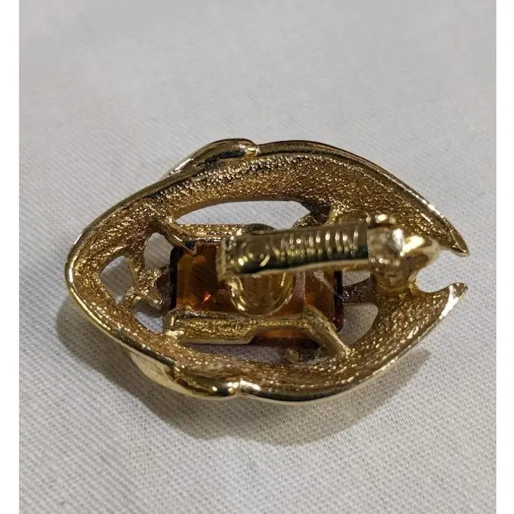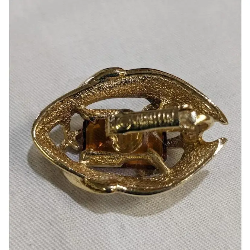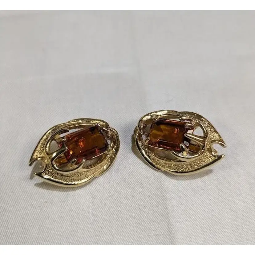 Beautiful emerald cut topaz colored stones surrounded by gold tone metal with the Sarah Coventry markings on the clips.