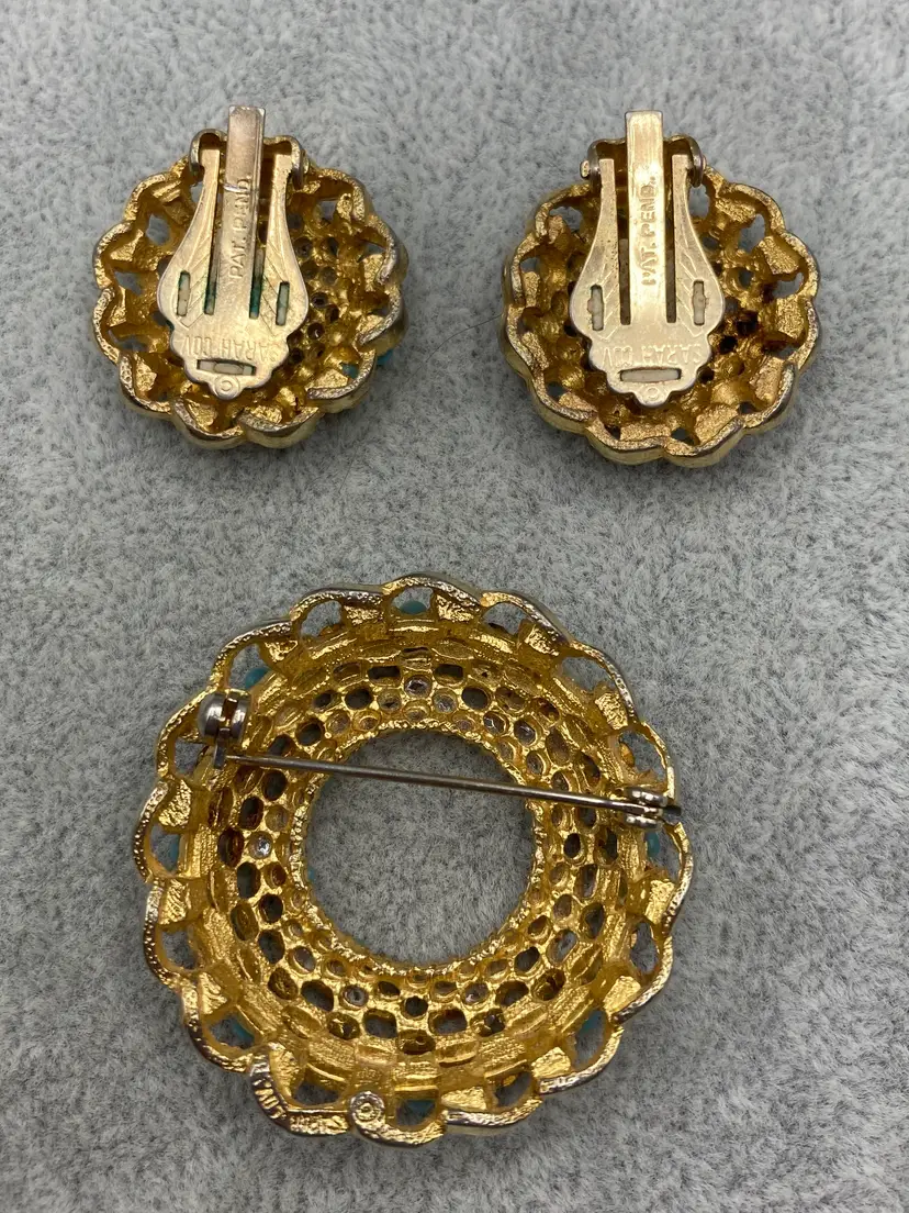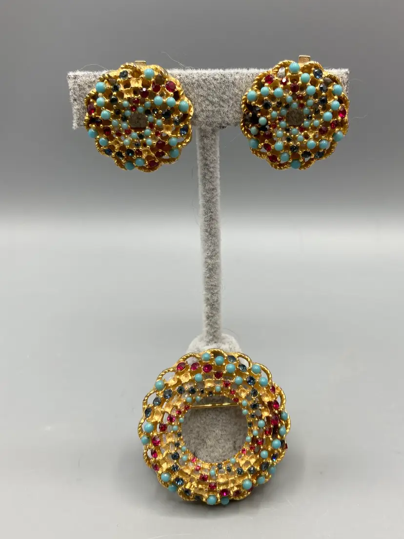 This brooch and earring set are in fair condition. There are some stones missing, which isn't all that noticeable in this pattern. Please look closely at the photos. The earrings measure approximately 1" across. The brooch measures approximately 1 1/2" across.