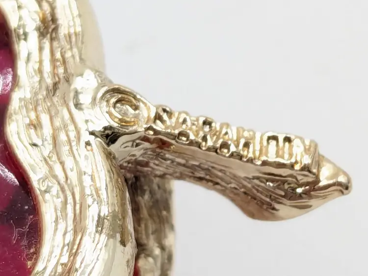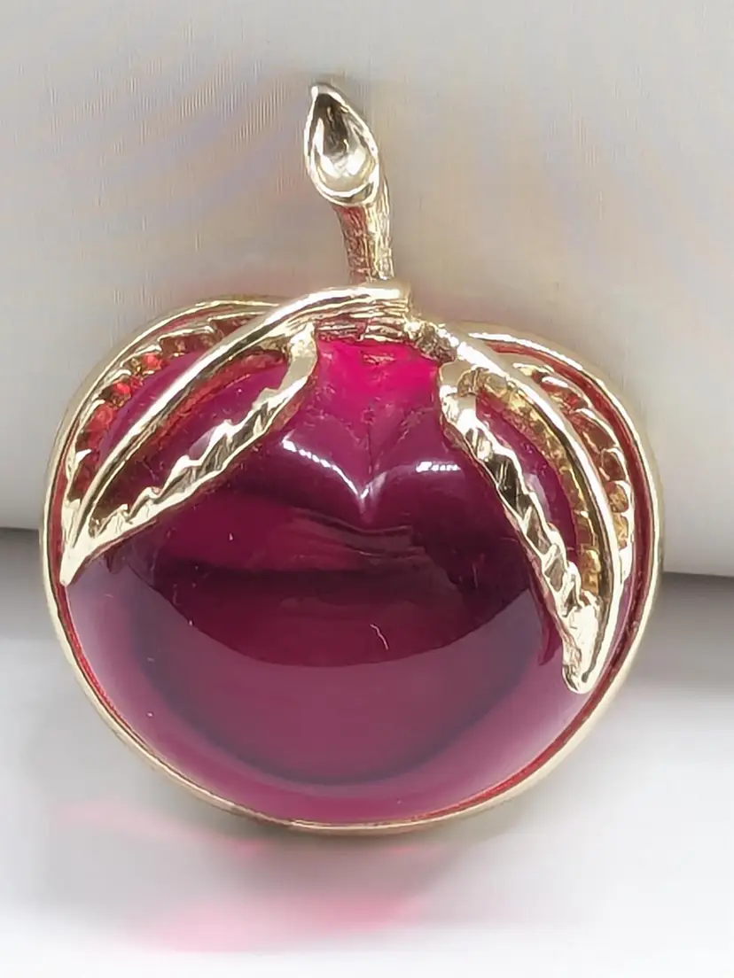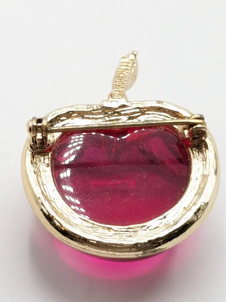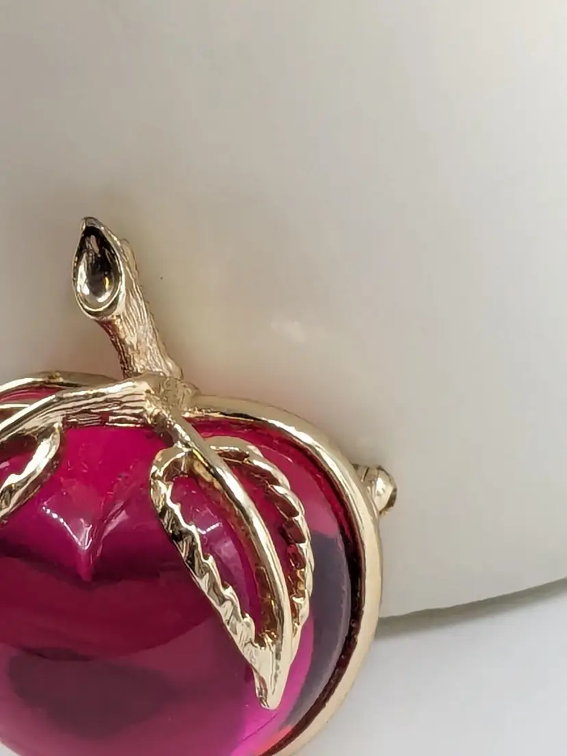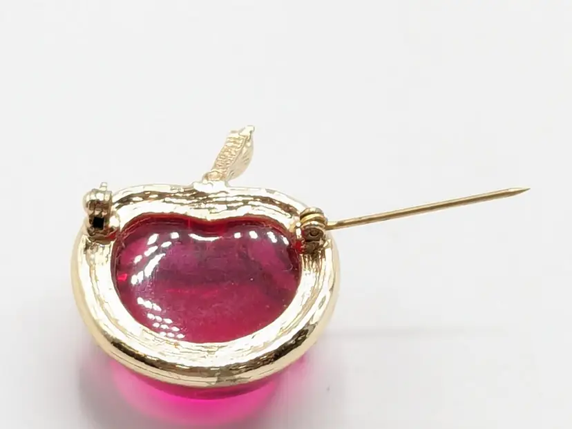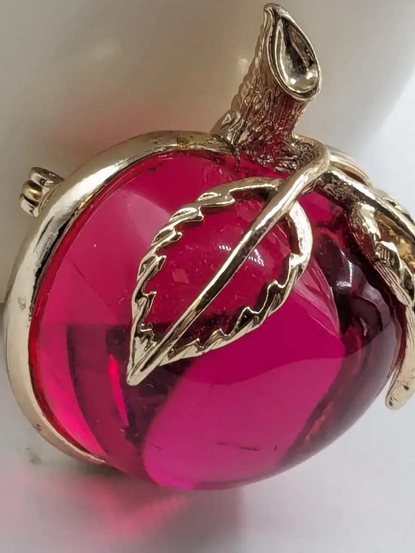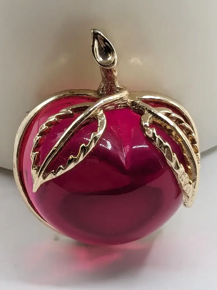 Good vintage condition. Light scratch on front of apple and some gold tone loss on bottom of apple. Signed Sarah Coventry. Measures 1 3/8" length and 1 1/8" wide.