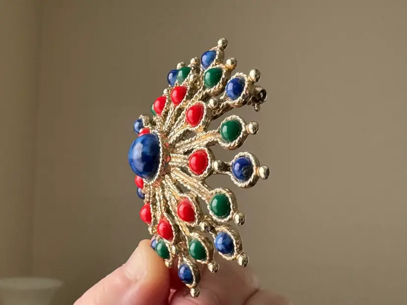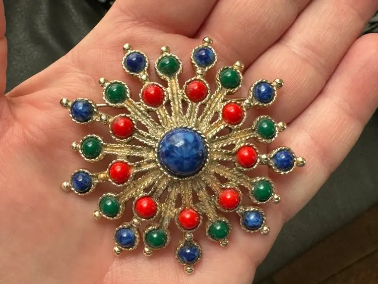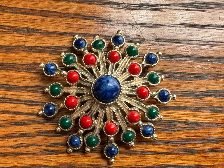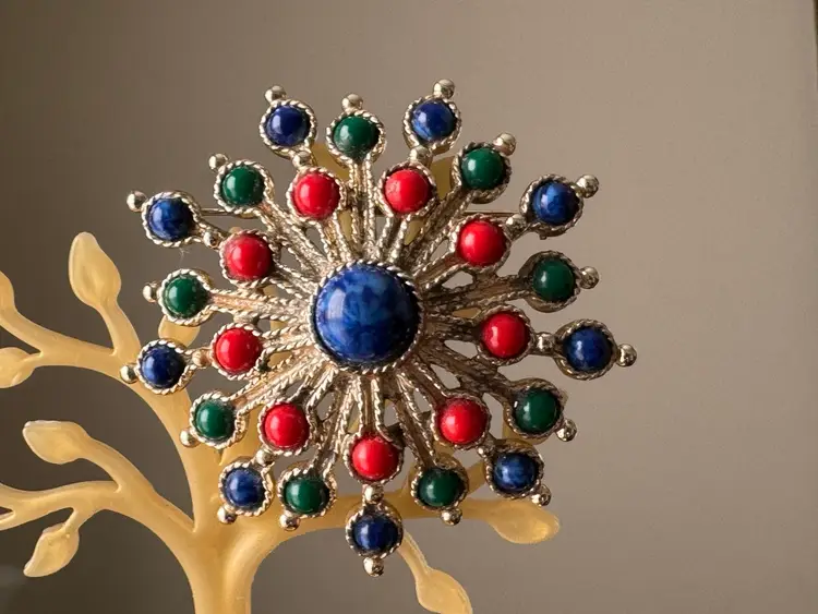 Vintage Sarah Coventry Carnival brooch, starburst blue red and green cabochon stones, costume jewelry