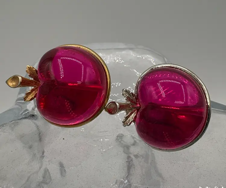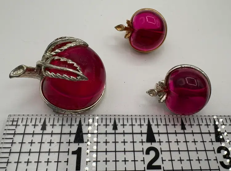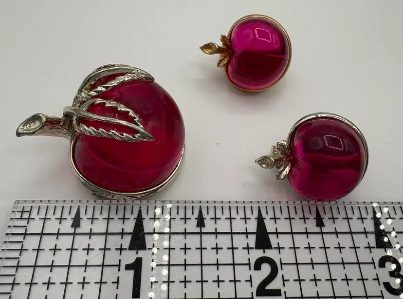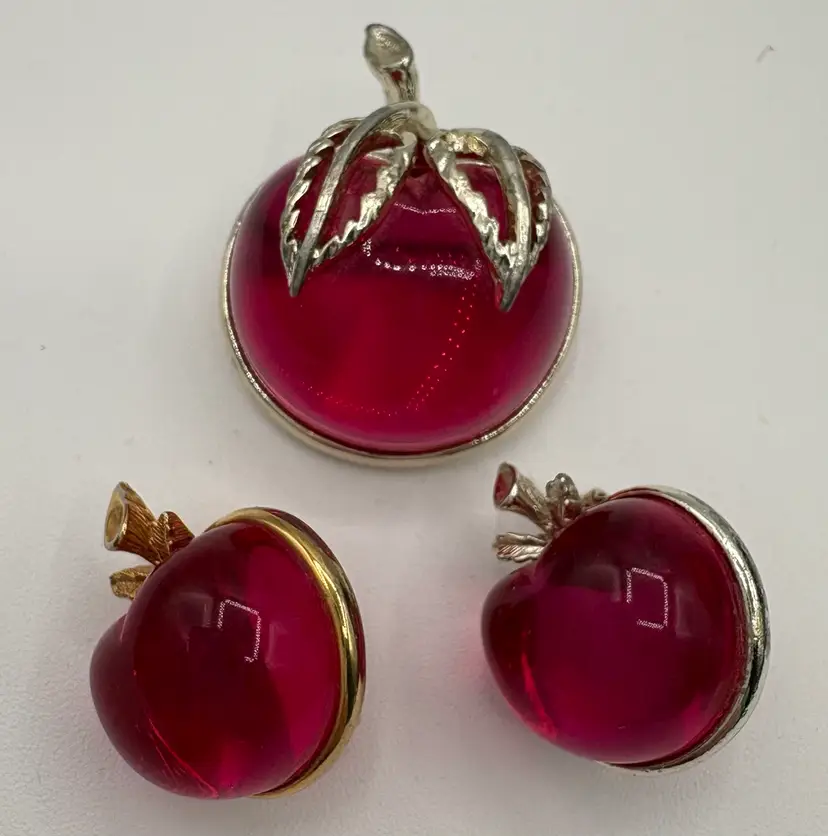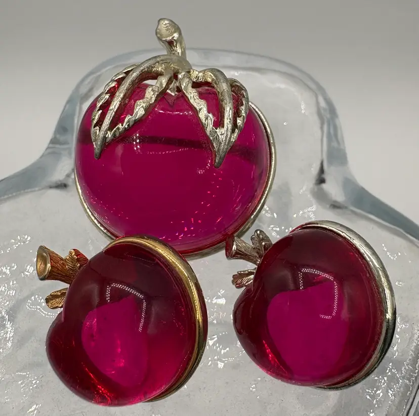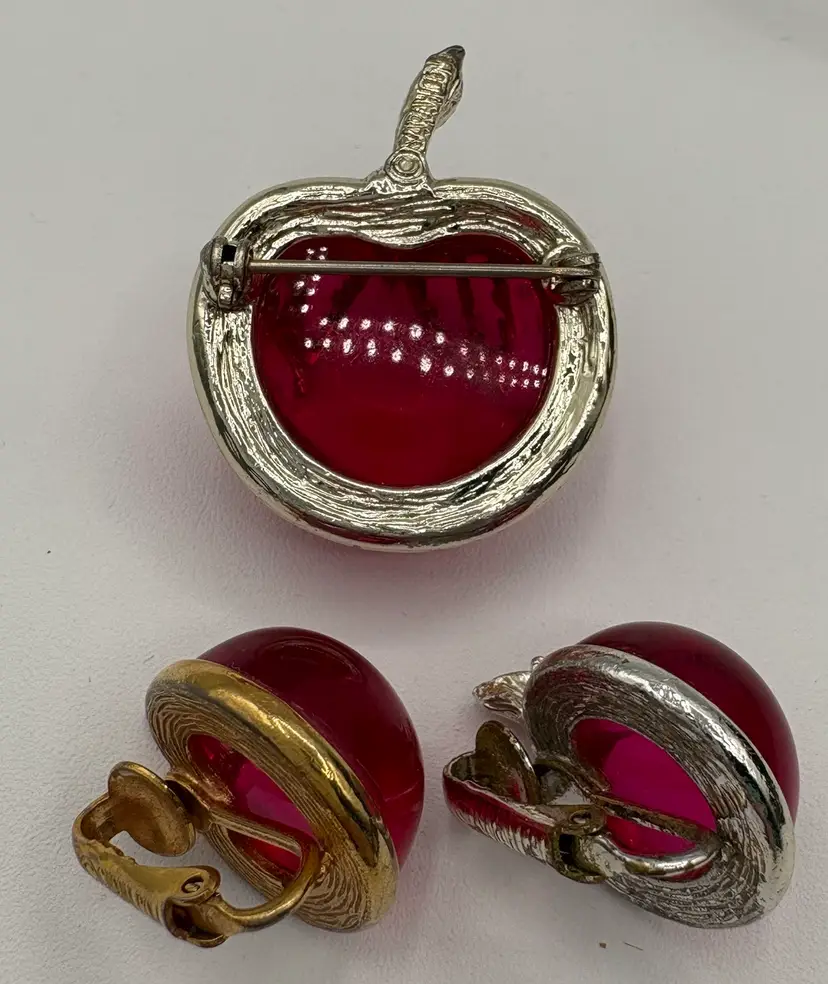 Cute jelly-belly style pin and clip-on earrings. Originally named “Burgundy” but the color is candy apple pink. The pin is 1 1/8”W x 1 3/8”H x 3/4”D. The earrings are 3/4”W x 7/8”H x 3/4”D. Nice condition, but please note that the pin and one earring are silver tone and the other earring is gold tone. Marked “Sarah Cov” on the bottoms.
