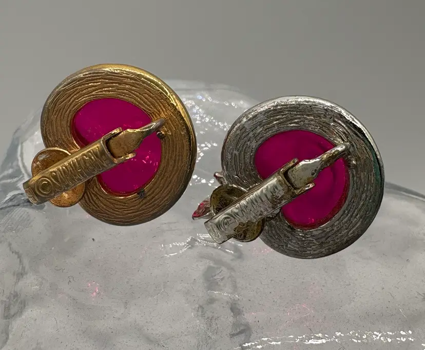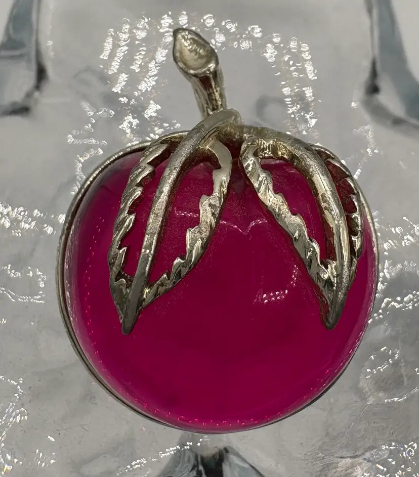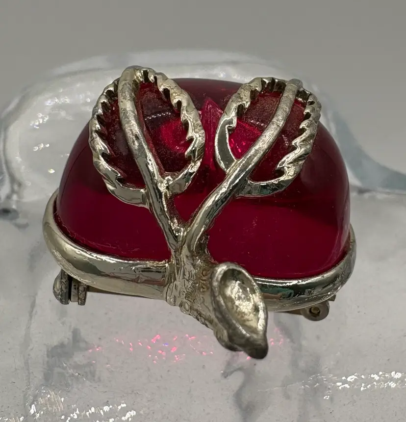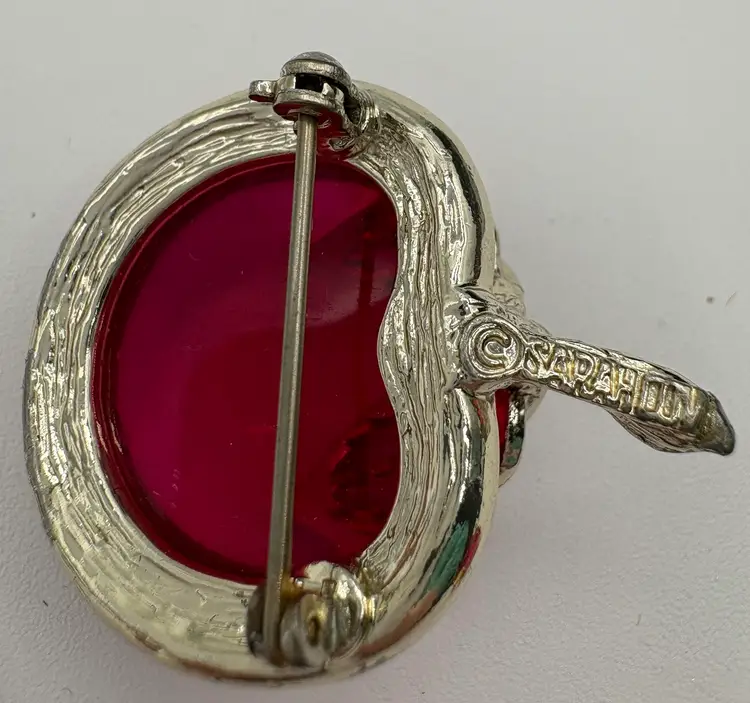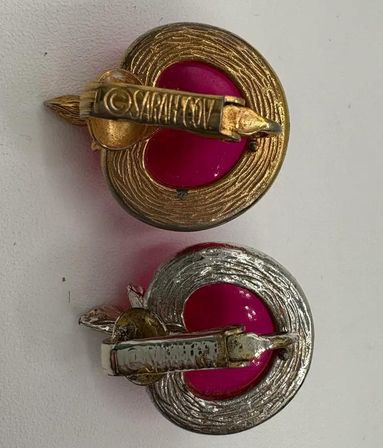 Cute jelly-belly style pin and clip-on earrings. Originally named “Burgundy” but the color is candy apple pink. The pin is 1 1/8”W x 1 3/8”H x 3/4”D. The earrings are 3/4”W x 7/8”H x 3/4”D. Nice condition, but please note that the pin and one earring are silver tone and the other earring is gold tone. Marked “Sarah Cov” on the bottoms.