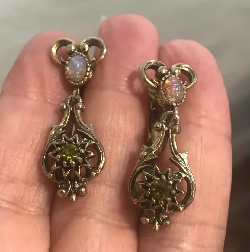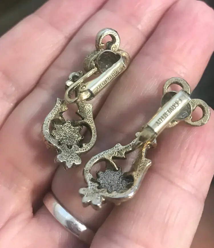 These gold tone dangle earrings by Sarah Cov are labeled Contessa and hail from the 1970’s. The top stone is a faux Opal, the bottom is a green rhinestone. They measure about an inch and a half long.