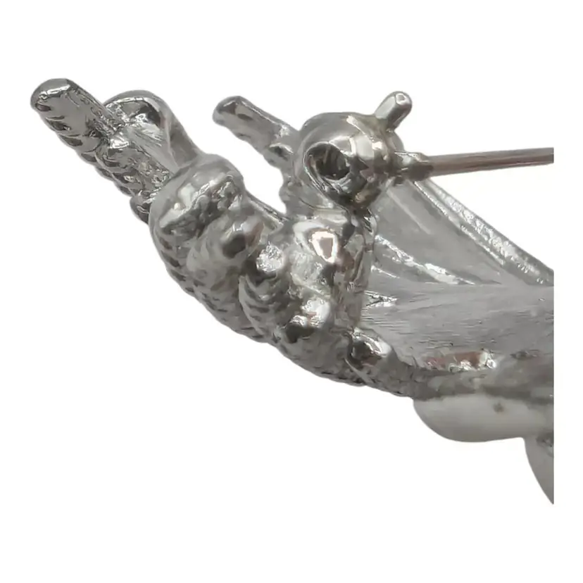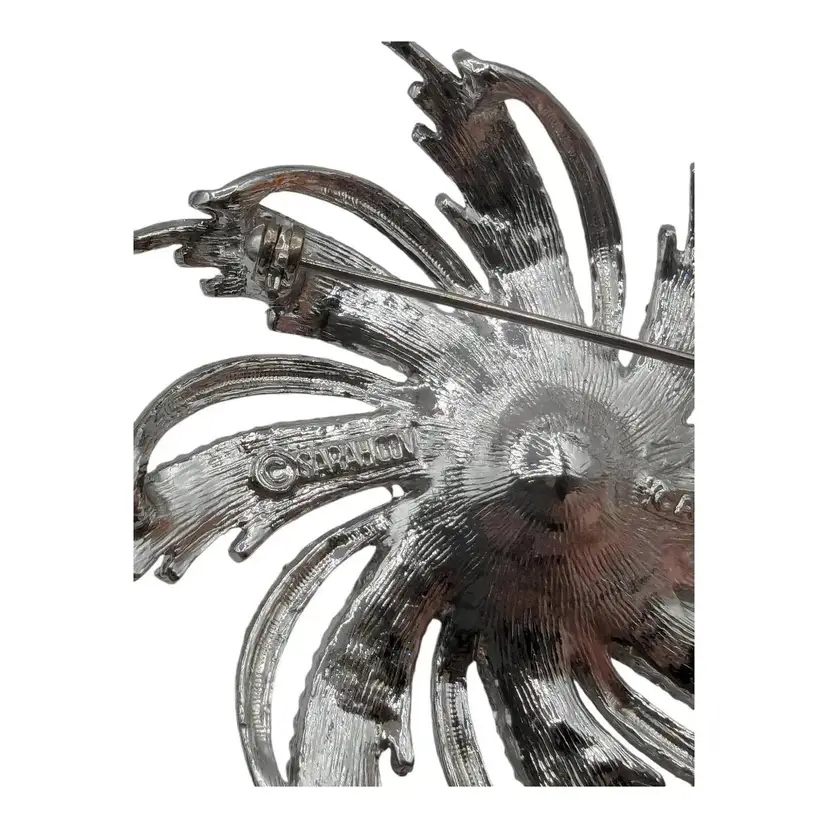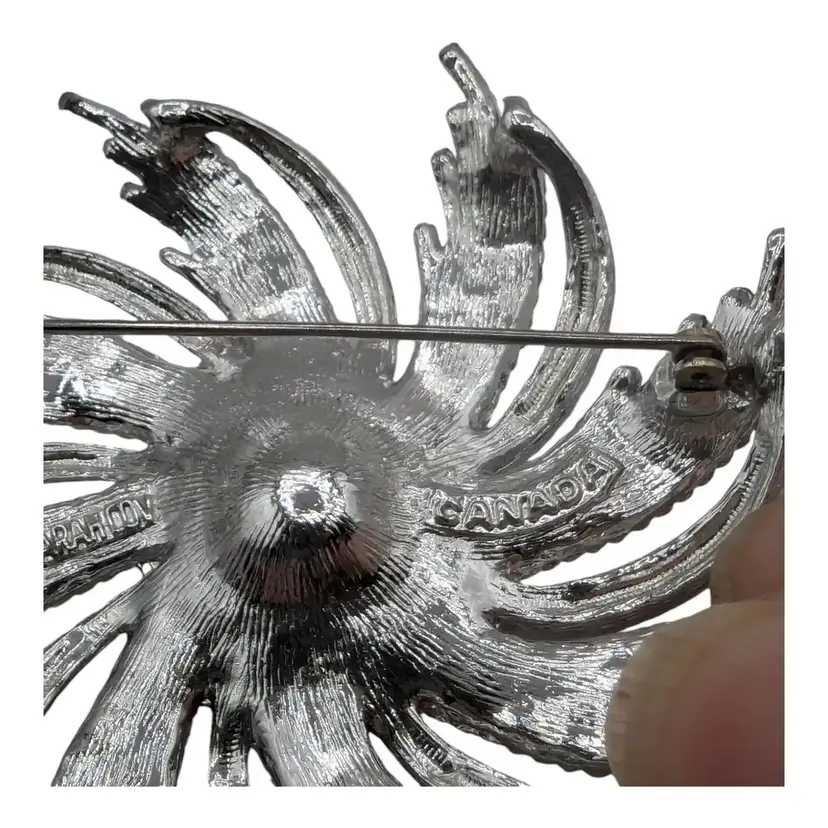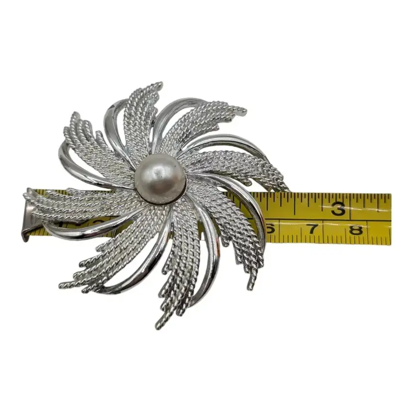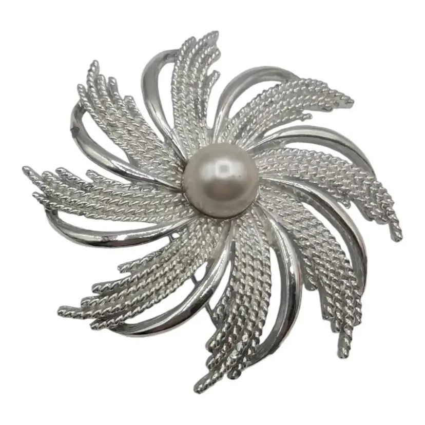A charming vintage Sarah Coventry flower brooch , featuring a pinwheel swirl design with a rope texture and a faux pearl center. The silver-tone metal and white pearl create an elegant accessory for any outfit.