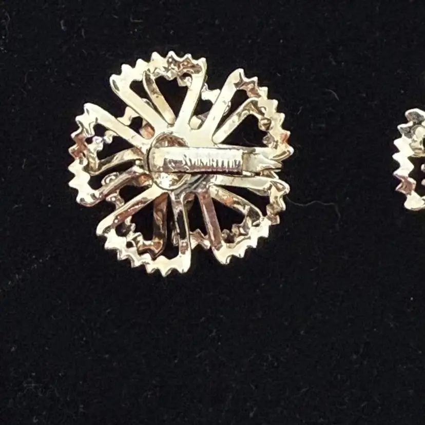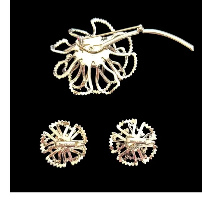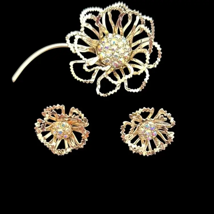 Beautiful Gold Tone Sarah Coventry Large Flower Outline AB Rhinestone Brooch with matching Clip Earrings. In excellent condition. Minimal sign of wear No missing stones.