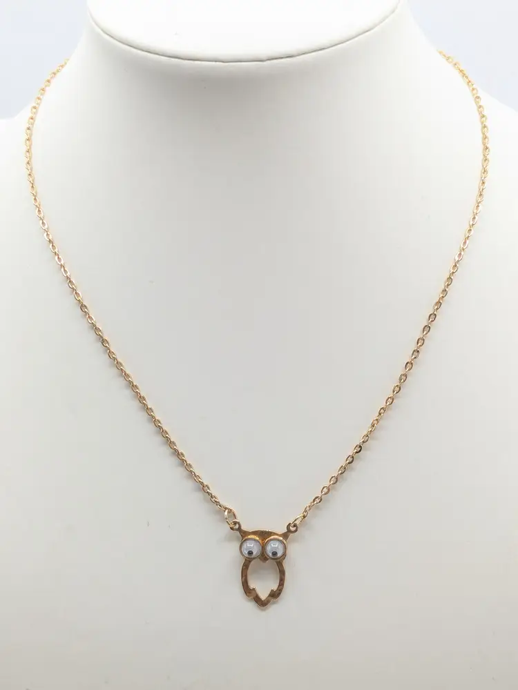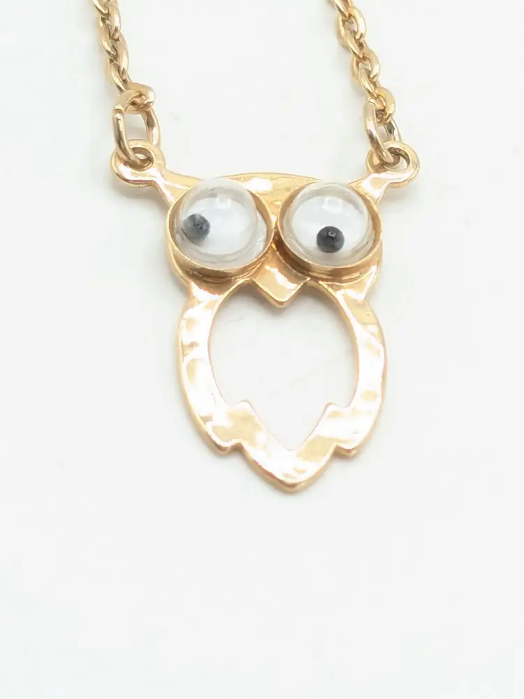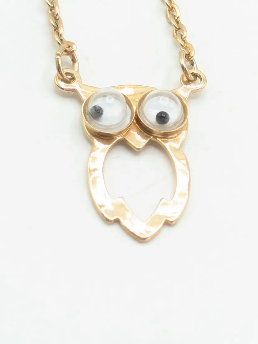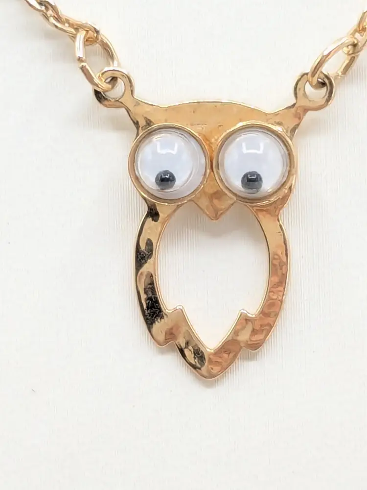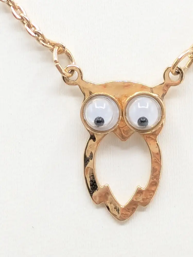 C'mon everyone needs a googly eyed owl necklace. Good condition. Child's necklace. Gold tone is bright and shiny with no color loss. Eyes move. Clasp is marked SC for Sarah Coventry. Circa 1970's. Chain measures 14". Pendant owl measures 3/4" in length and 3/8" wide. EN3