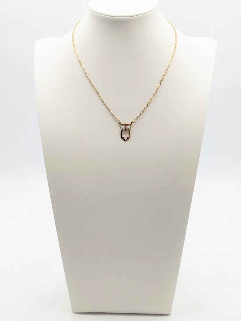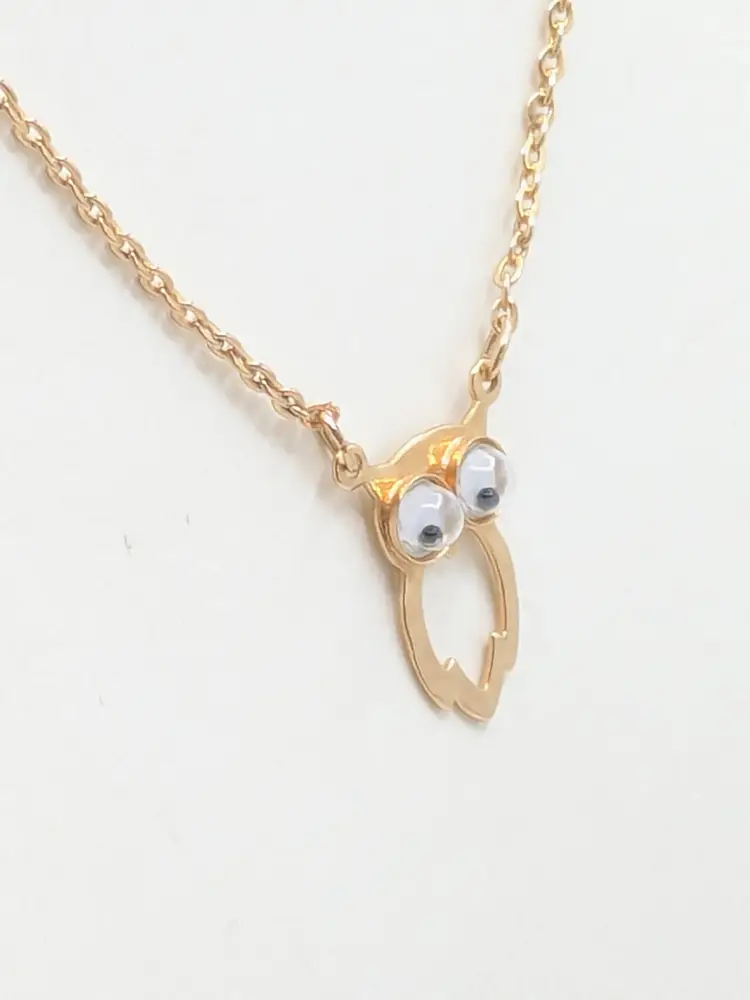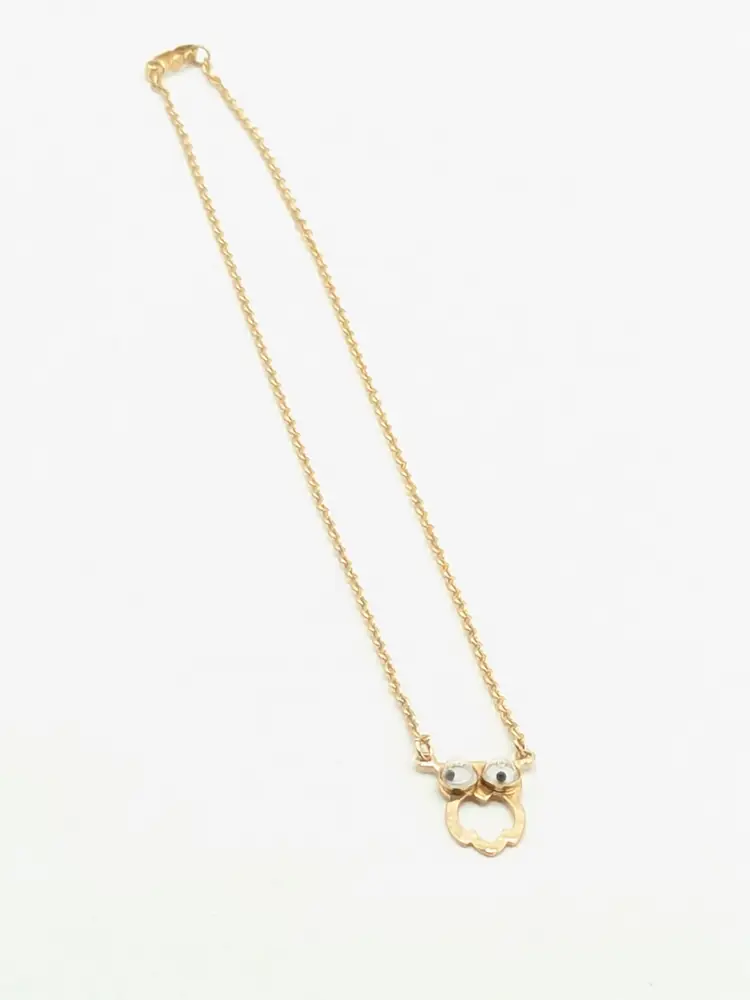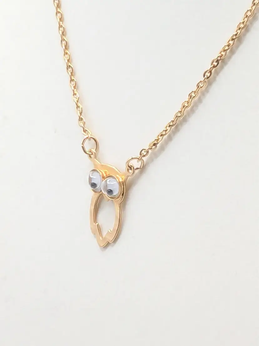 C'mon everyone needs a googly eyed owl necklace. Good condition. Child's necklace. Gold tone is bright and shiny with no color loss. Eyes move. Clasp is marked SC for Sarah Coventry. Circa 1970's. Chain measures 14". Pendant owl measures 3/4" in length and 3/8" wide. EN3