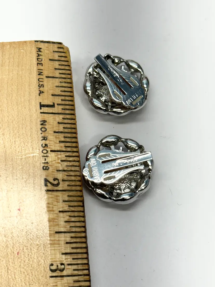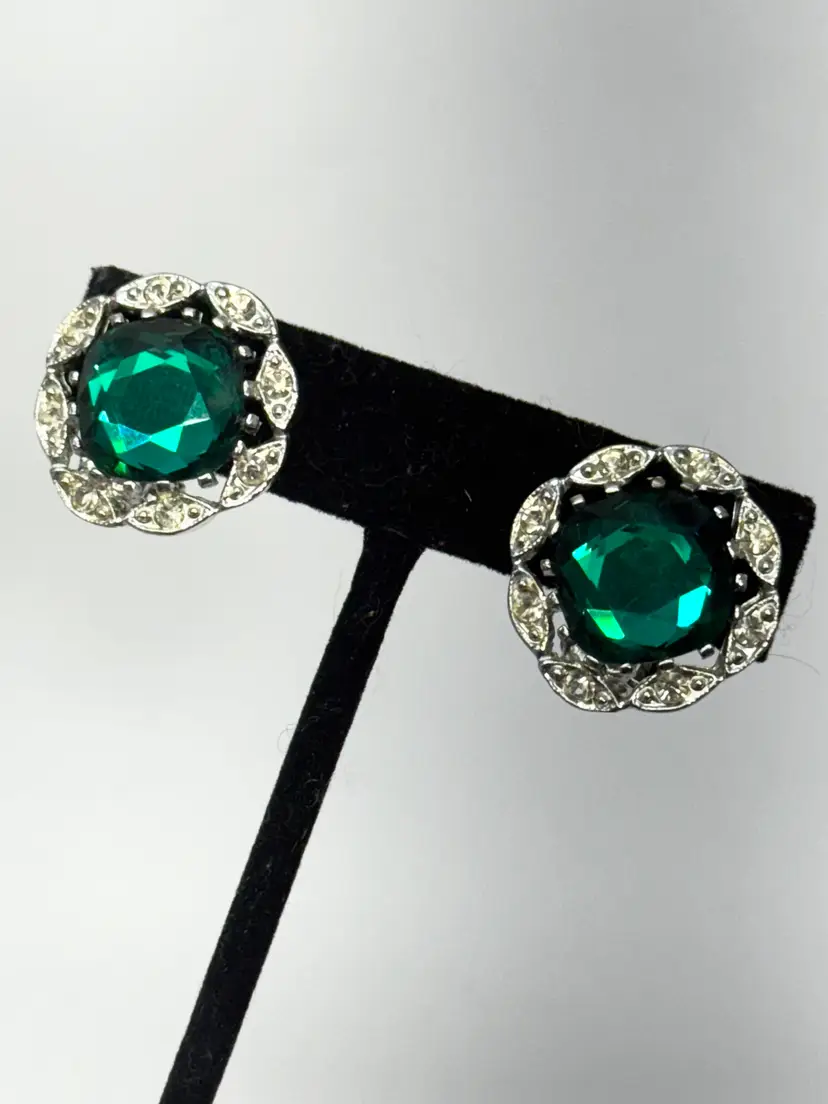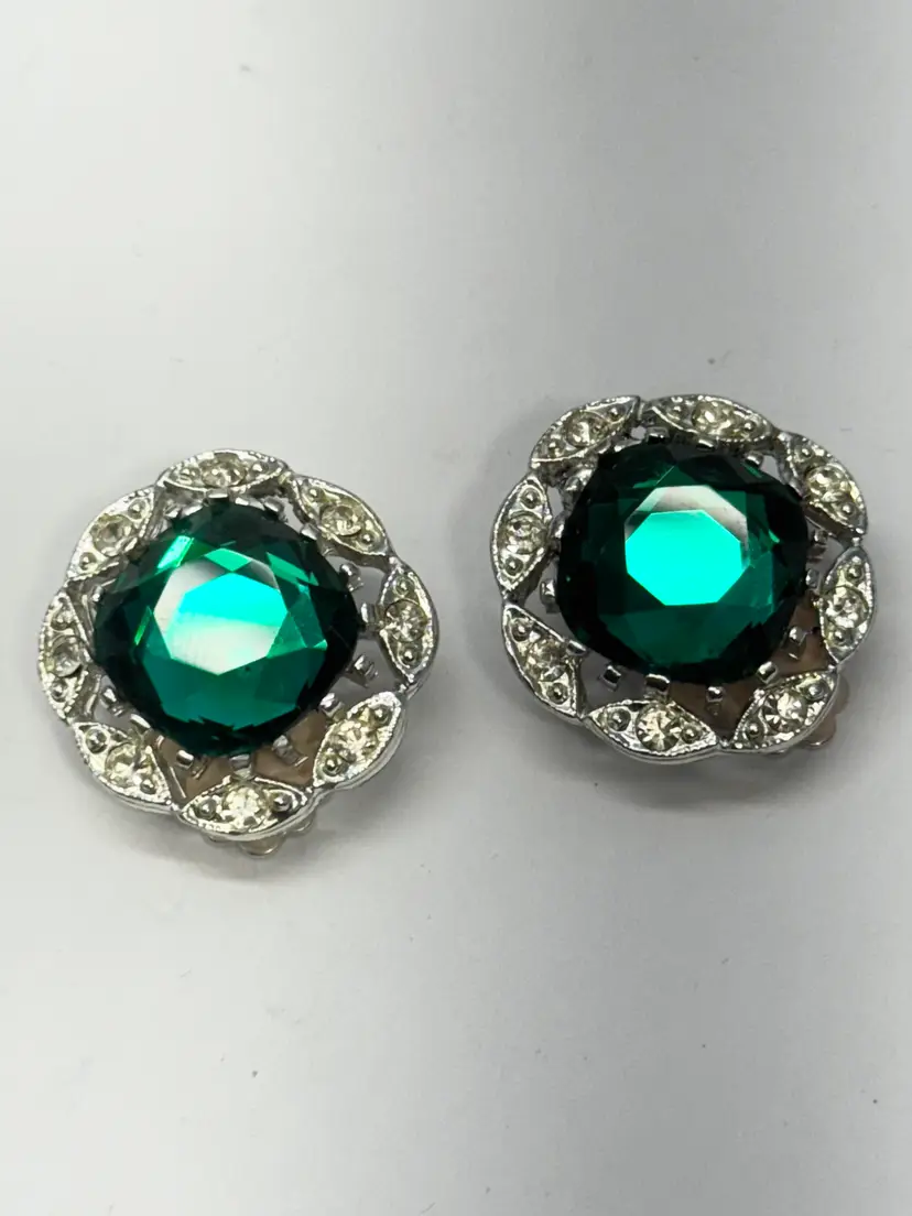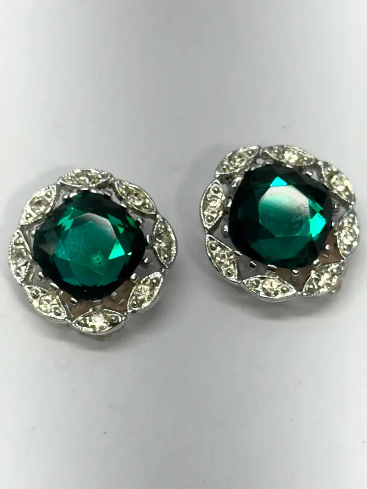 Vintage Sarah Coventry green glass rhinestone clip on earrings. Signed on back. Green glass large rhinestones with clear rhinestones. Vintage clip on earrings. MN55TH.