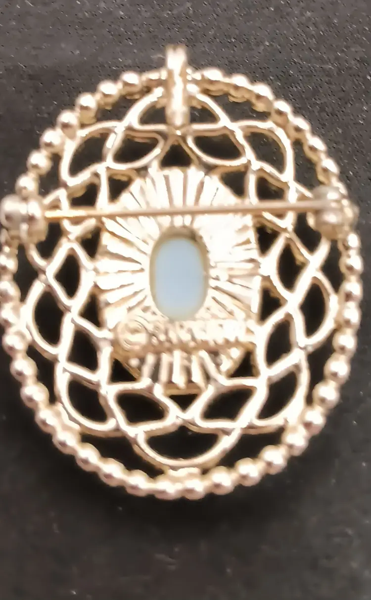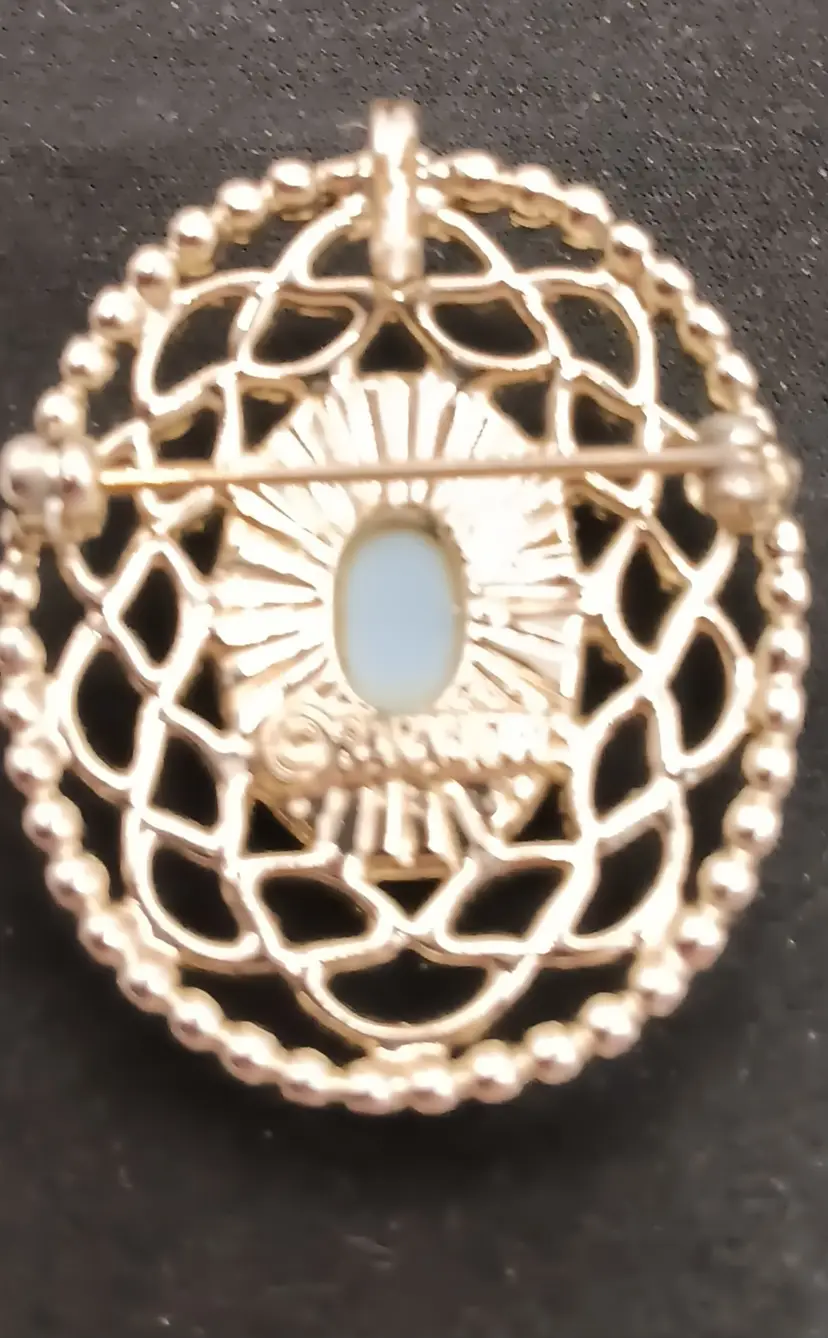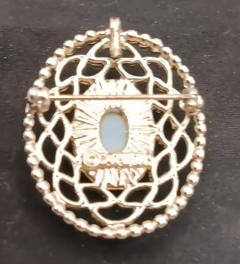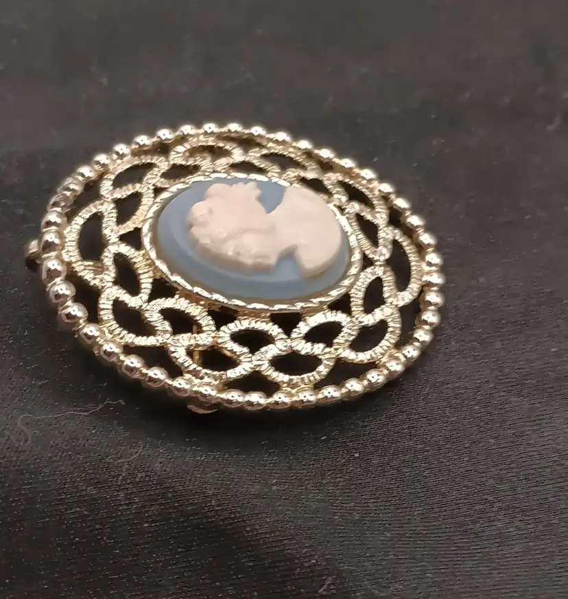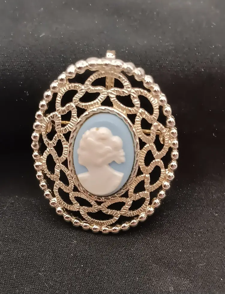 Elevate your vintage jewelry collection with the elegant Sarah Coventry pale blue cameo pendant/brooch. This exquisite piece showcases an oval shape that exudes timeless charm, featuring a stunning blue main stone that captures the essence of a bygone era. Crafted with a silver tone finish, it adds a touch of sophistication to any outfit, whether pinned to a lapel, scarf, or necklace.