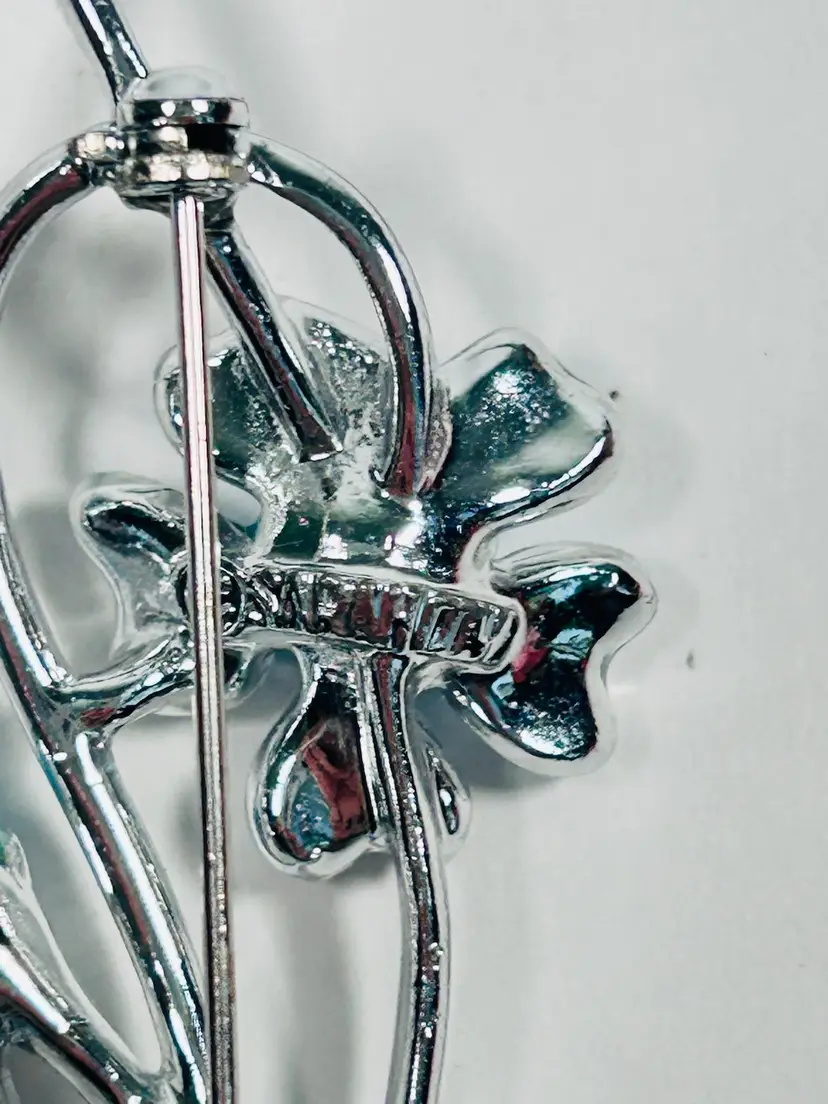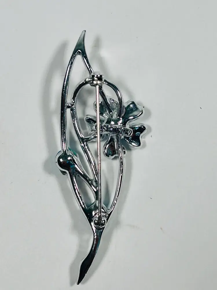 The brooch is 2.75" in length and has a channel-set setting style. The main stone is a blue tourmaline/indicolite with excellent cut grade and eye-clean clarity. The brooch is signed by the designer and is an original piece from the 1950s-1980s era. The jewelry department is fashion, and the brooch is perfect for women. The item is made of metal and acrylic materials, and the purity of the metal is unknown. The brooch is a beautiful representation of flowers and plants, and it will make a great addition to any collection.