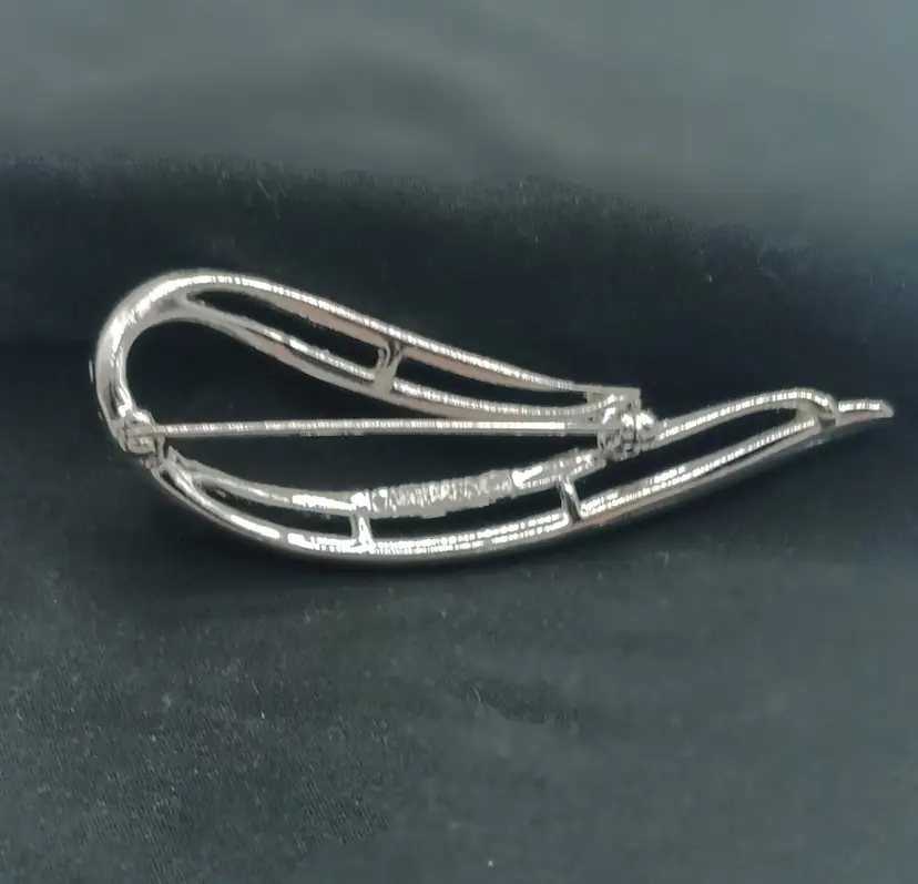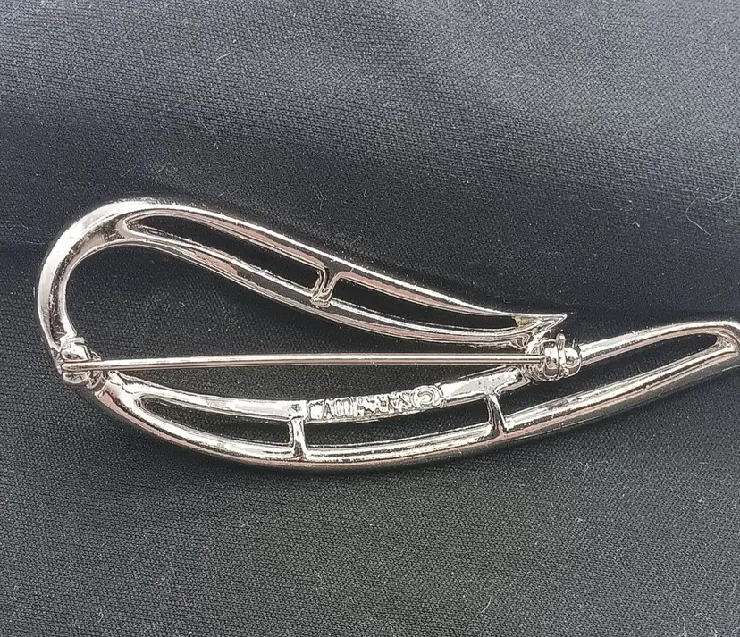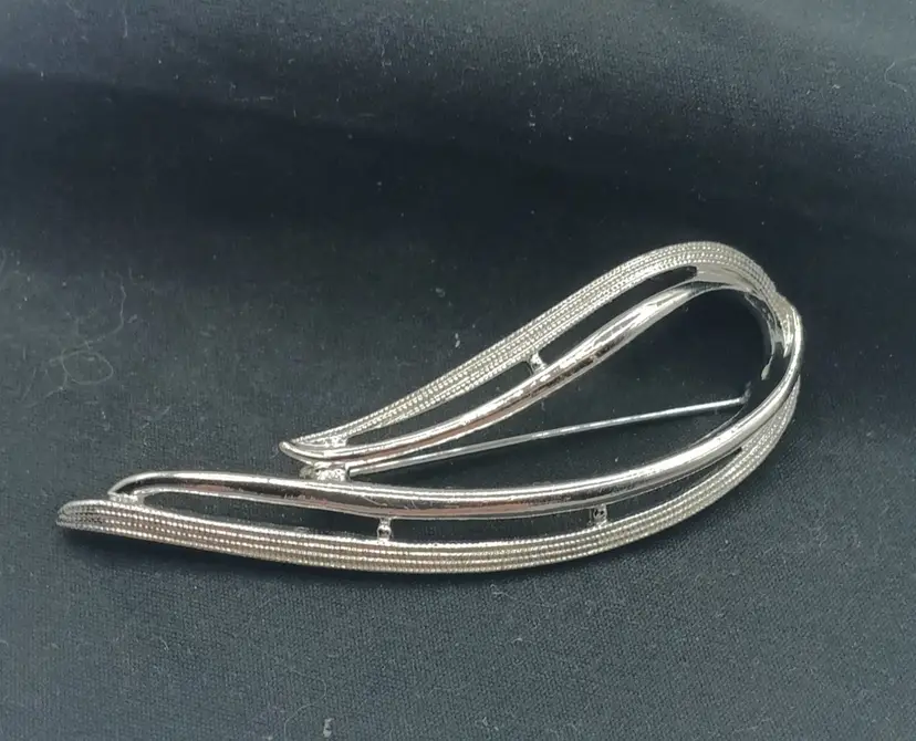 Elevate your accessory collection with the vintage Sarah Coventry silvertone brooch. The pin features a sophisticated, asymmetrical design that adds a touch of elegance to any outfit, making it ideal for an array of occasions from casual gatherings to more formal events. 2.75 in.