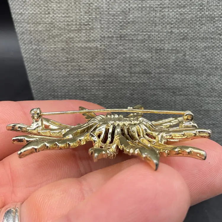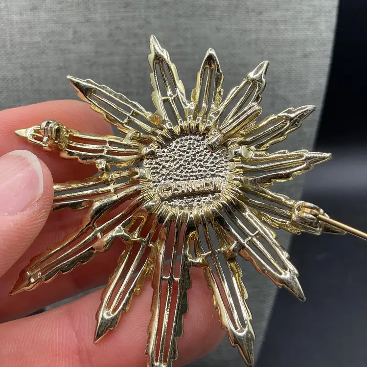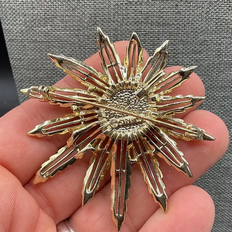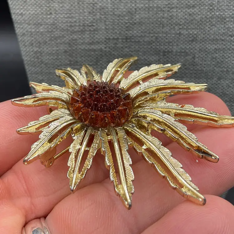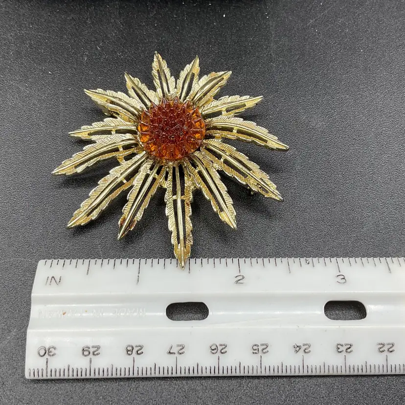 Vintage signed Sarah Coventry sunburst sunflower celluloid and metal brooch with roll barrel closure no missing stones