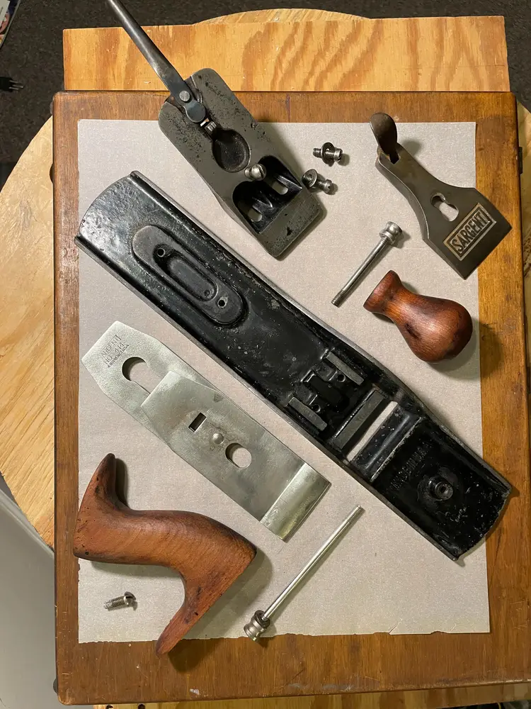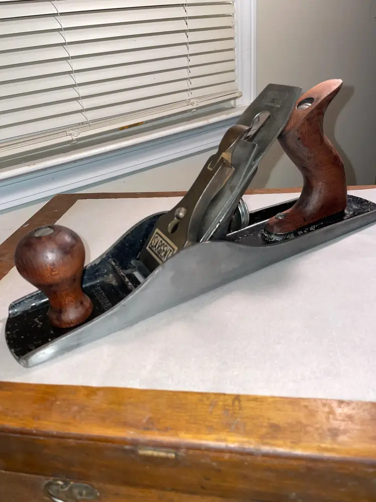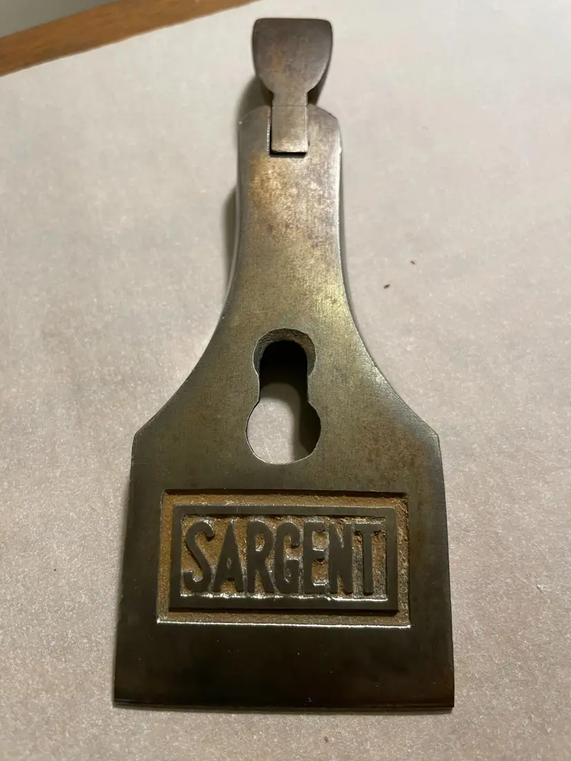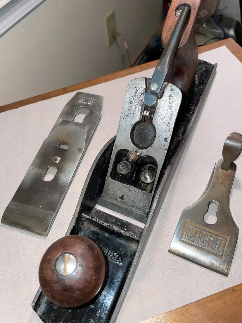 Has features of a Sargent series 400 Type 6 (1942-50) hand plane, in excellent used condition with all parts functioning as designed. The tote and knob are in good condition, no cracks, attaches snuggly to the body. Plane has been disassembled and subjected to light cleaning with some blemishes and scratches on the body, frog and blade assembly.