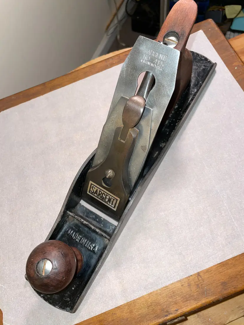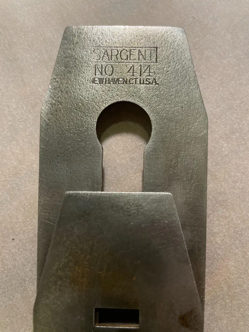 Plane body is 14" long x 2 5/8" wide with 'Made in USA' marking just behind the knob (comparable to a Stanley No. 5). Lever cap with 'Sargent' casted in recess Frog with 409 engraving, has 2-piece yoke, lateral adjuster having bent type disc and folded finger end Plated steel adjuster, 1 1/4 inch and hardwood knob and tote with plated steel bolt/nuts fit snuggly to the base 'SARGENT NO. 414 New Haven CT USA' etched into 7 1/4 iron