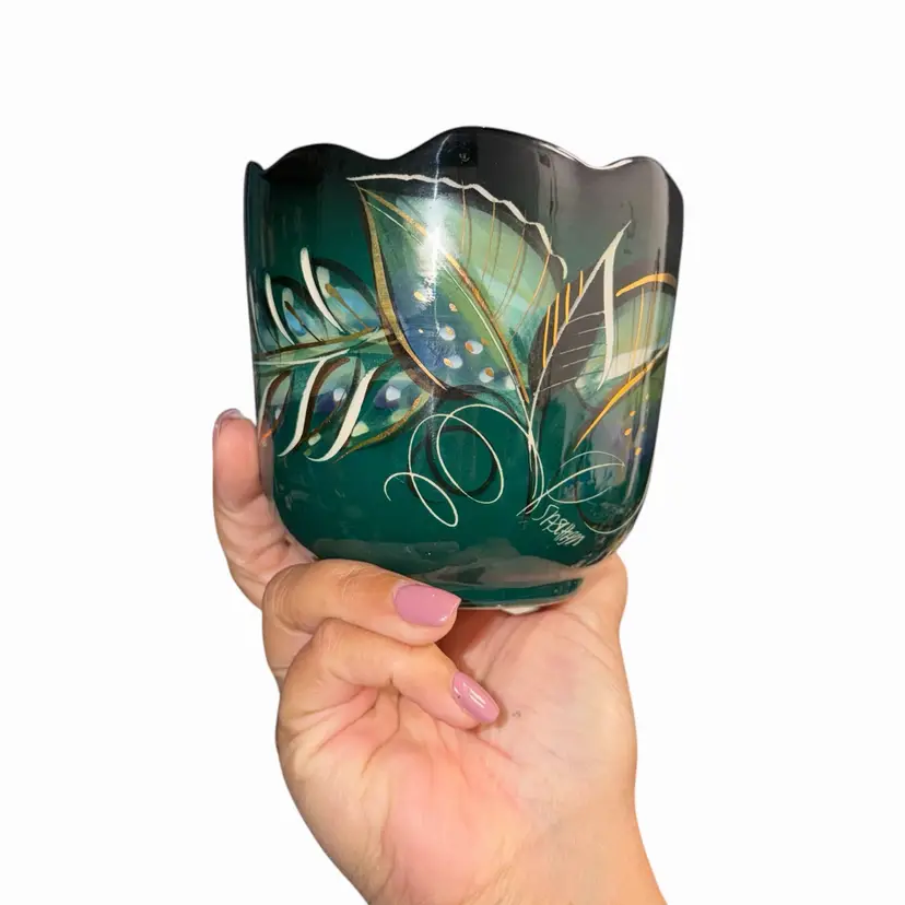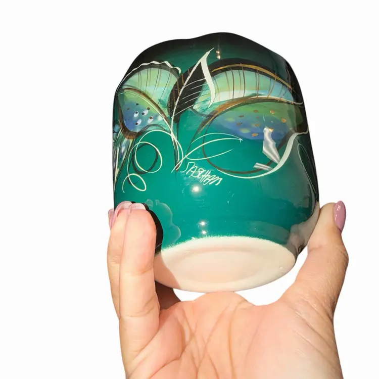 Beautiful vintage Sascha Brastoff hand-painted bowl or small vase featuring a rich green base with abstract leaf and atomic-style detailing in gold, white, and blue tones. A great example of mid-century modern design with that signature Brastoff decorative flair.