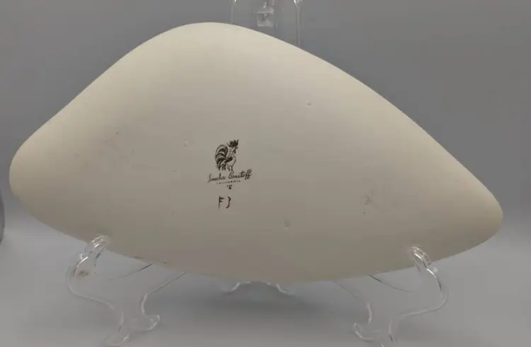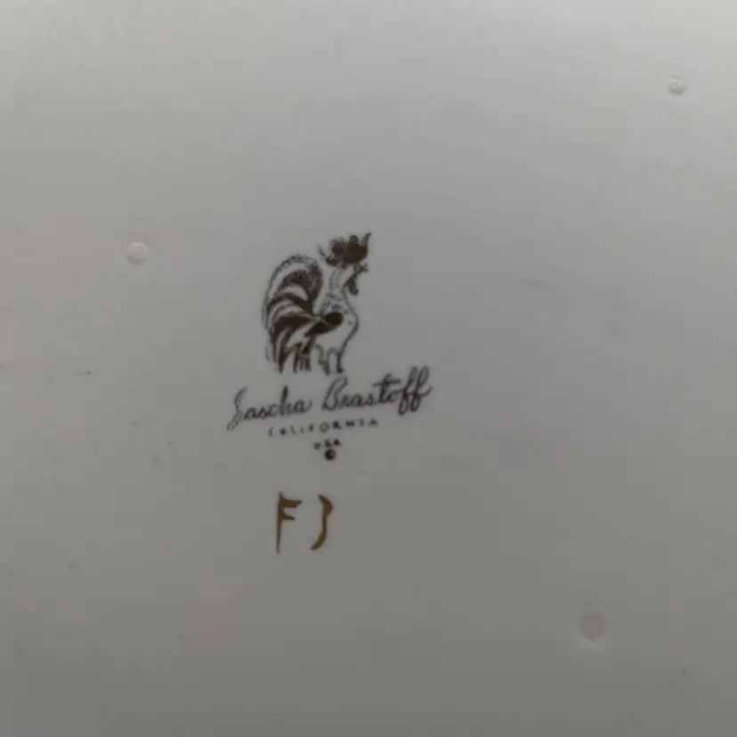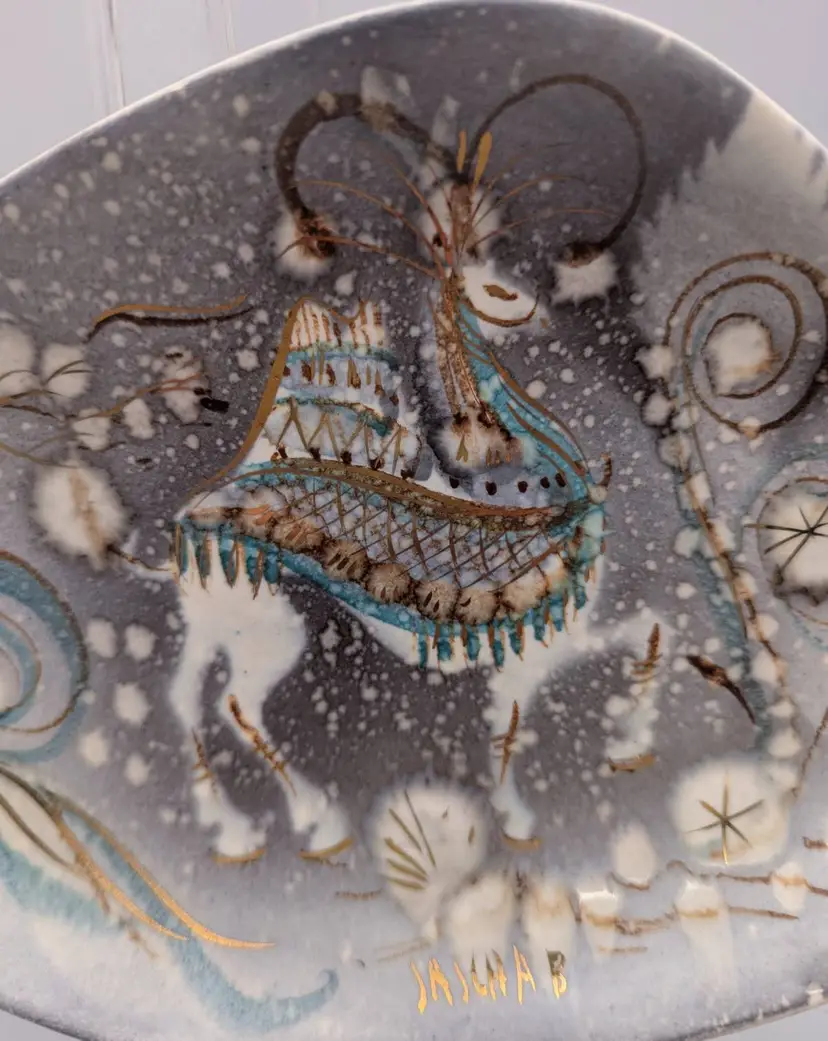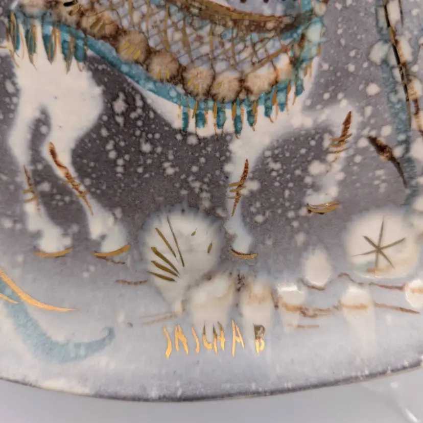 This is a Sascha Brastoff Vintage dish-Persian pattern- featuring a Stylized Camel. Measures: 9.75 inches x 5.25 inches Mid century Modern 1950's California Art Pottery It has a gray background with white spots, and features a camel- in blue, white ,green - all enhanced with gold accents- which is a signature of Sasha B designs. The bottom has the Rooster Symbol/Logo with a the handwritten design number F3 This piece truly has a watercolor feeling.