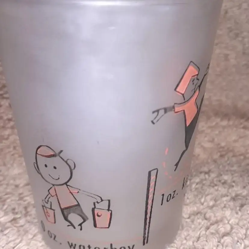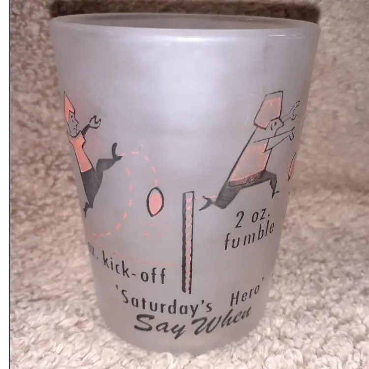 Vintage Anchor Hocking Saturday's Heroes say when shot glass. Cute 1950s retro barware frosted glass 0 oz Waterboy 1 oz Kickoff 2 oz Fumble 3 oz Stumble 4 ounces Benched! Nice black and reddish pink Football Graphics no chips cracks crazing Anchor Hocking Maker's Mark on bottom Rare design all items from a smoke-free home with pets experienced breakable shipper Perfect addition to your mid-century modern Don Draper wet bar