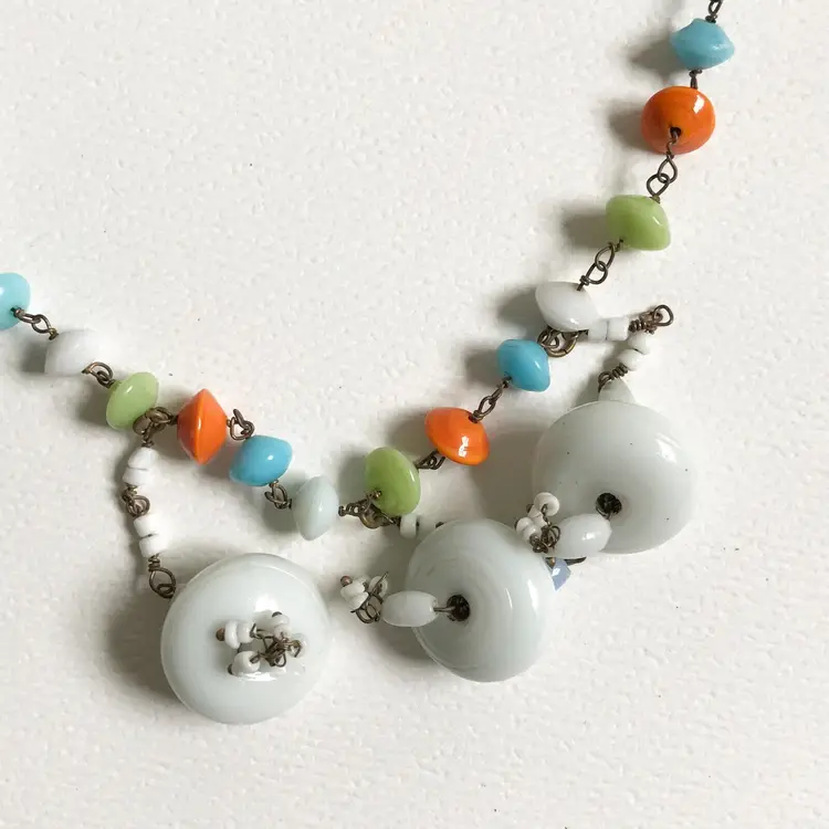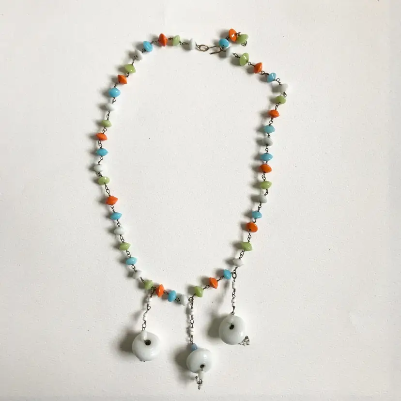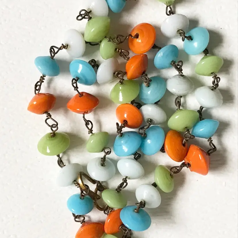 Features blue, white, green and orange glass beads, hook clasp and three larger dangles in the center of the necklace. There are metal links between each bead.
