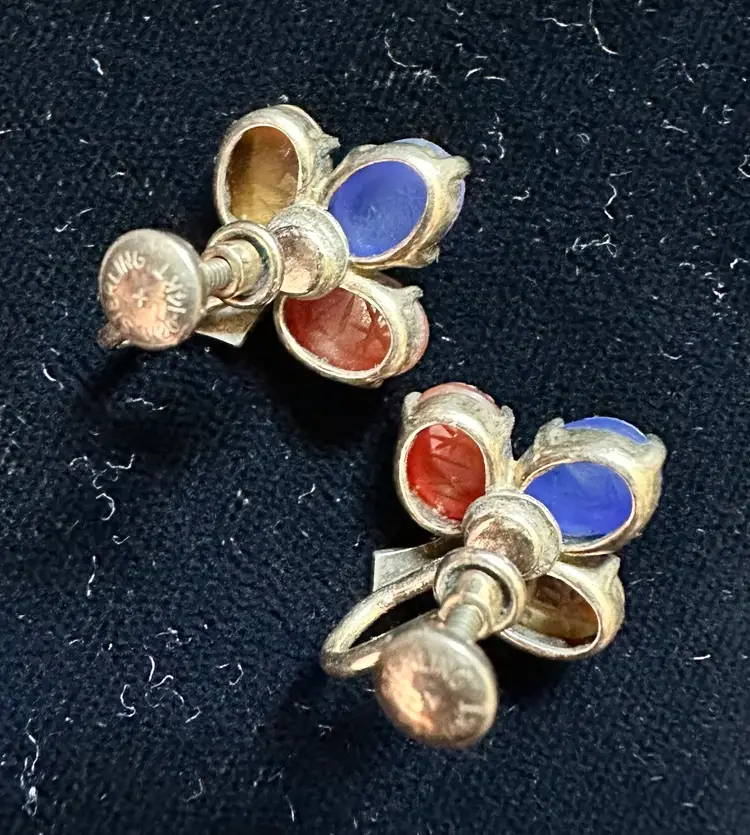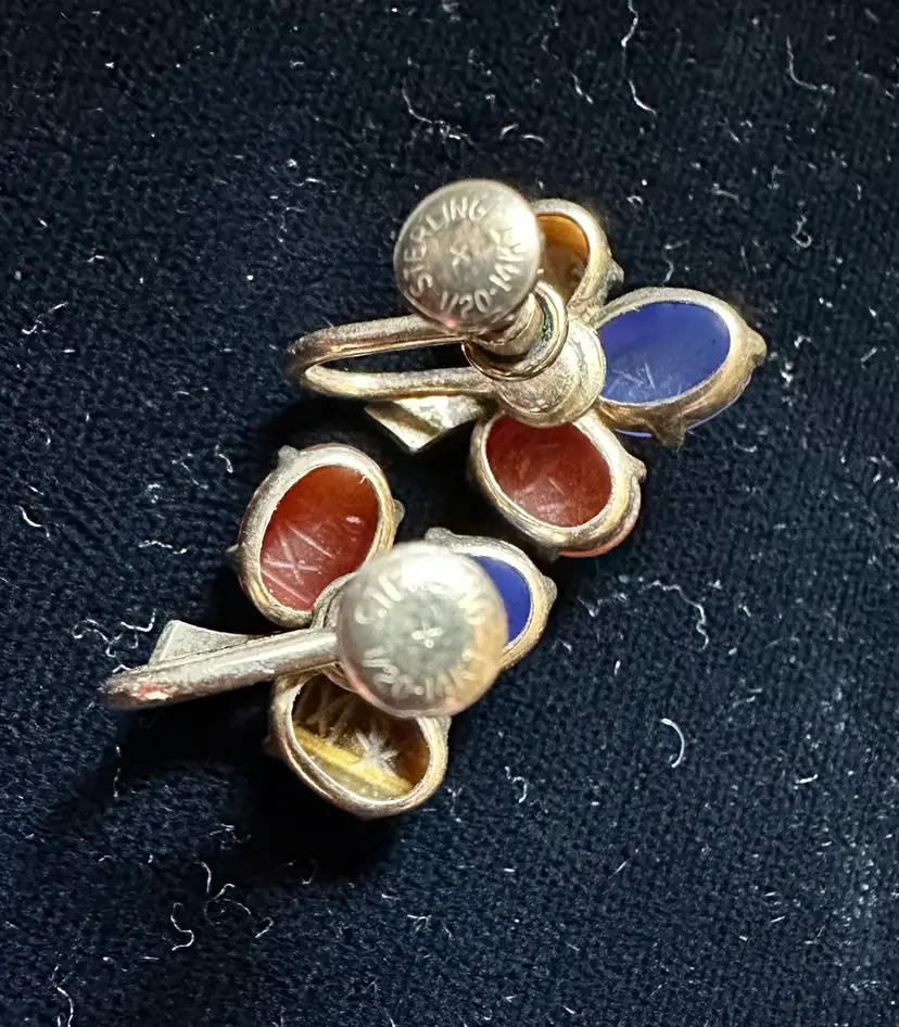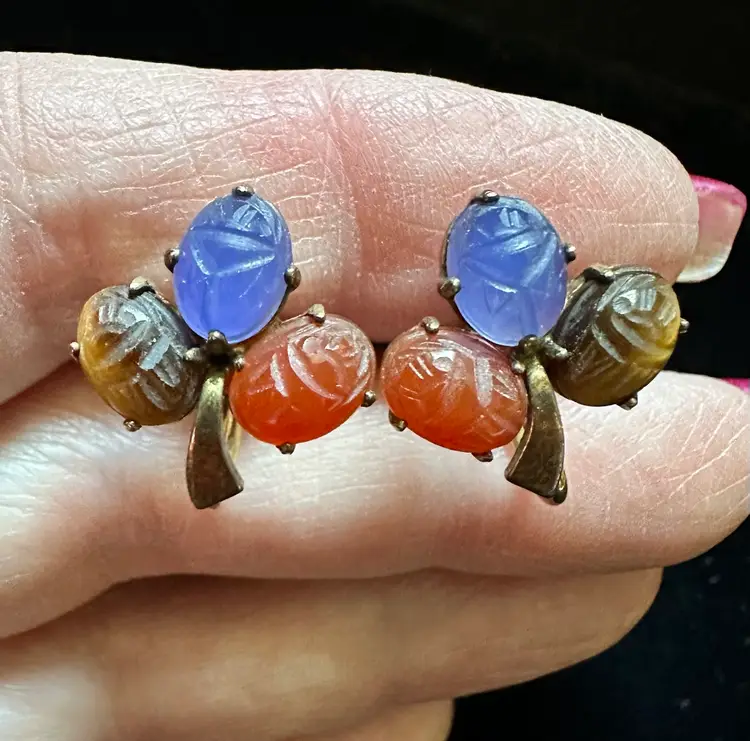 Pretty pair of 3 leaf clover scarab earrings. They are sterling w/ gold Wash set with carved semi precious stones. They measure 3/4”. Very good condition.