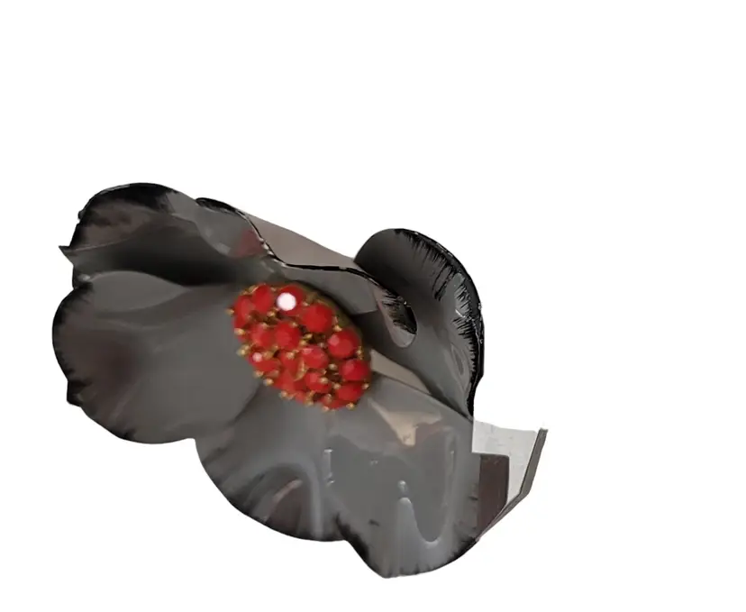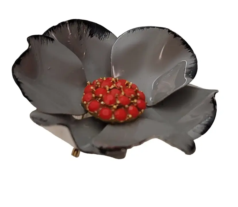 This Enamel Metal Flower Brooch is an adorable vintage piece of costume jewelry. It features a full-bloom three-dimensional flower that gives depth and a more realistic appeal. It is crafted in metal with appealingly gray enameled slightly bent petals with black accents along the edges giving a timeless appeal. The center of the flower is a domed-shaped embellished with scarlet red rhinestones, individually set on a gold tone base that depicts the stamen. It measures approximately 2.5 inches in diameter. The back features a secure locking pin that can be firmly attached to your clothing. A perfect accessory that can go with any outfit on any occasion.