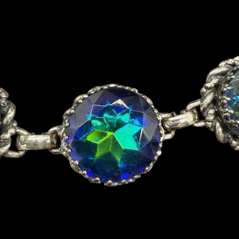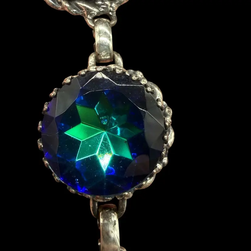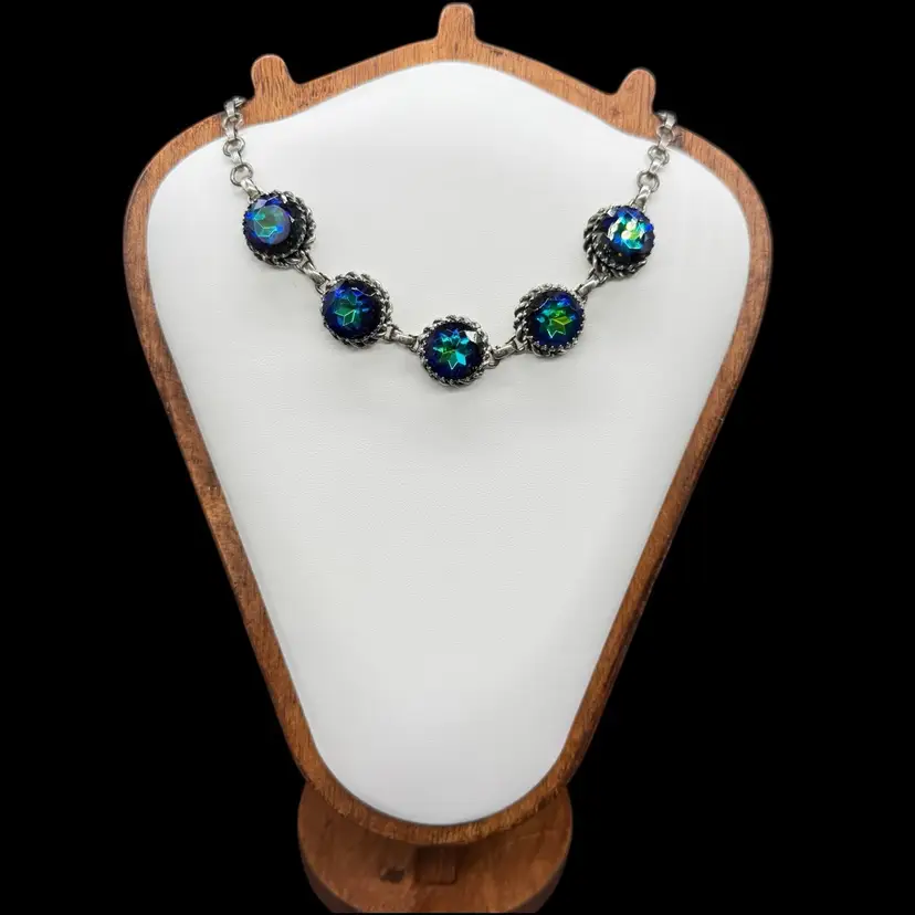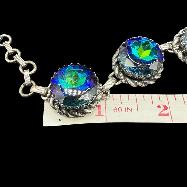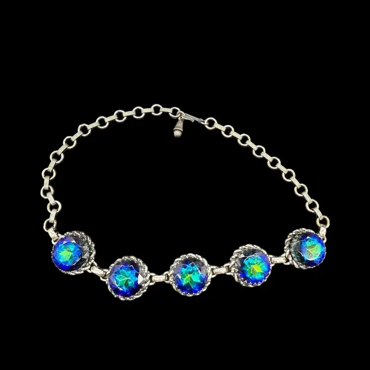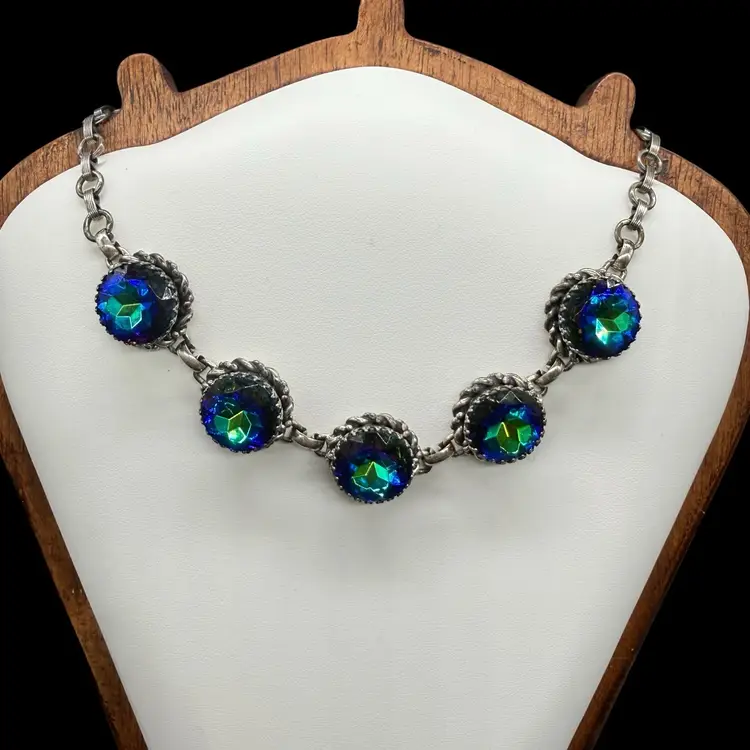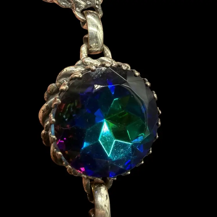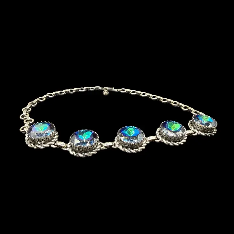 The Vintage Schiaparelli Peacock Rivoli Rhinestone Choker Necklace from the 1950s is a stunning piece of fashion jewelry featuring large multicolor glass rhinestones set in a metal base. The choker style necklace has a hook closure and measures 15.5 inches in length. This statement necklace exudes beauty and artistry, making it a sought-after collectible for vintage jewelry enthusiasts. Perfect for both men and women, this adjustable necklace captures the essence of the mid-century modern era with its unique design and eye-catching colors.