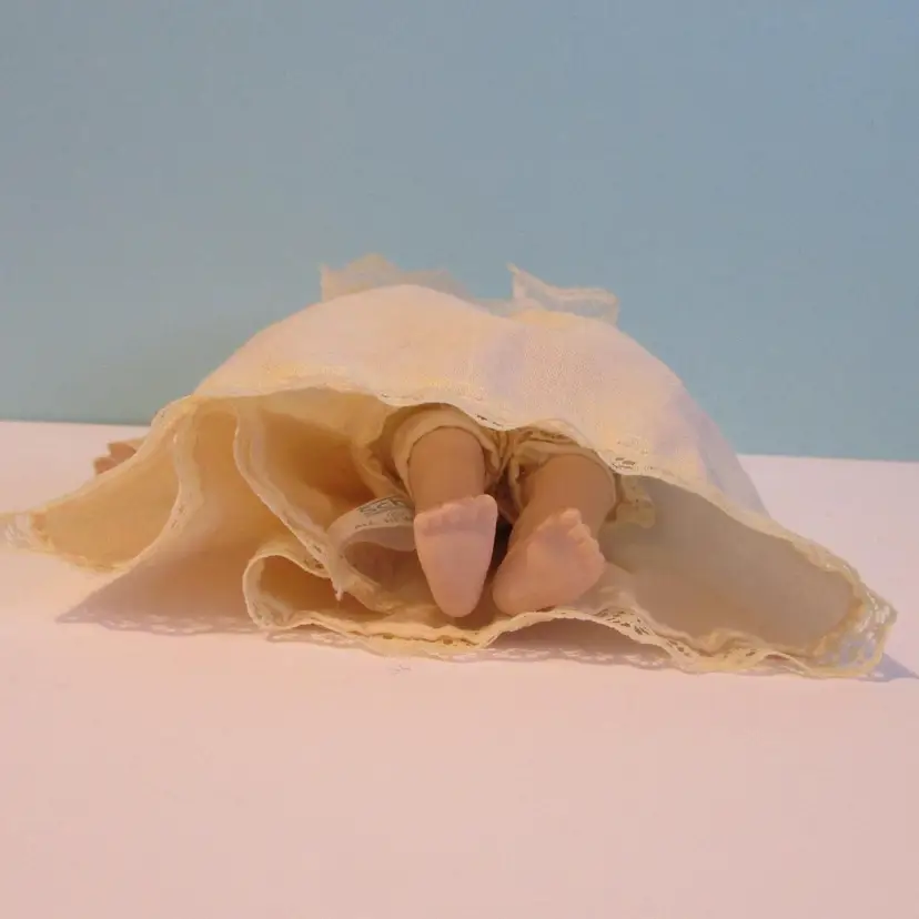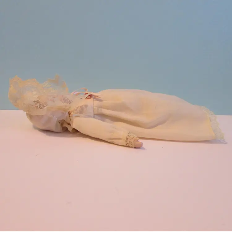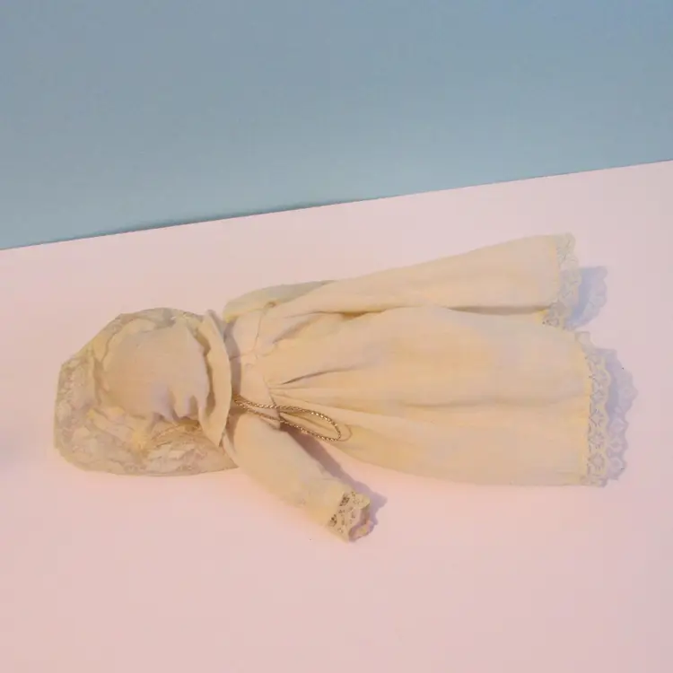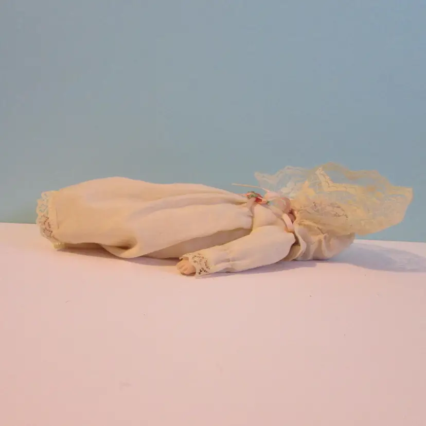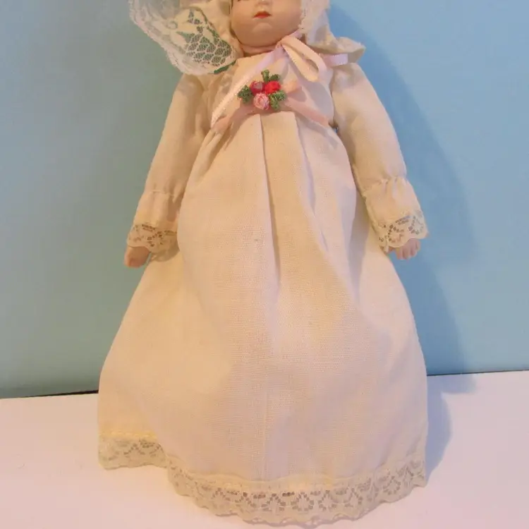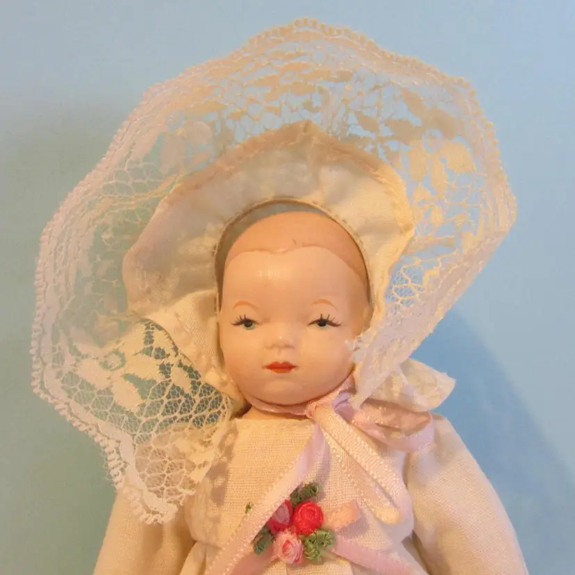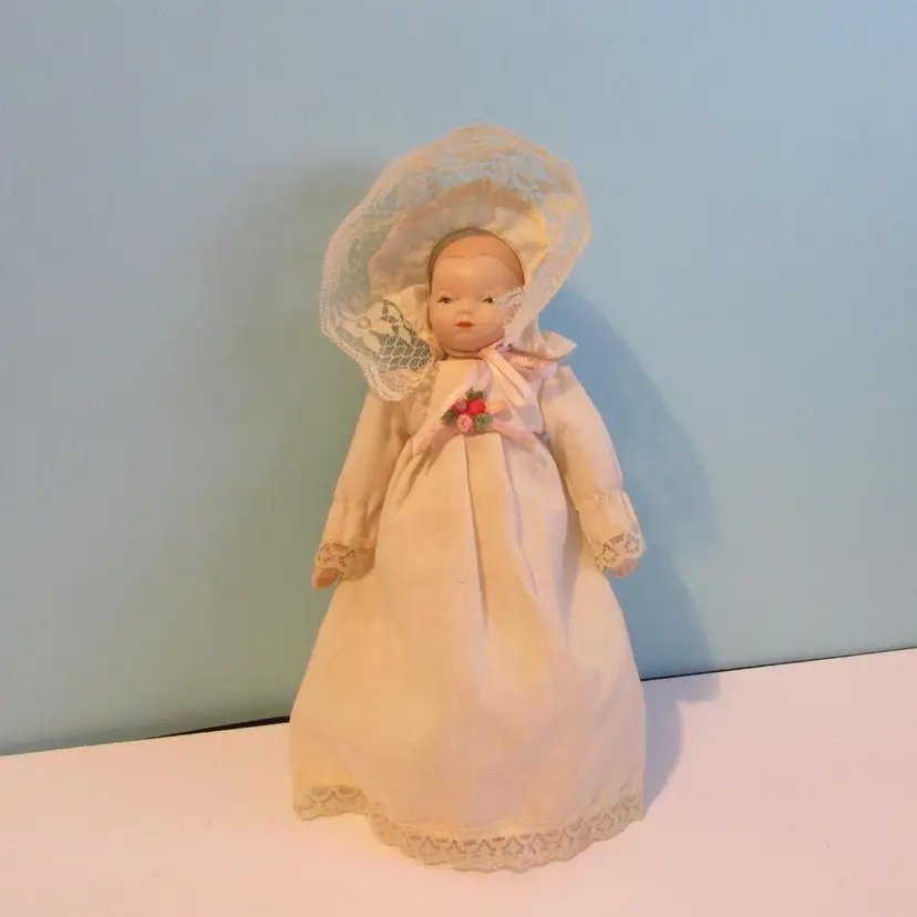 This lovely doll has some wear, but still a nice piece to display. She is about 8" or 9" long with the bonnet. This is shipped from a smoke free home. Thanks for looking! locub60
