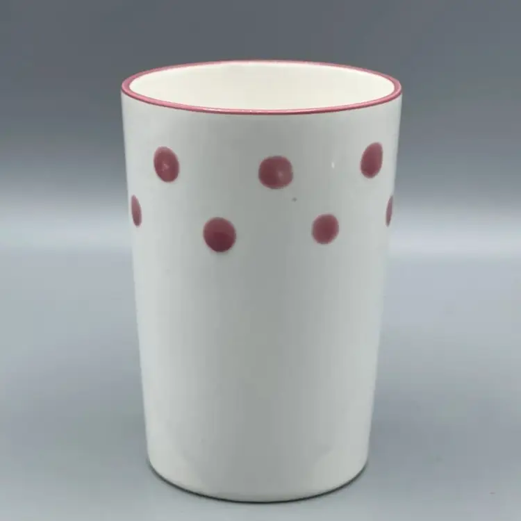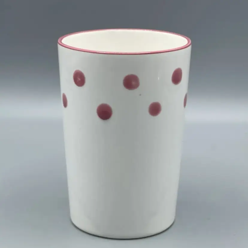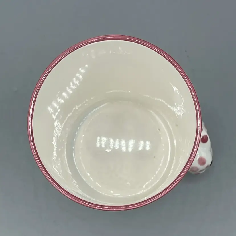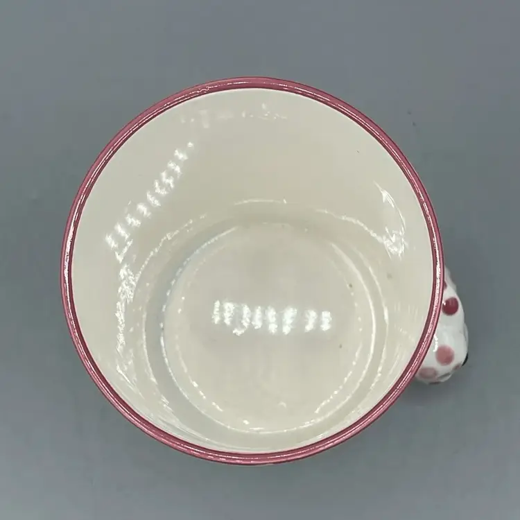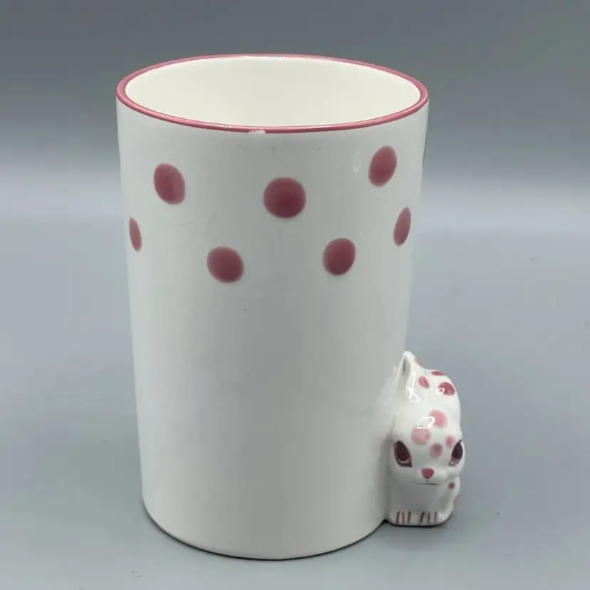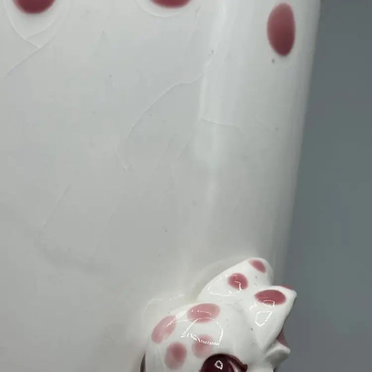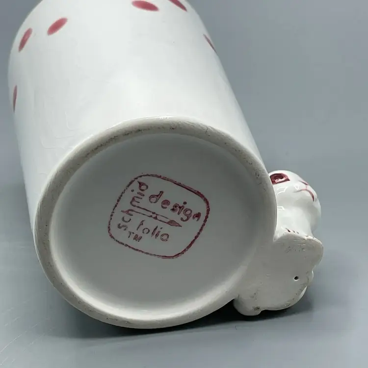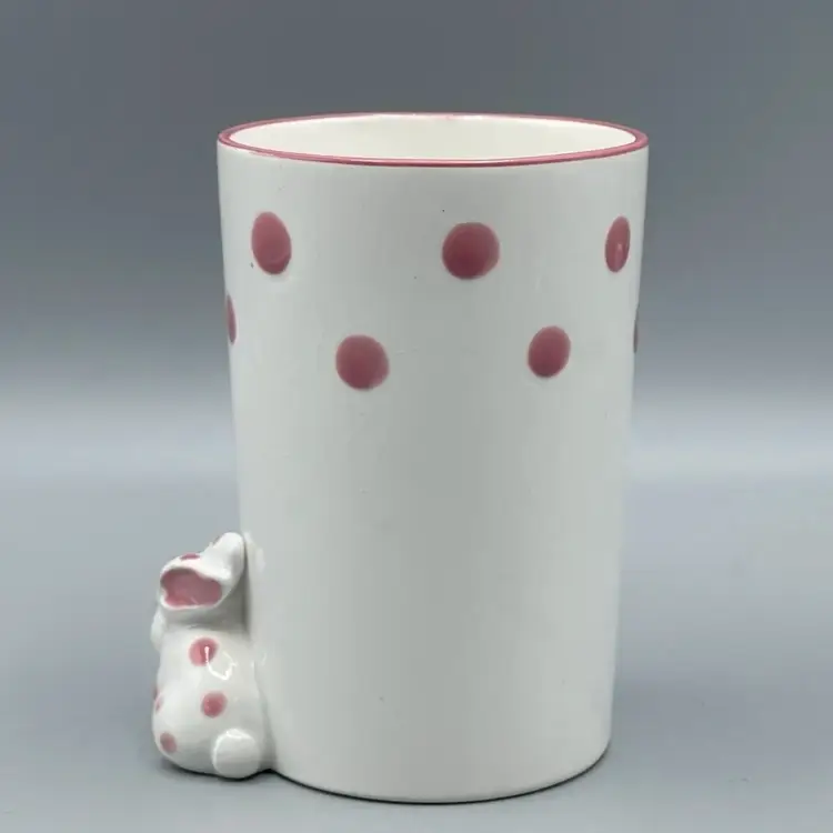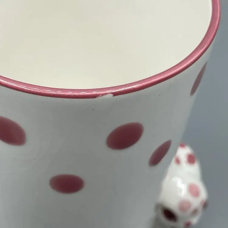 This adorable 1970’s ceramic Polka Dot Bunny cup stands at 4-5/8 inches tall. It has no chips or cracks but it does have crazing and a small spot on the lip with some missing pink paint that seems to be a manufacturing defect.