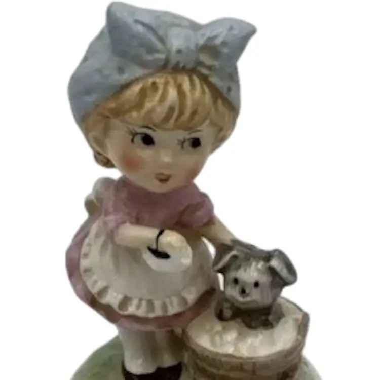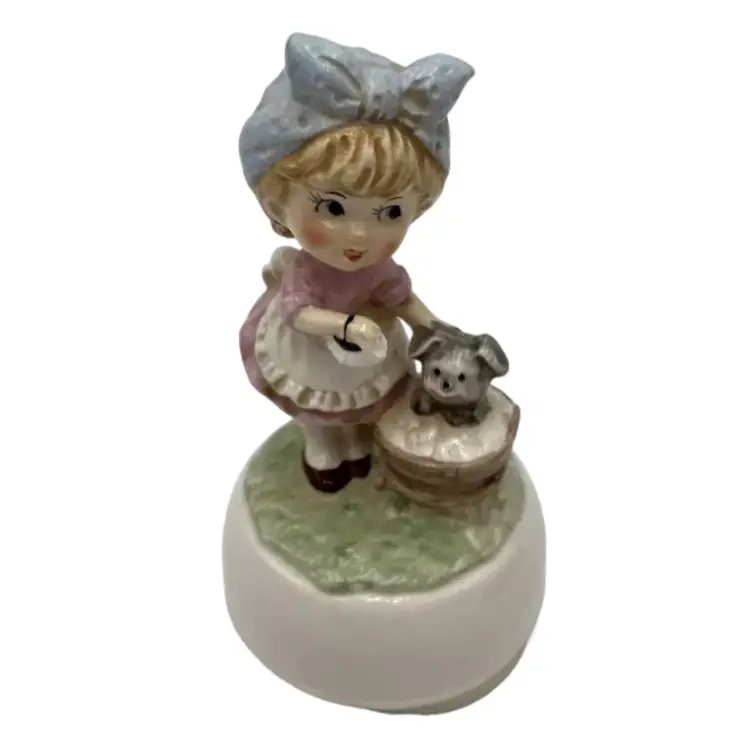 Vintage Schmid rotating musical box figurine that plays the tune Both Sides Now. Video shows item in use. Porcelain figurine of a little girl washing her dog adorns this music box. Made in Japan marking on the bottom. Measures about 6.5" tall. EUC, no chips or cracks.