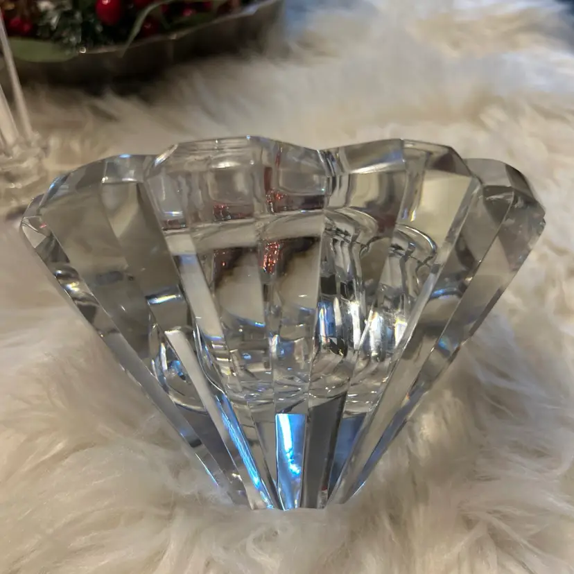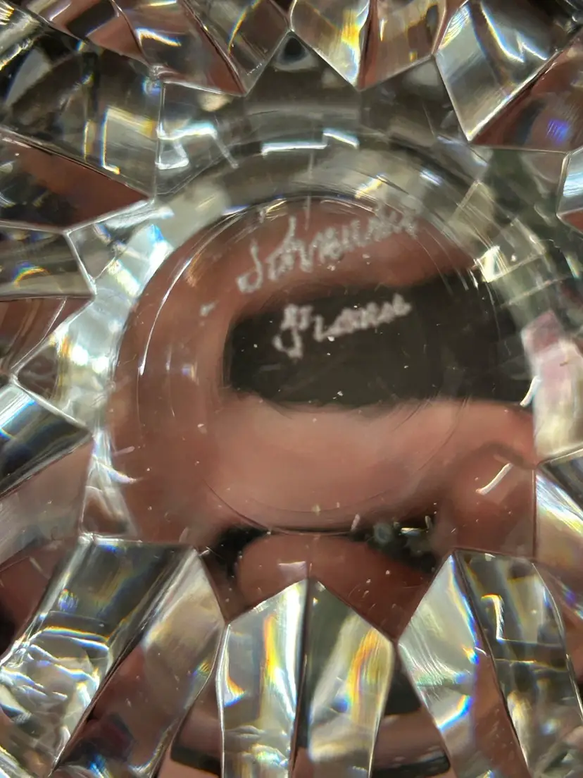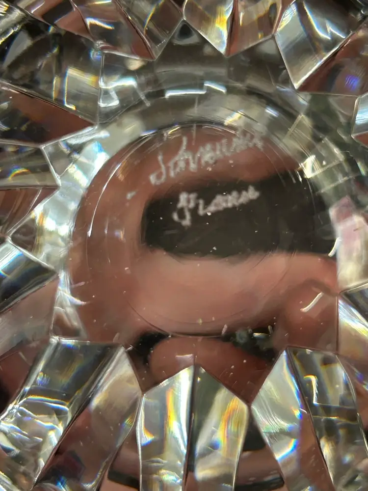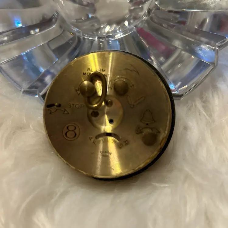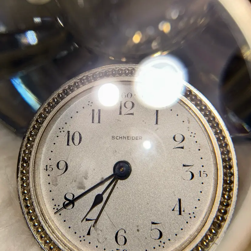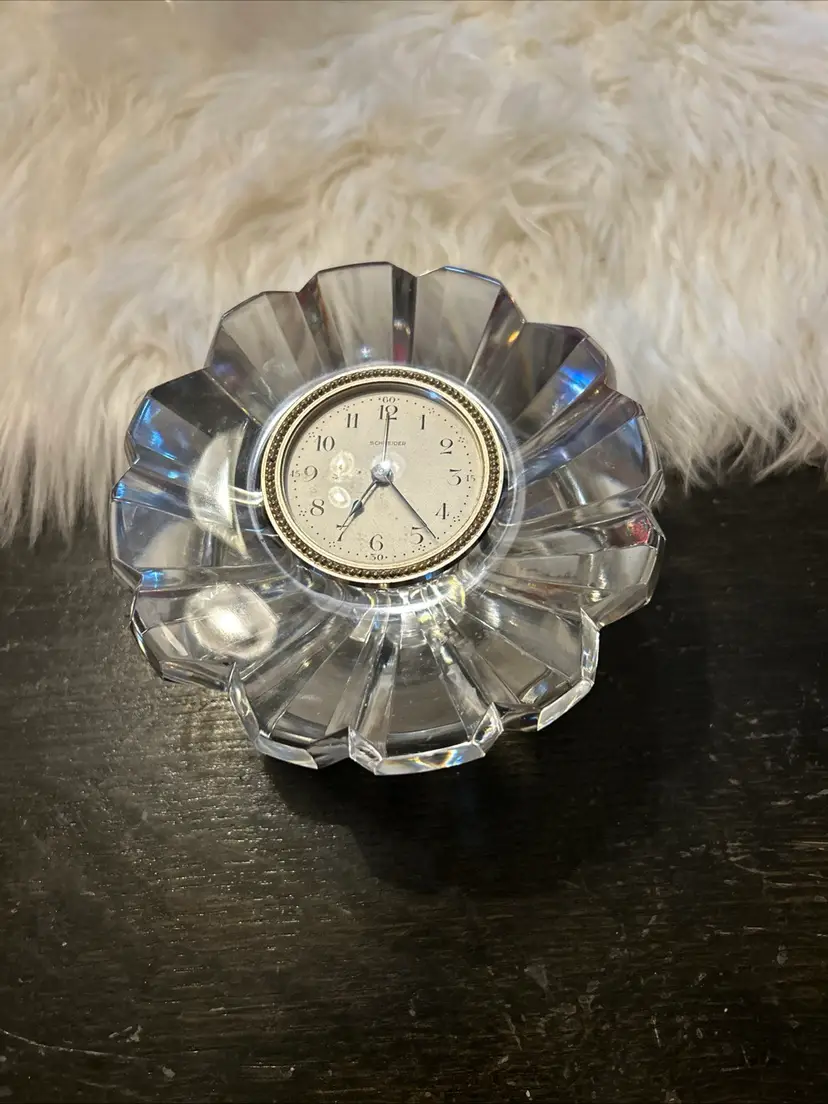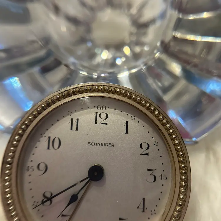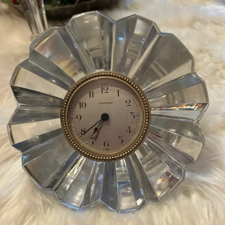 Vintage Schneider France Glass with click inset. Clock is brass housing, wind up and functioning properly. Glass is early 1950’s Schneider France as has etched signature in the bottom. Exquisite piece and classy art deco design