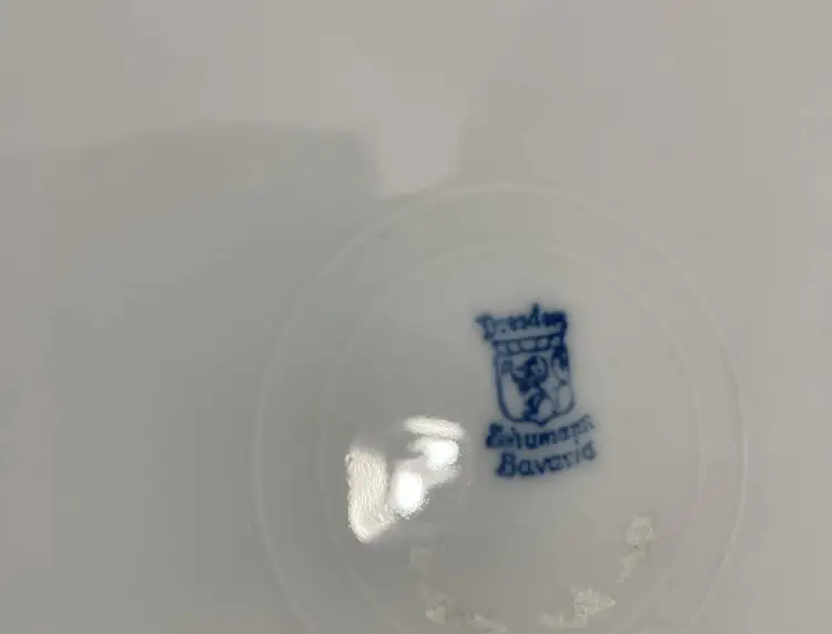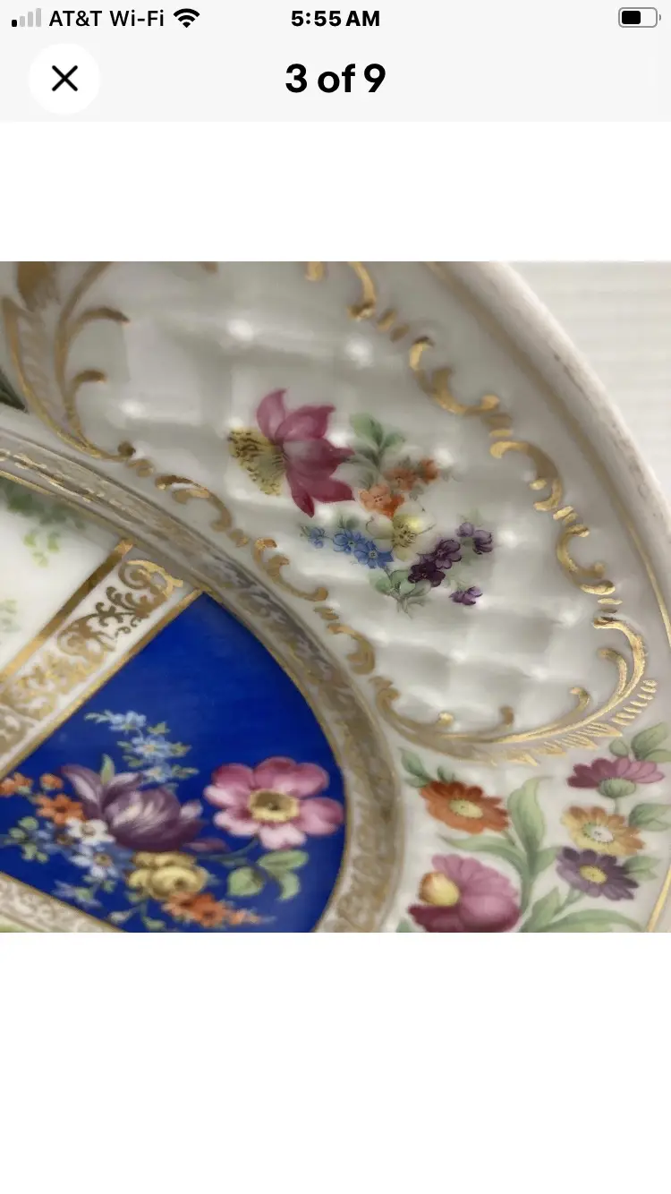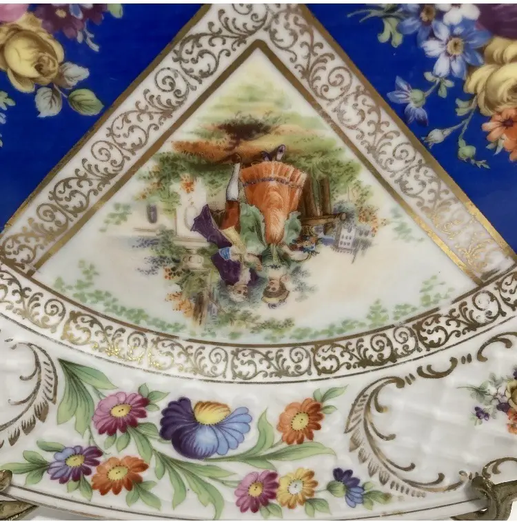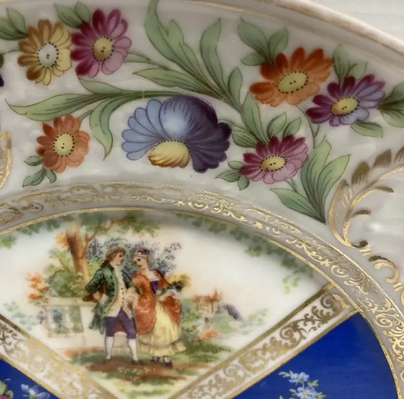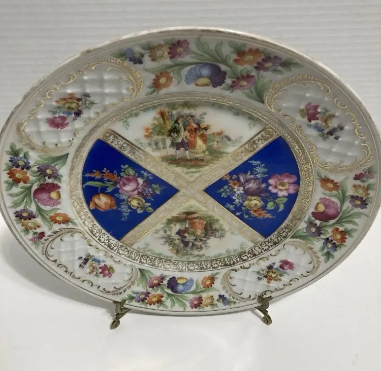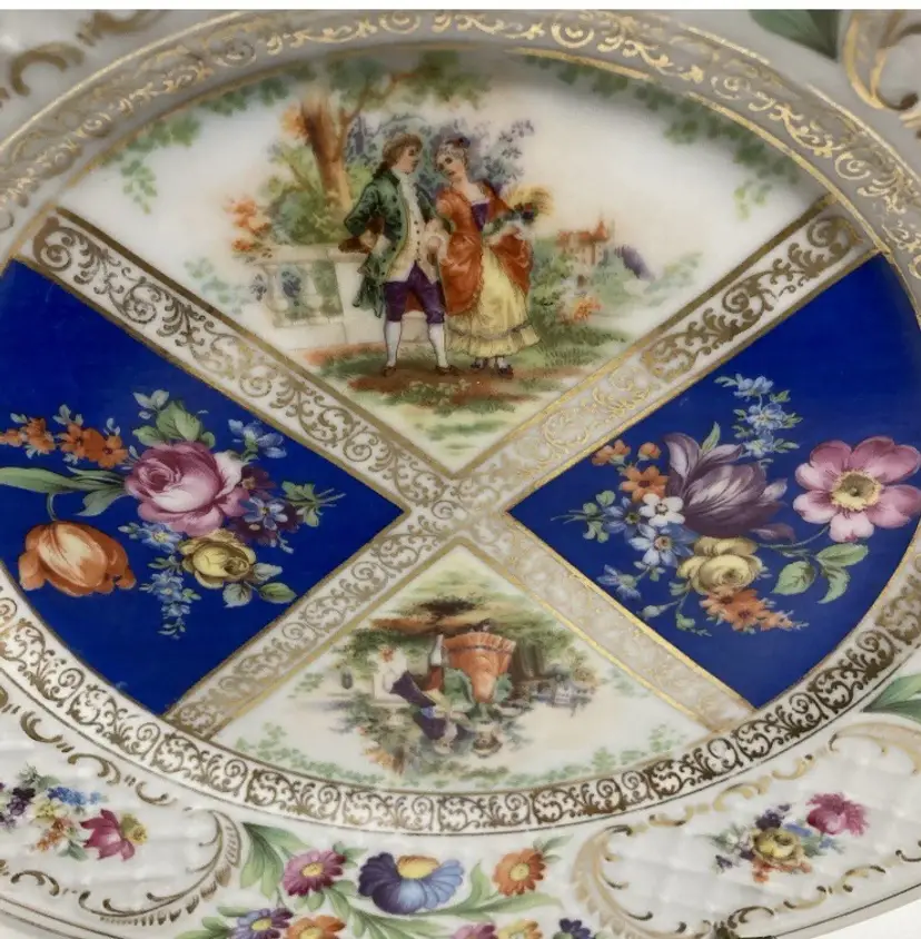 This vintage Schumann Bavaria plate from the early 20th century features a beautiful Dresden Flowers pattern and Watteau scenes in a quatrefoil shape. The plate is made of porcelain and has a glossy finish. It is 11 inches in diameter and is a cabinet plate, perfect for decoration or use on special occasions. The plate is a vintage original and was produced in Germany . Small areas of gold loss around edges .