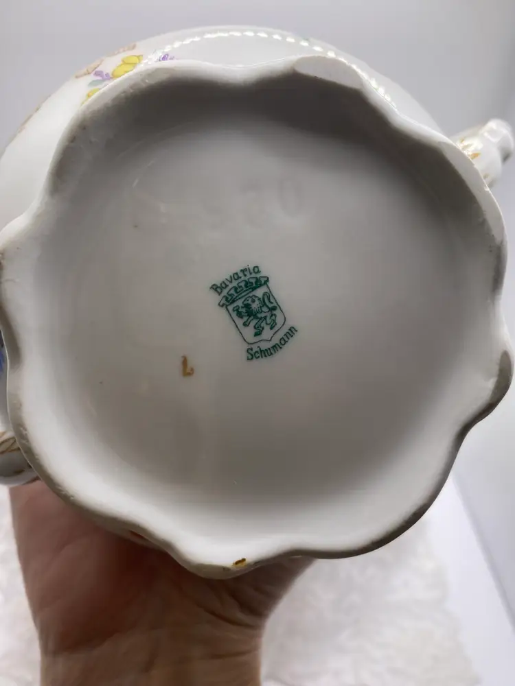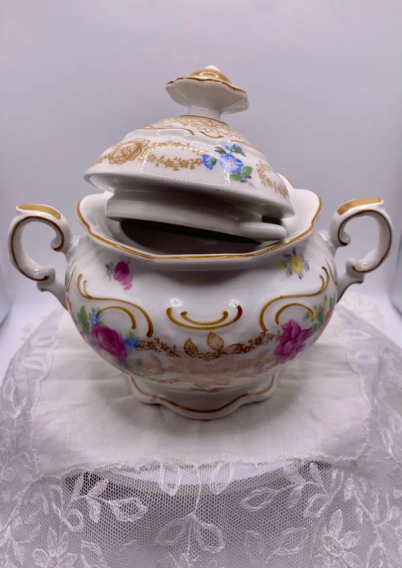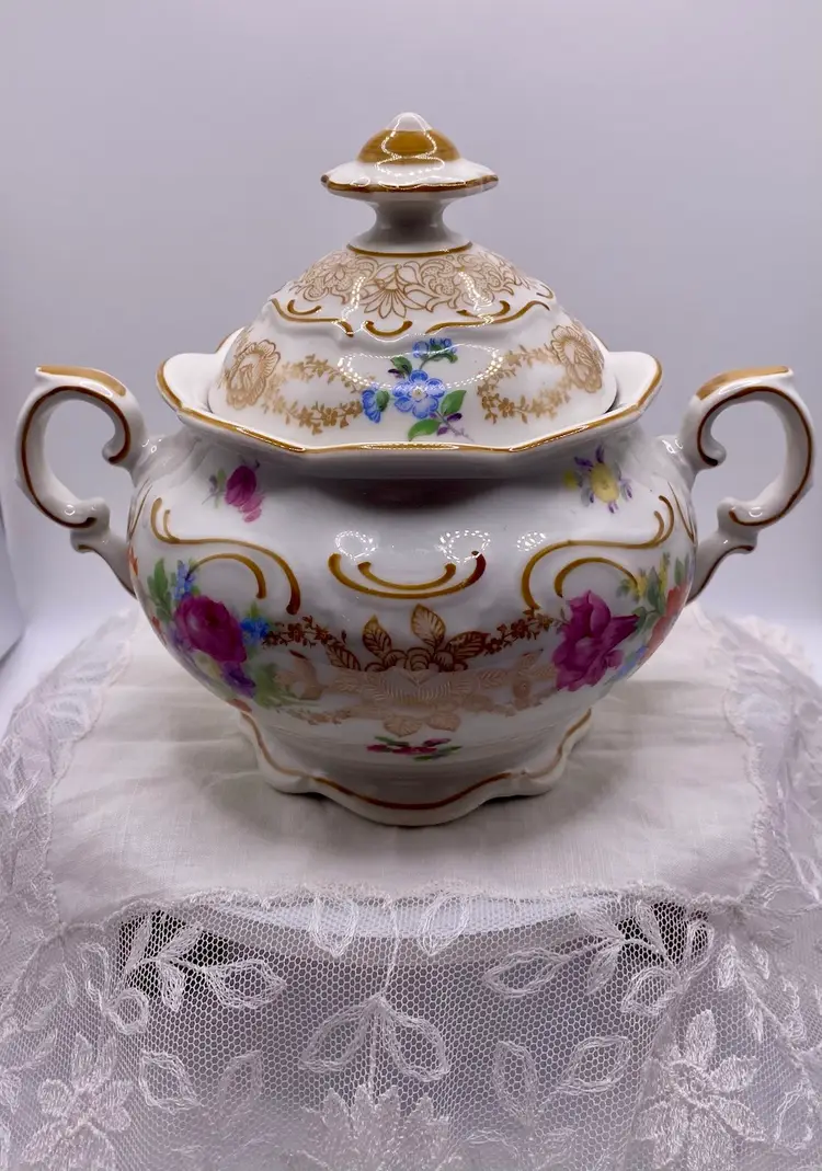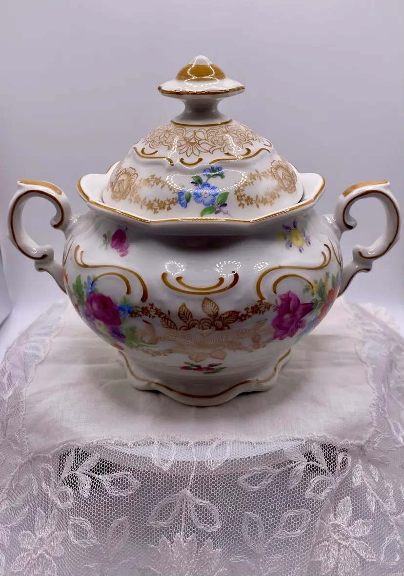 Elegant Vintage Schumann Bavaria Porcelain Sugar Bowl with Lid. Made in Germany, this gorgeous sugar bowl is adorned with Gold transferware, Yellow & Pink Roses and has multicolored florals. No chips or cracks. Measures 7” across and stands 5.5” tall. The Lid is 3.5” in length. Makers mark is on the bottom of the bowl