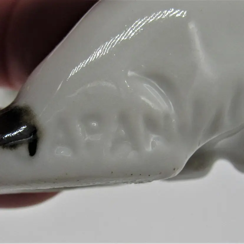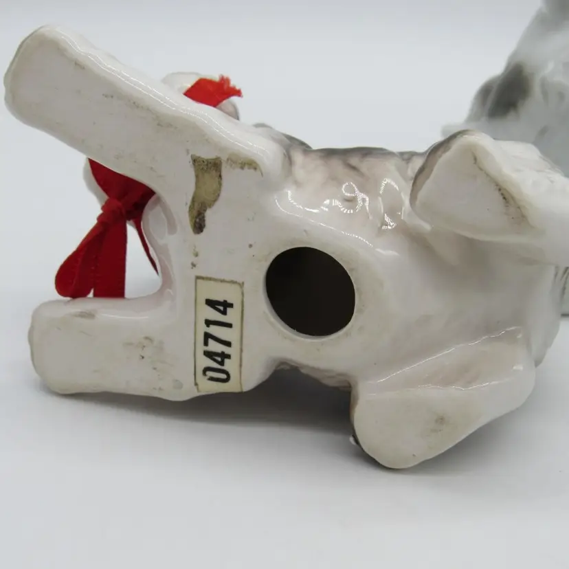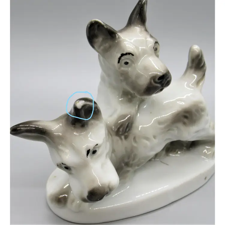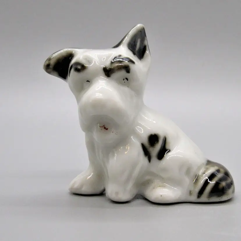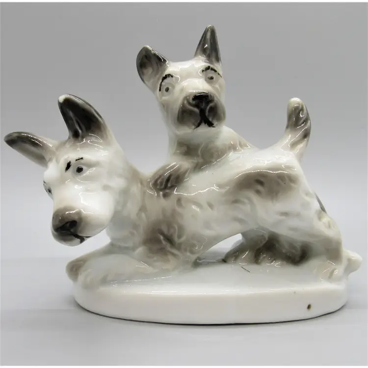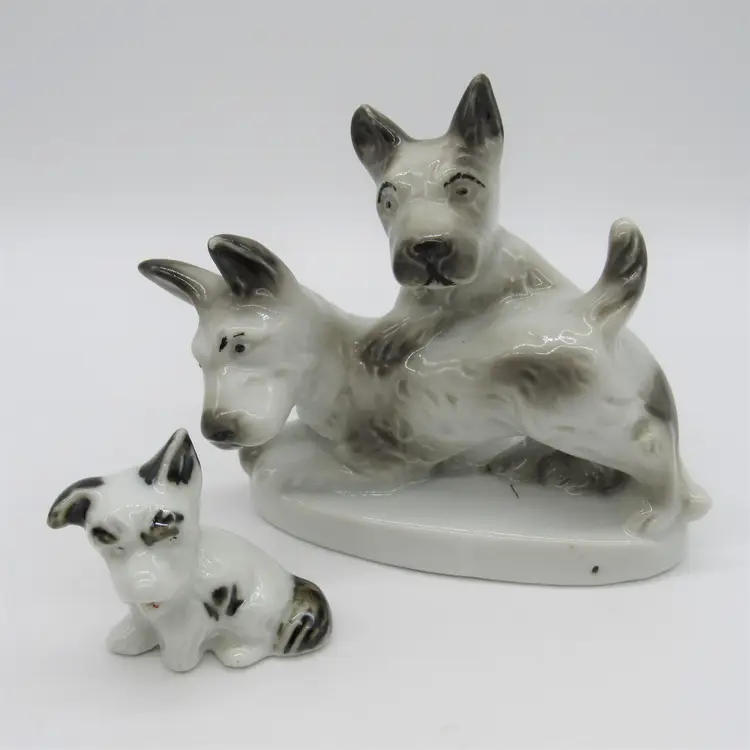 Collection of porcelain Scottie dog figurines made in Japan (1930's-1950's). Figurines are glazed and marked/embossed with Japan. Condition of the figurines is pre-owned, well loved. There is paint wear on each as well as some scuffing. Some chipping/marks on the Scottie dog pair (see photos). Measurements: Small b/w Scottie: 2" x 2" x 1" Pair Scotties: 4" x 5 1/4" x 2 3/4" (at widest point) Brown Scottie (Lefton?): 2 1/2" x 4" x 2 1/4"