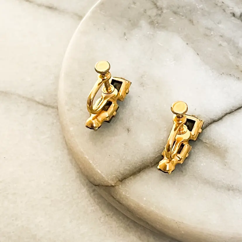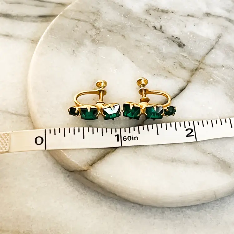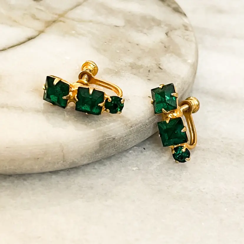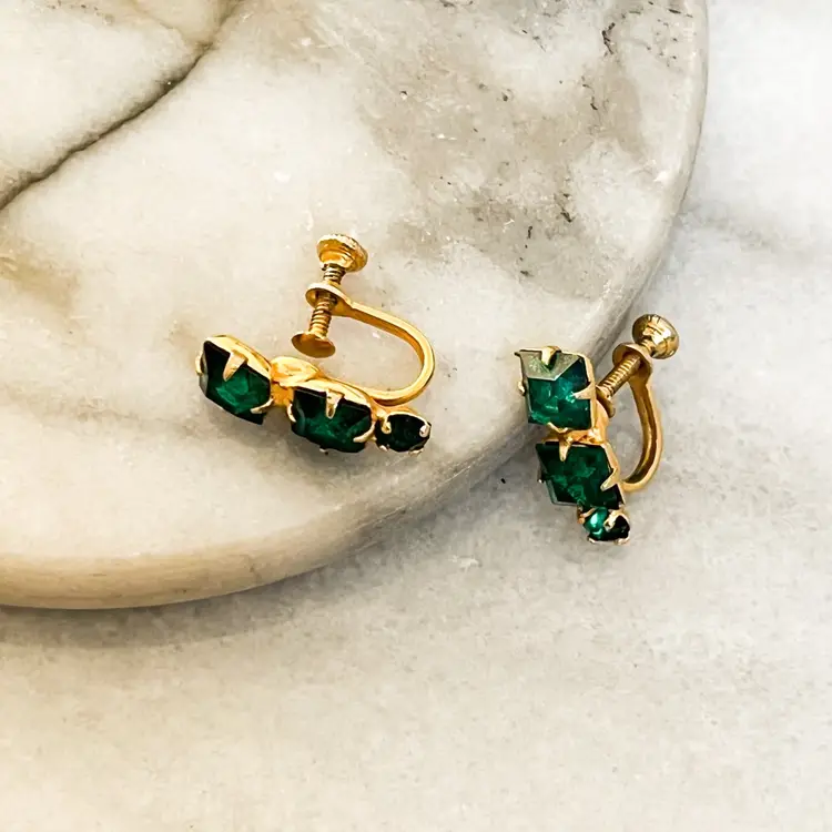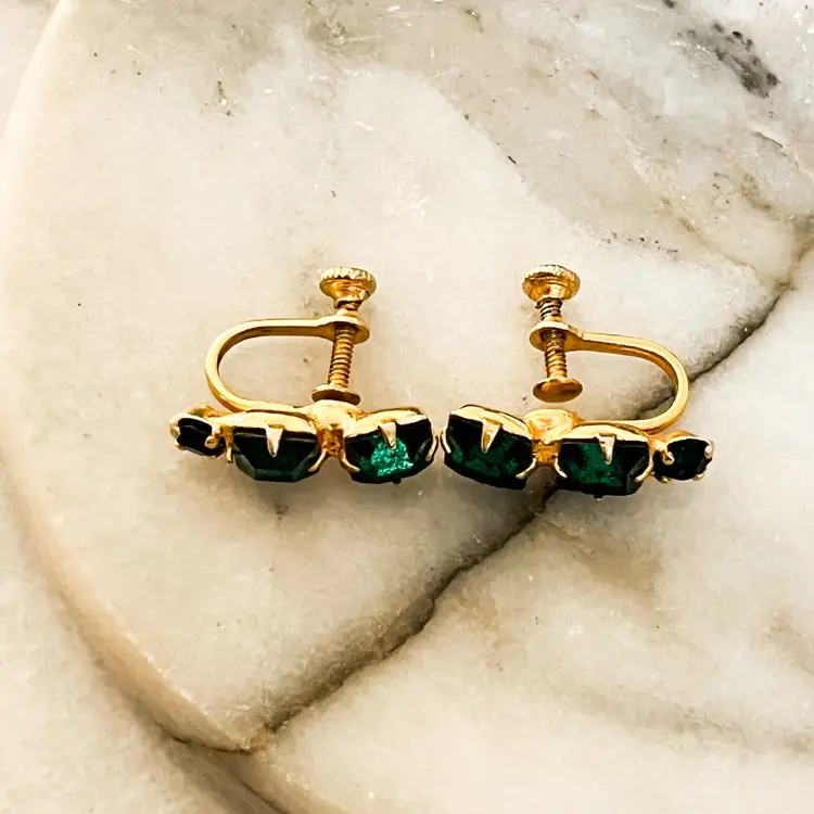 Vintage Screw Back Crystal Earrings Colors: Green, Gold Toned Metal Unsigned Style: MCM Midcentury old Hollywood glam Prong Set