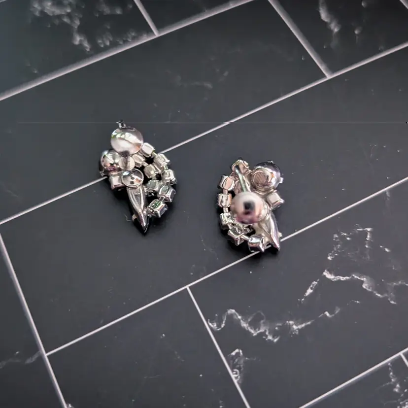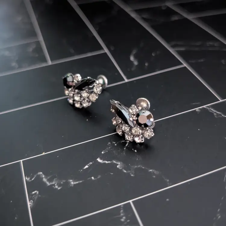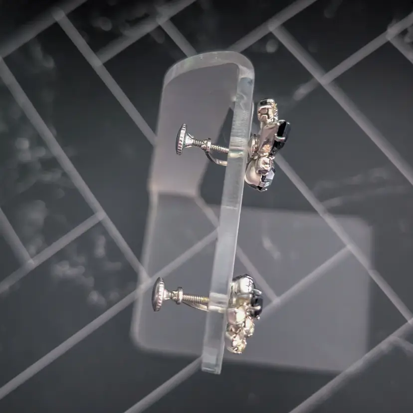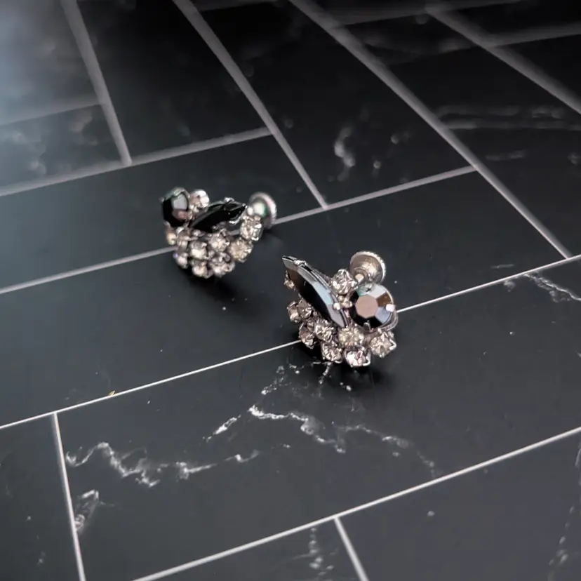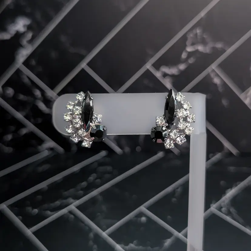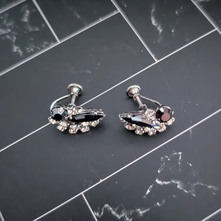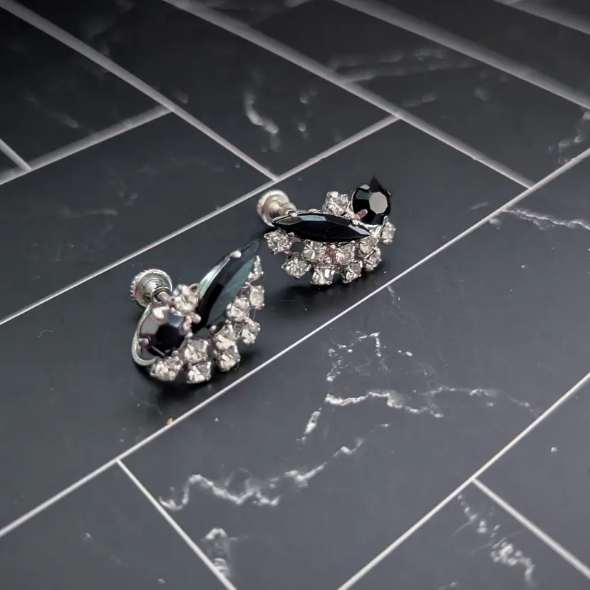 Vintage Screw Back Earrings Black & Clear Gems Stylish & Elegant