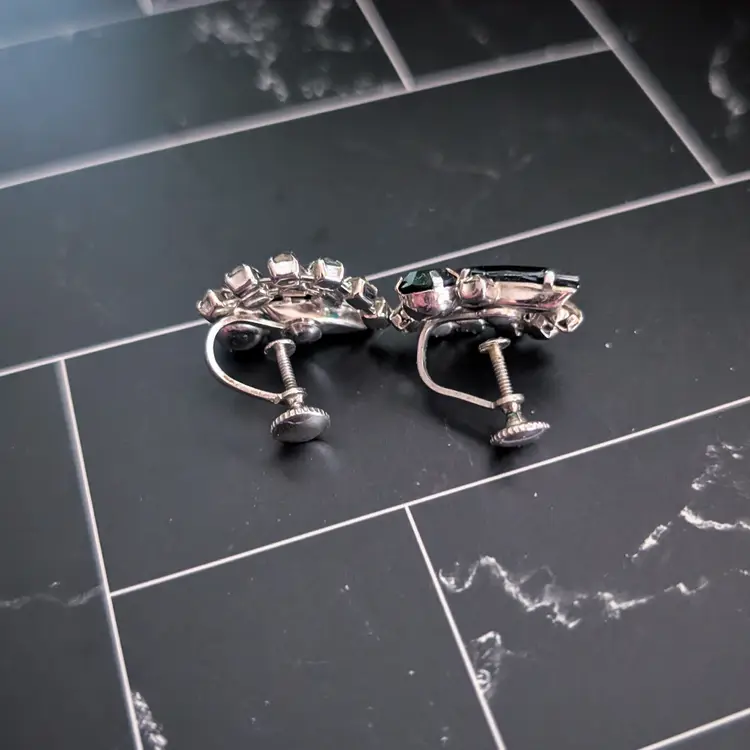 These earrings measure just over 0.75". Light marks to the front. Black gems have a slight multi colored finish in certain lights. Some wear to screws. Some bending to screw backs. Some green tarnish around screws. I am unsure of the material of the gems; however, there are none missing.