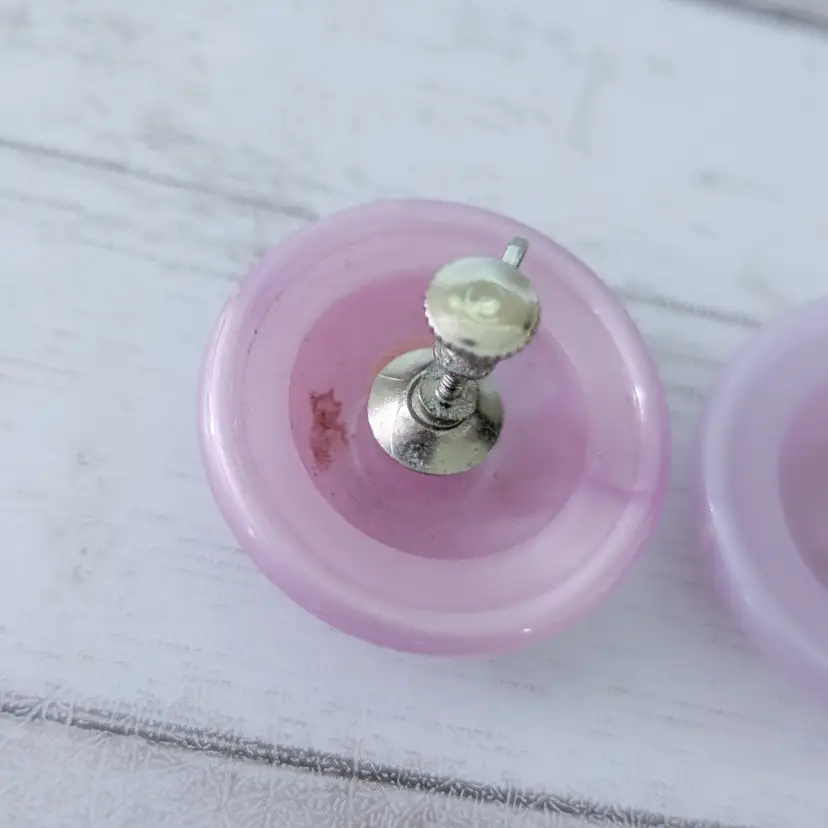 These earrings measure about 1 & 1/8". Small marks to front. Some marks/glue to rear. Some wear to screws.