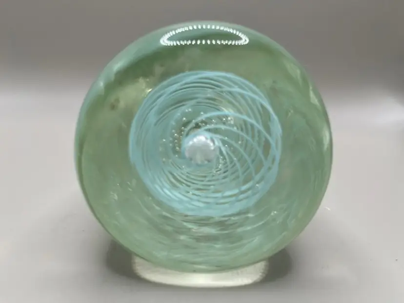 Features a clear glass conical body with a seafoam green spiral pattern and internal controlled bubbles. Measures 7.25 inches tall.