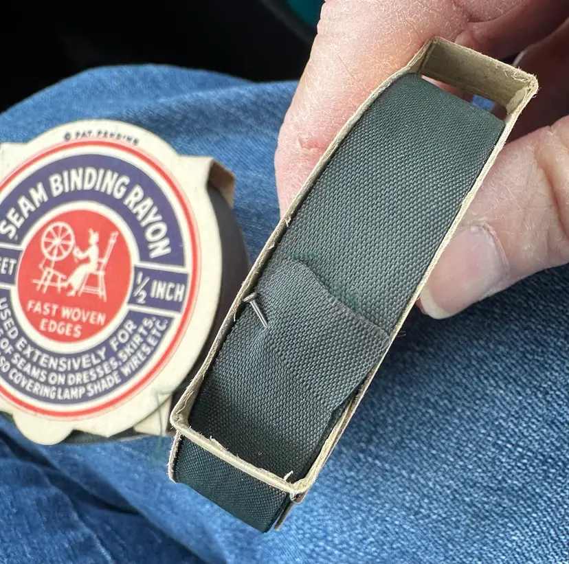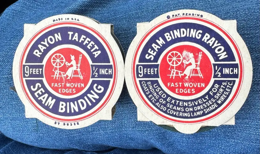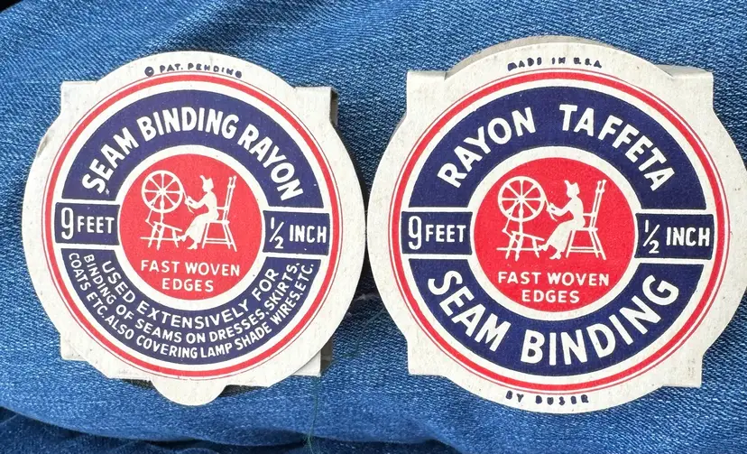 Two rolls of seam binding vintage new old stock. Buser brand. Made in USA As near as I can tell they are unused. Original straight pin to hold start end in place. Slight unraveling on one roll, unable to tell if any has been used. Looks as full as the other roll. I have not unrolled it, nor do I want to. The cardboard holders are intact. Slight damage on both in the center. Visible in the photos. Will be shipped in a box to avoid crushing that may happen if shipped in a padded envelope. Please message me if you have any questions