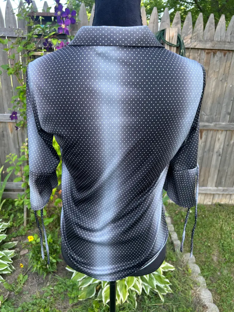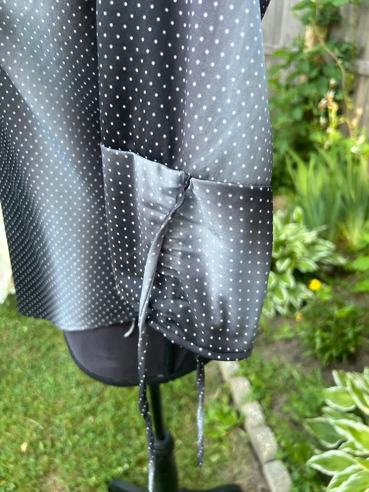 Brand/Maker- Sears The Fashion Place Size- Labeled Small, Due to style measurements indicate medium - see measurements below Color- Black, white Condition description- No rips, stains or tears. Missing top button - see photos. Fabric- Polyester