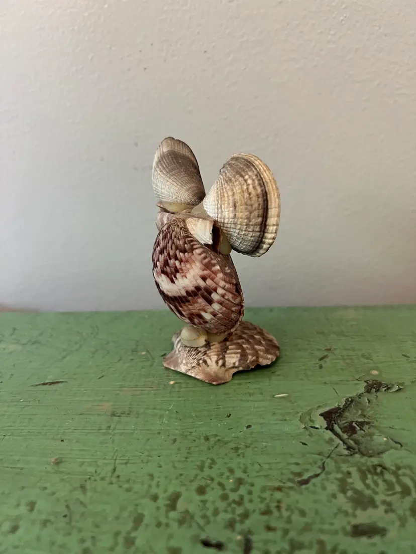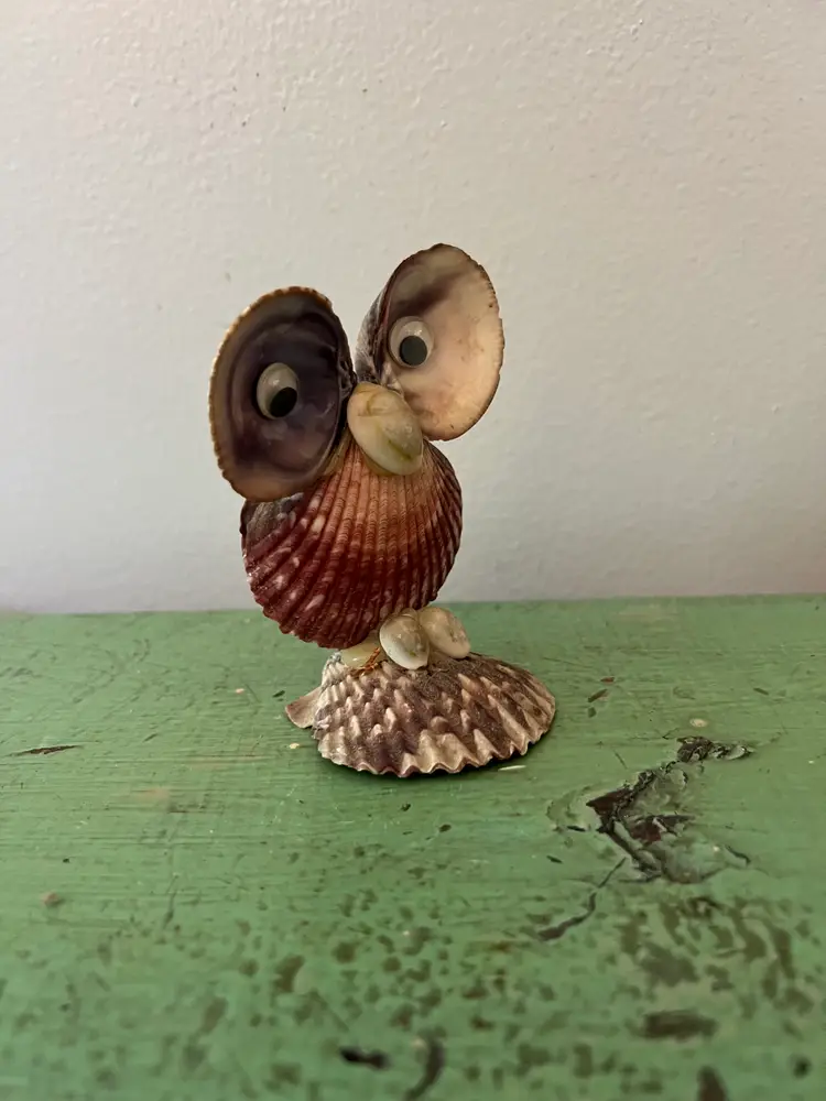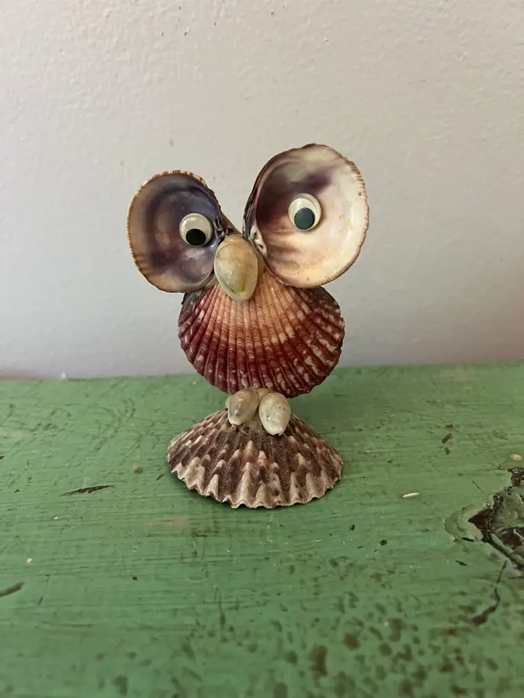 Adorable vintage seashell owl sculpture Wide eyed owl with googly eyes perched on a shell 3 7/8" tall Good condition.