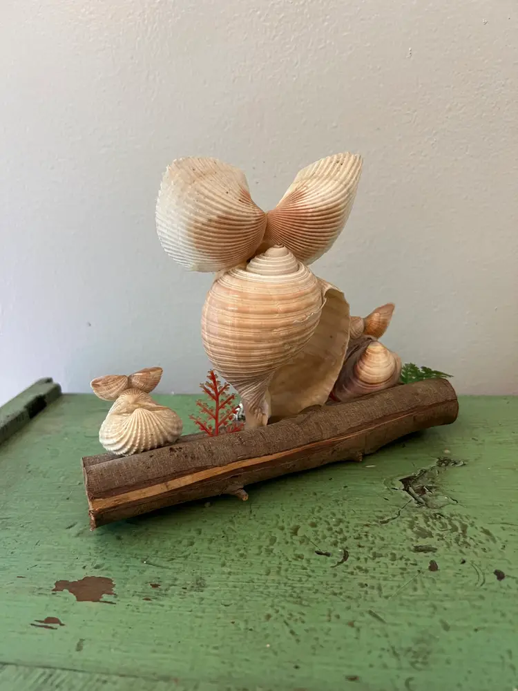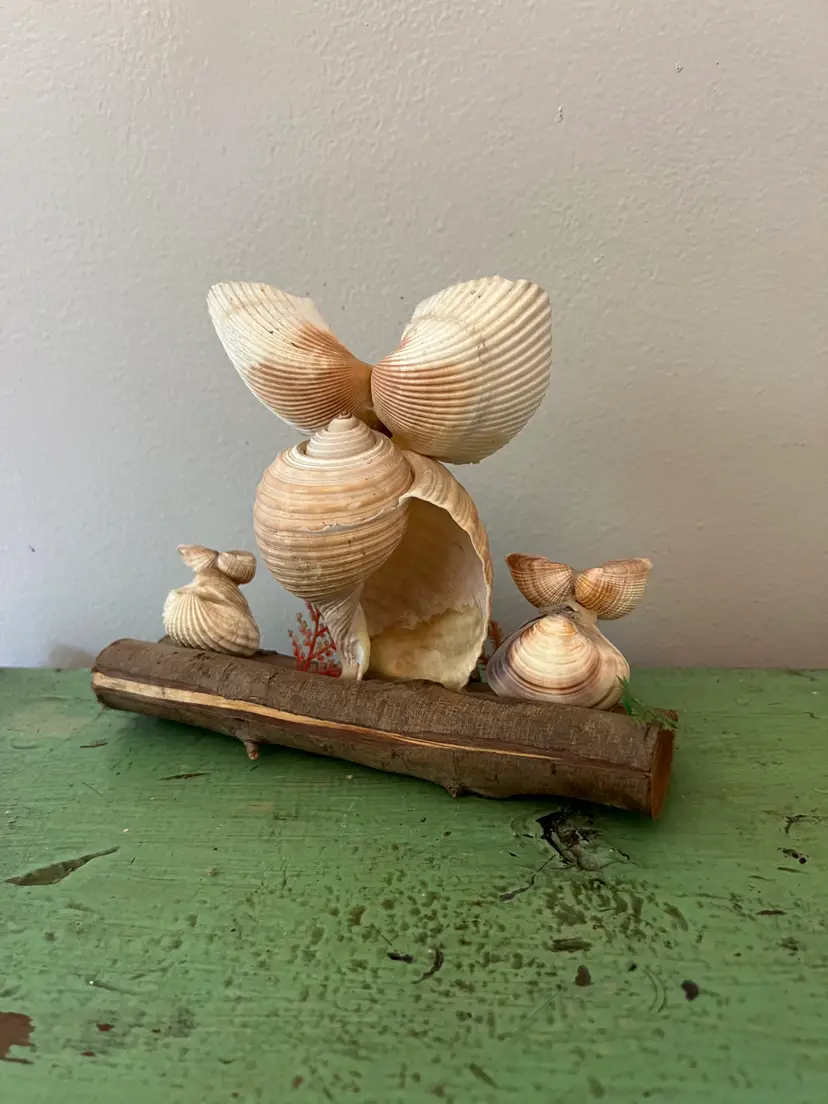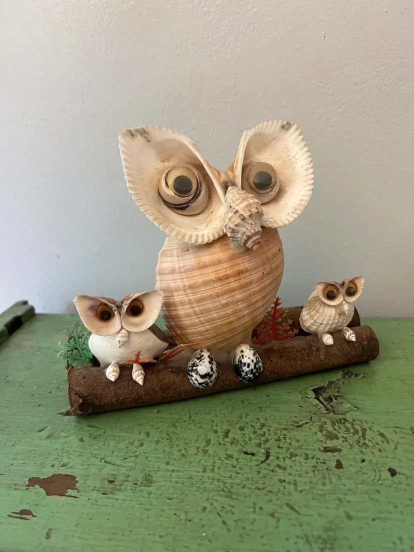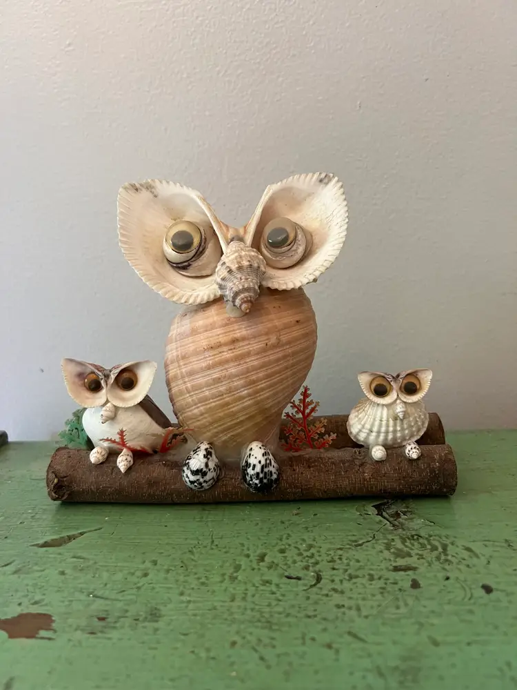 Adorable vintage seashell owl sculpture 3 Wide eyed owls perched on a log. Vintage Owl Figurine. 6" tall by 7.25" long. Good condition.