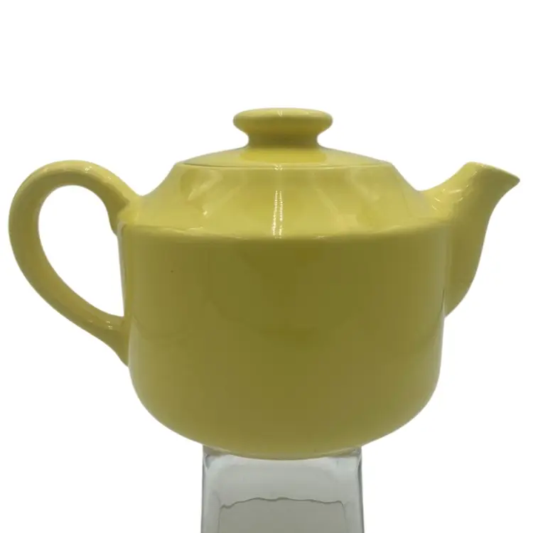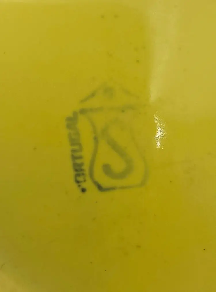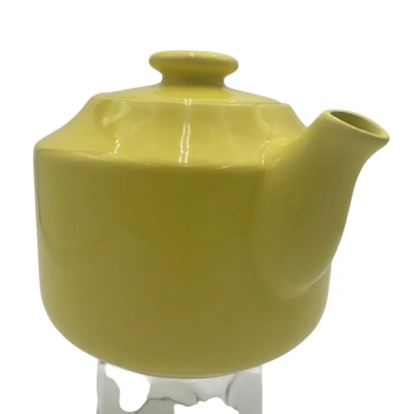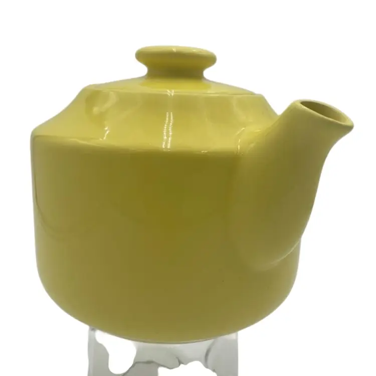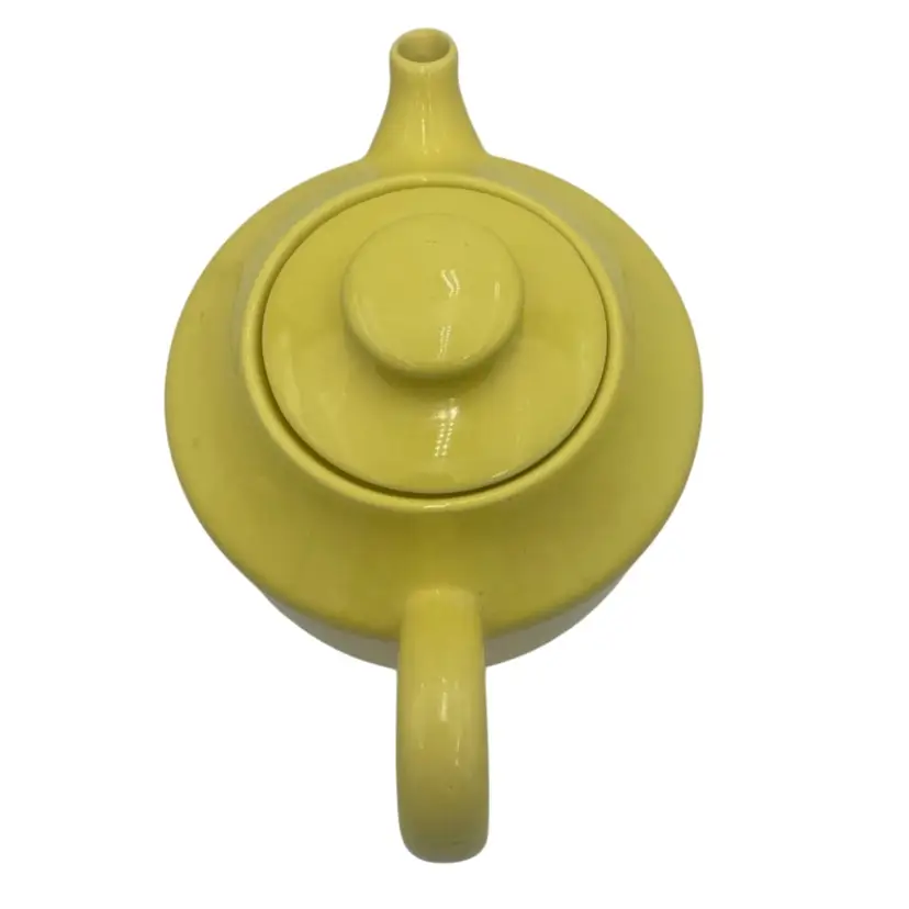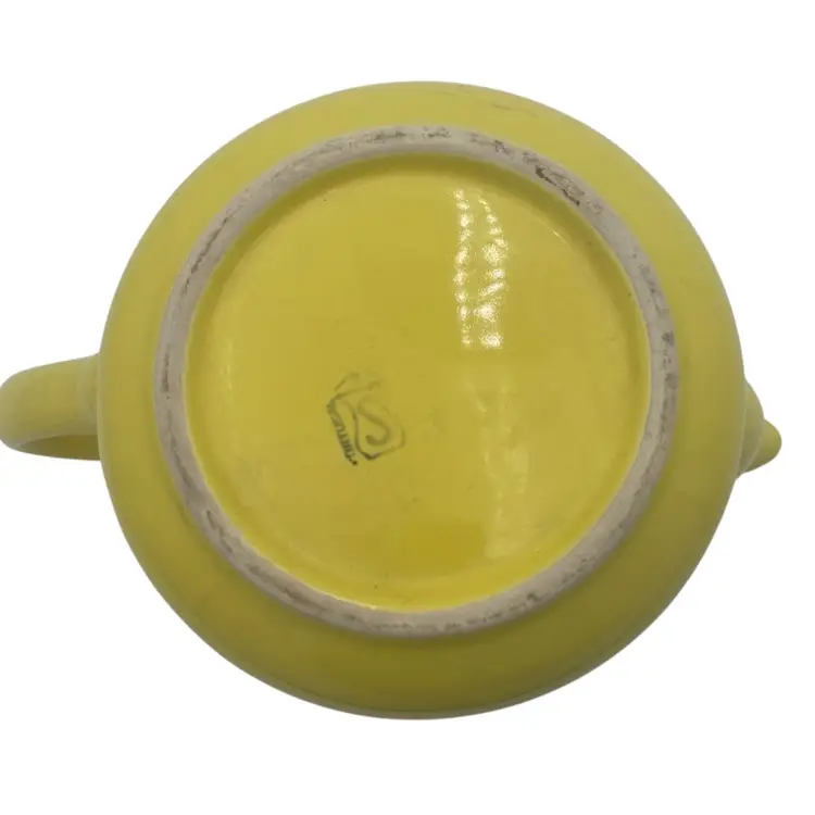 This large, handmade teapot from Secla Pottery in Portugal is a stunning addition to any collection. Its oval shape and solid canary yellow color make it a standout piece, while its glossy finish adds a touch of elegance. The teapot has a printed backstamp and weighs 2 pounds and .7 ounce, with dimensions of 8.5 inches in length, 6.7 inches in height, and 6.5 inches in width. Crafted in the 1970s using pottery production techniques, this original piece is perfect for collectors of vintage art pottery. The teapot is ideal for serving tea or as a decorative piece in any kitchen or dining room.