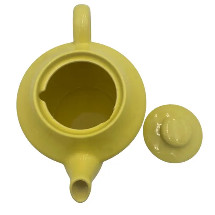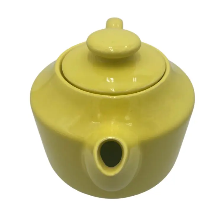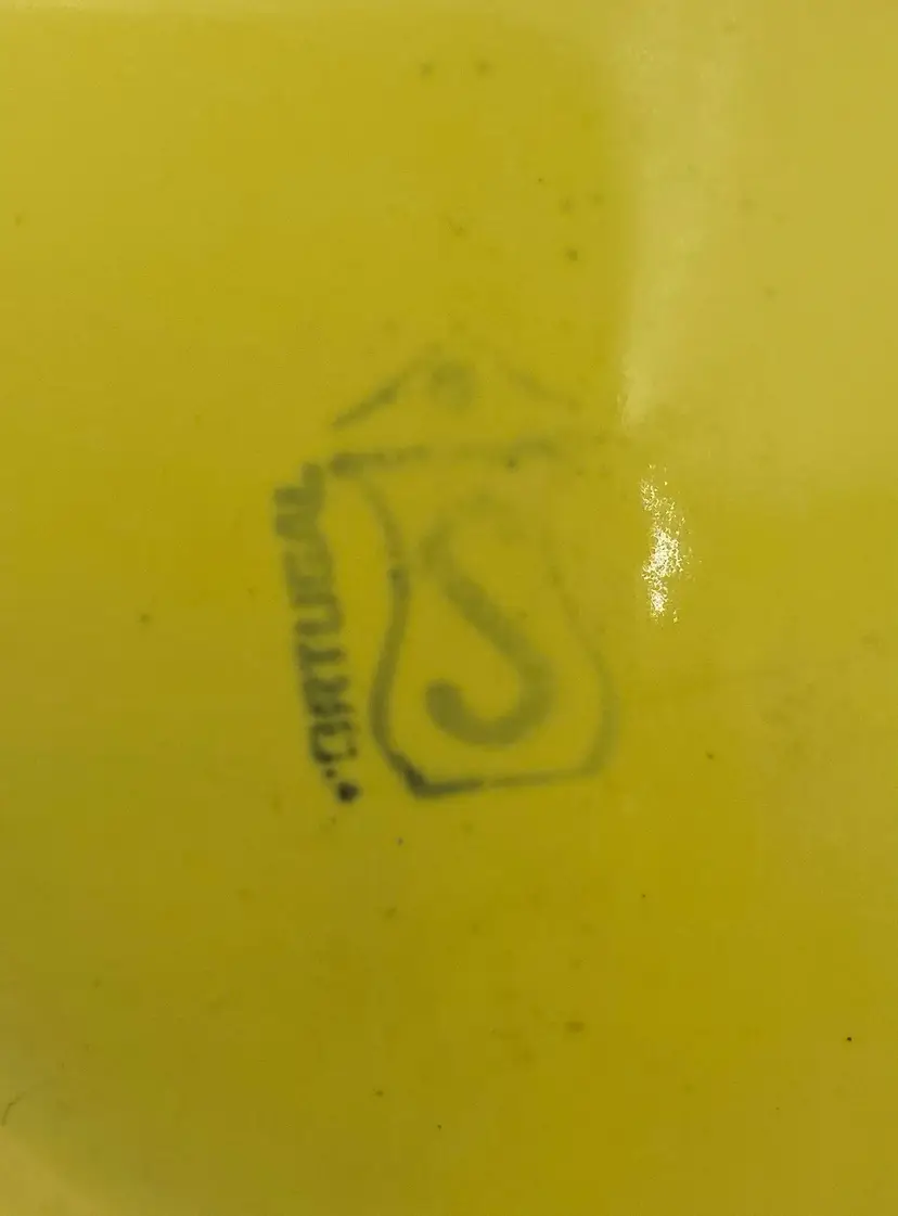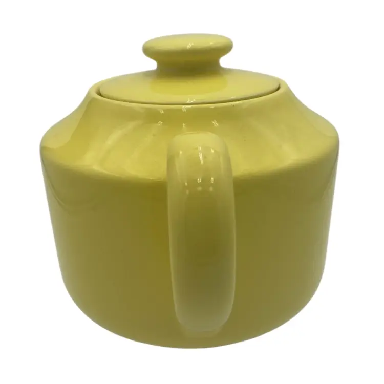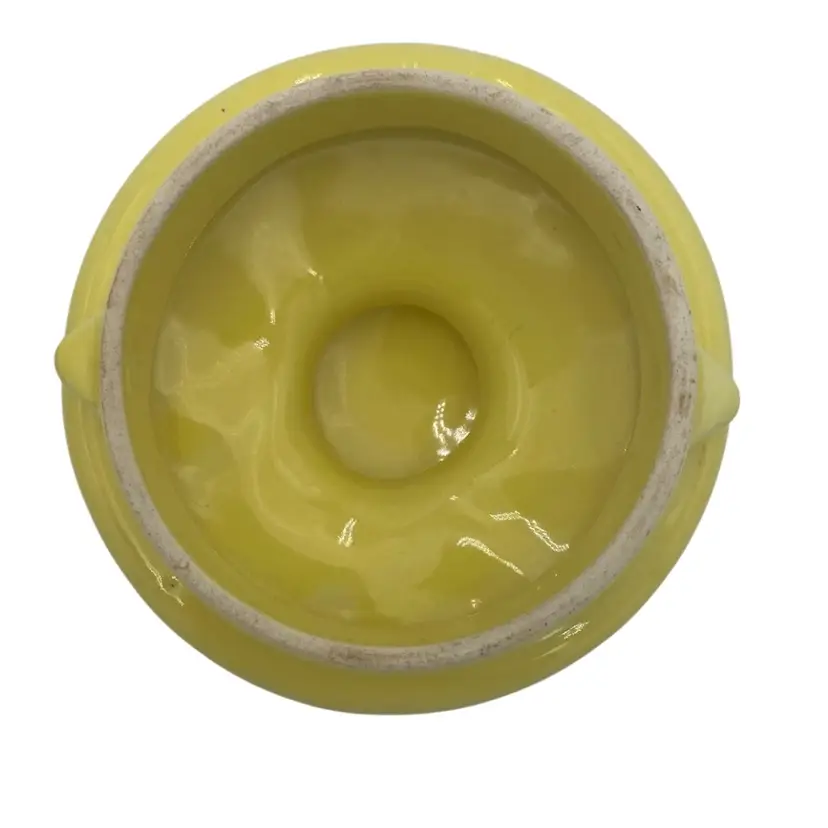 This large, handmade teapot from Secla Pottery in Portugal is a stunning addition to any collection. Its oval shape and solid canary yellow color make it a standout piece, while its glossy finish adds a touch of elegance. The teapot has a printed backstamp and weighs 2 pounds and .7 ounce, with dimensions of 8.5 inches in length, 6.7 inches in height, and 6.5 inches in width. Crafted in the 1970s using pottery production techniques, this original piece is perfect for collectors of vintage art pottery. The teapot is ideal for serving tea or as a decorative piece in any kitchen or dining room.
