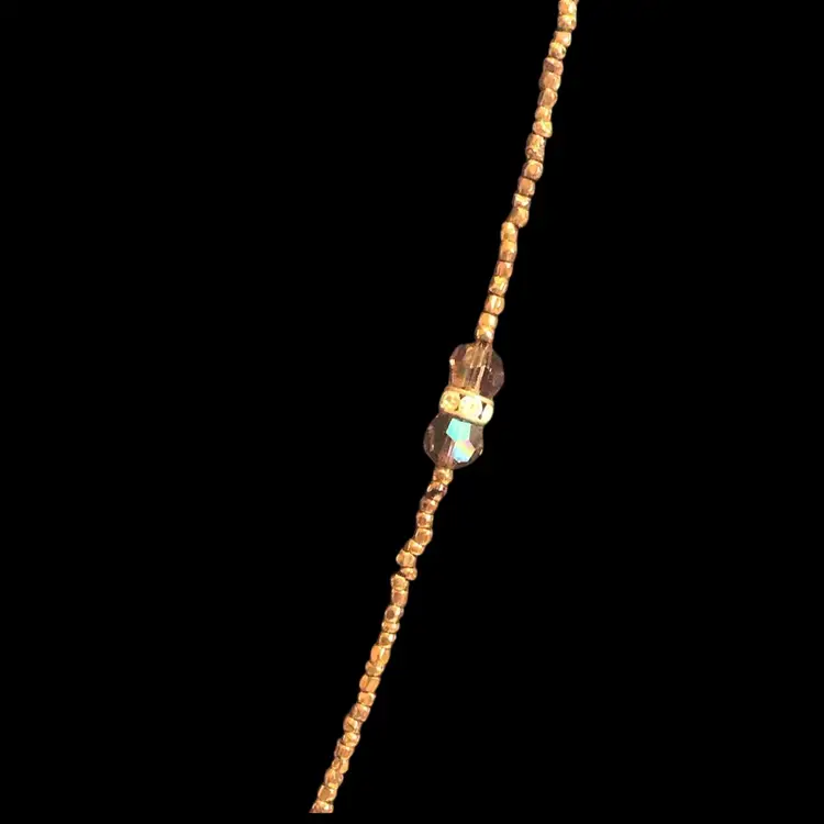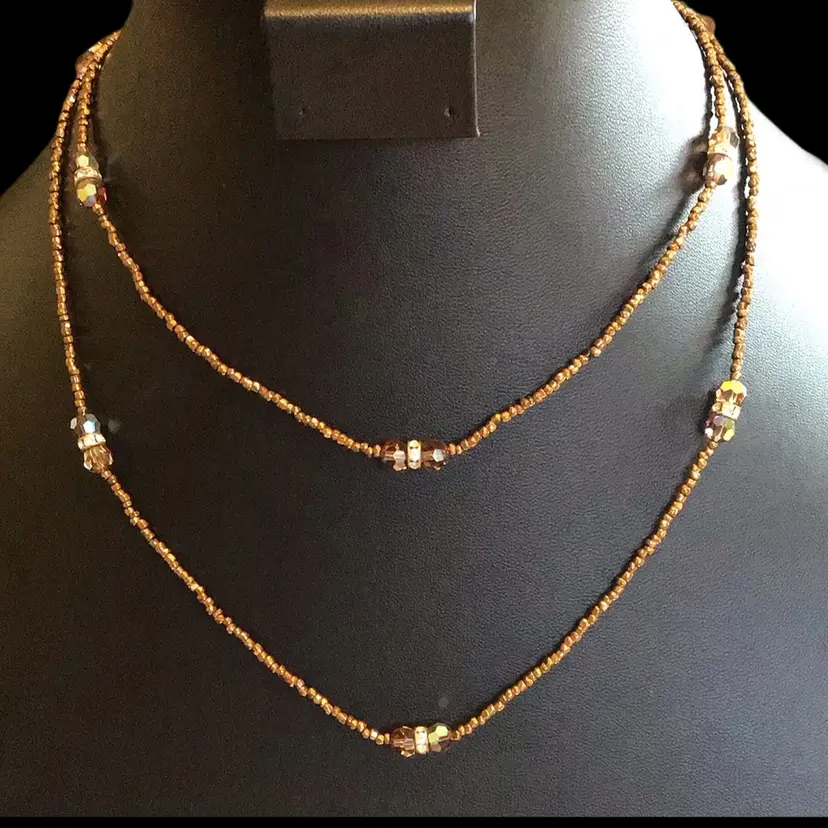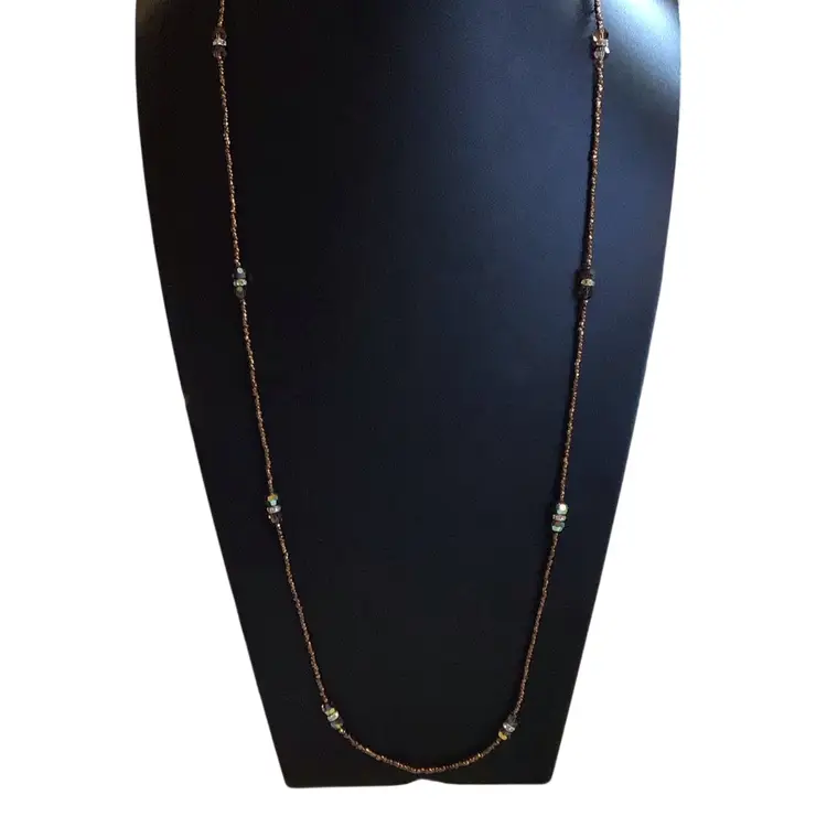 35” bronze seed beads with faceted crystals & rhinestone rondel accents. spring ring clasp. #027