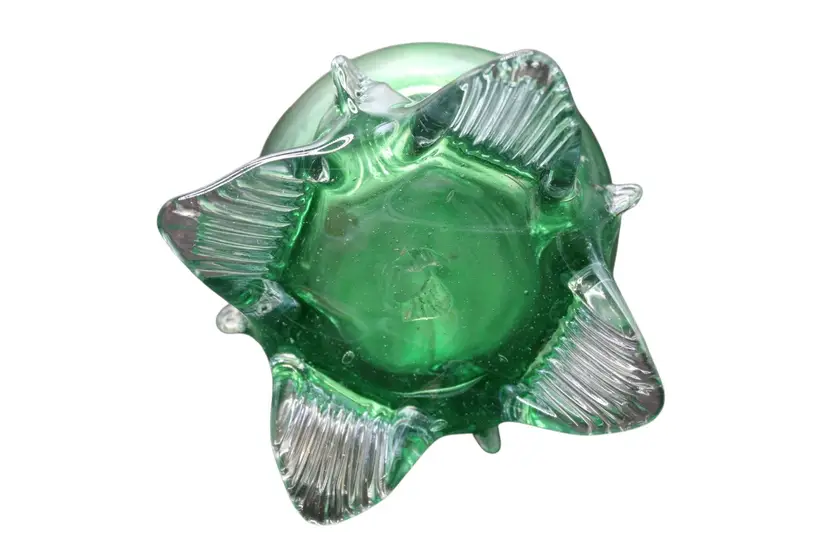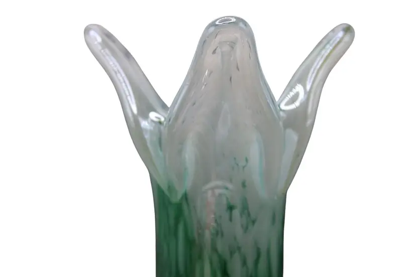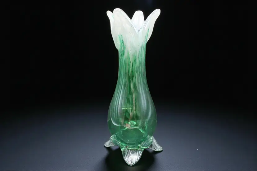 Vintage Seguso Murano Art Glass Vase Green & White Cased Lily Form Applied Feet Mid Century Italy 9” Tall. No chips or cracks.