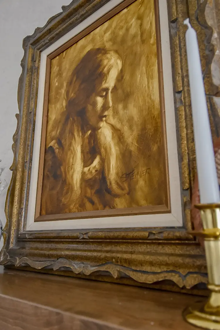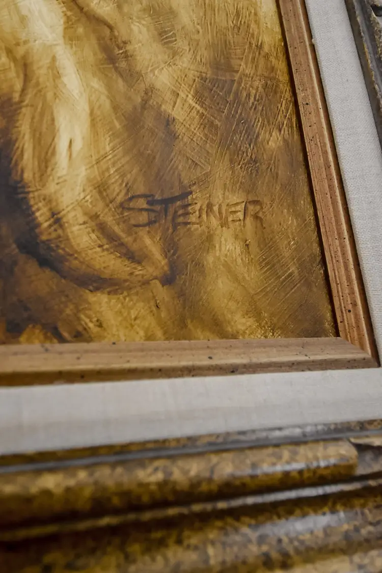 This vintage oil painting by Steiner features a beautiful portrait of a woman in a medium-sized canvas. The painting is framed and signed by the artist, making it a unique and one-of-a-kind piece. The production technique used is oil painting, and the subject of the portrait is women. The painting belongs to the post-war period (1940-1970) and is handmade. The painting measures 27 inches in height, 23 inches in length, and 3 inches in width. It is a diptych and is signed by Steiner. The country of manufacture is the United States, and it is an original piece. The painting falls under the category of art and paintings.