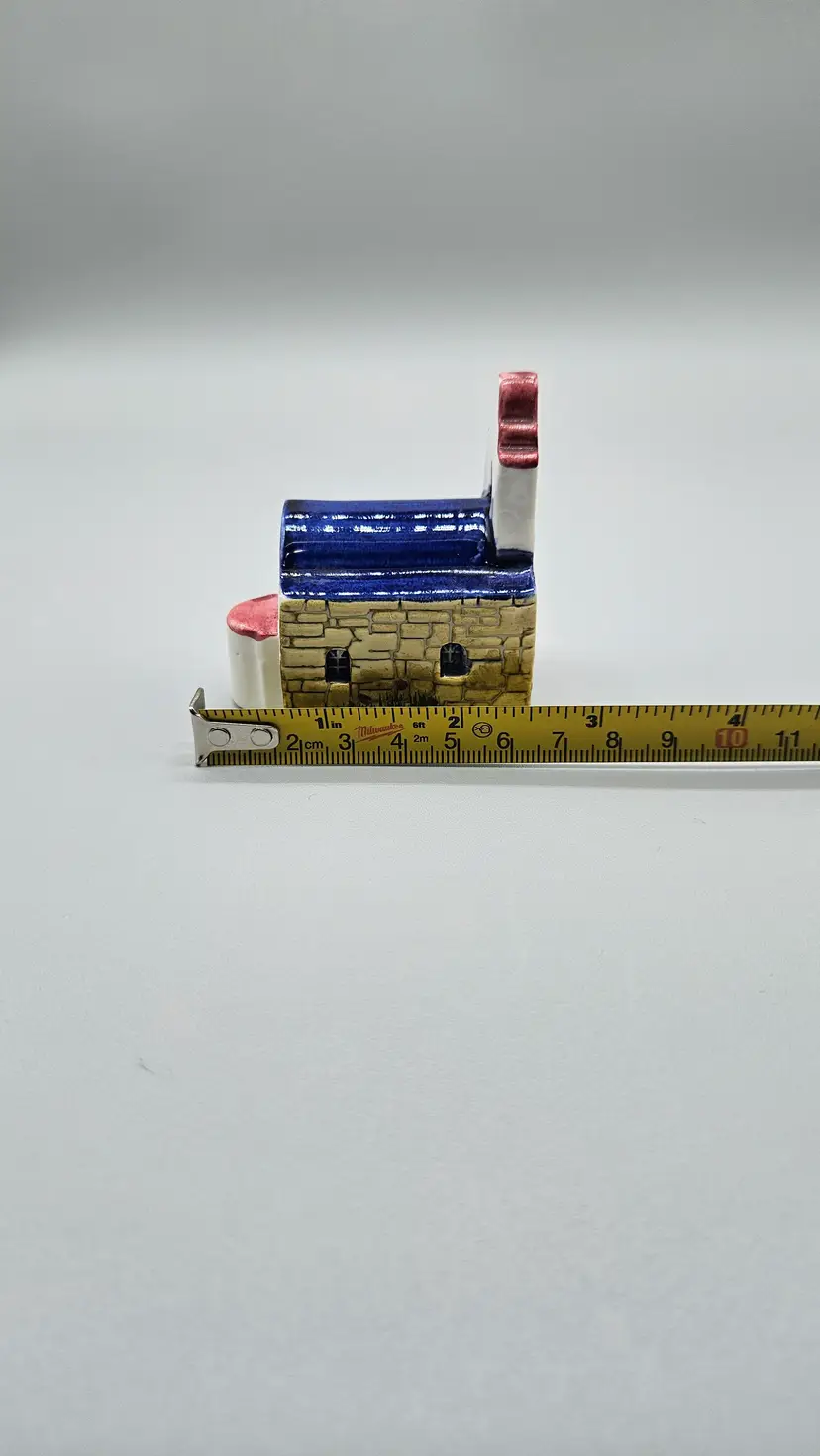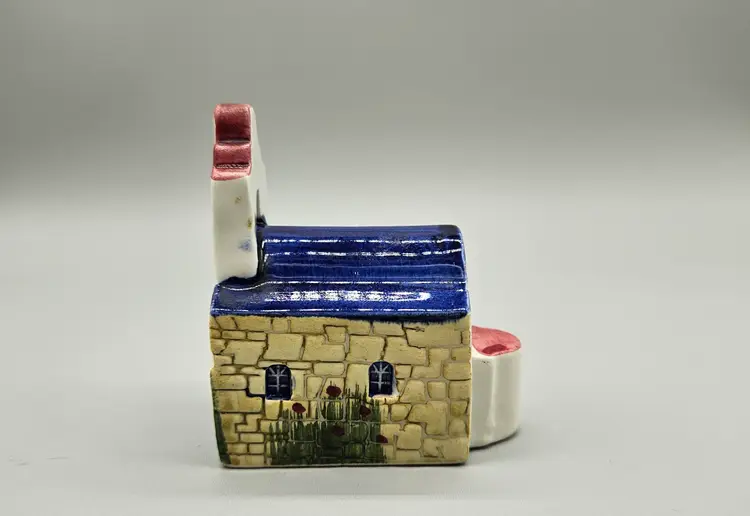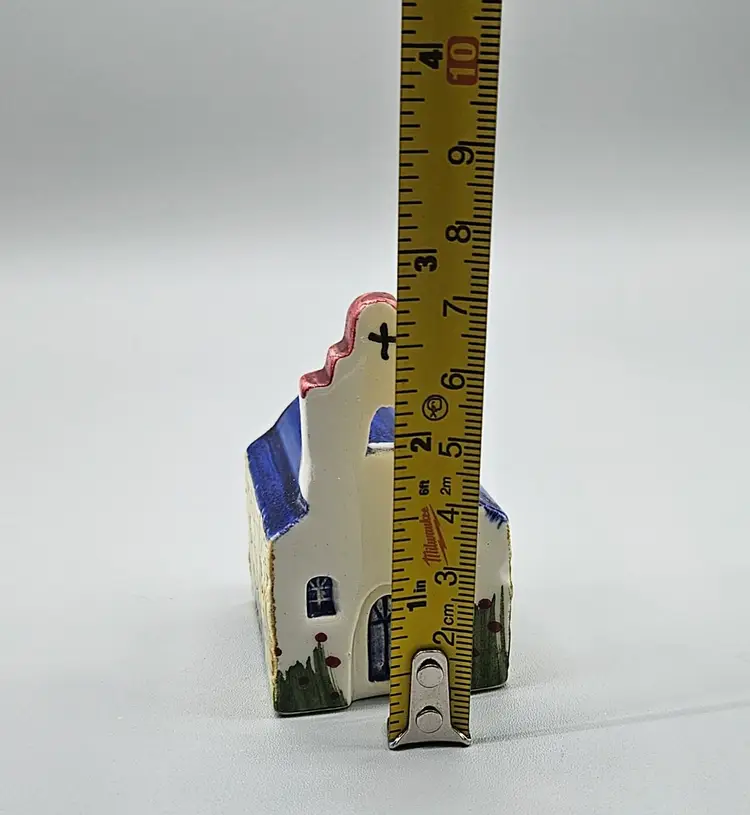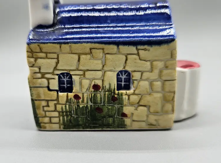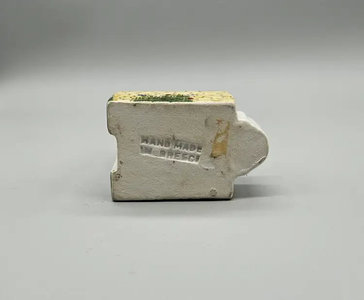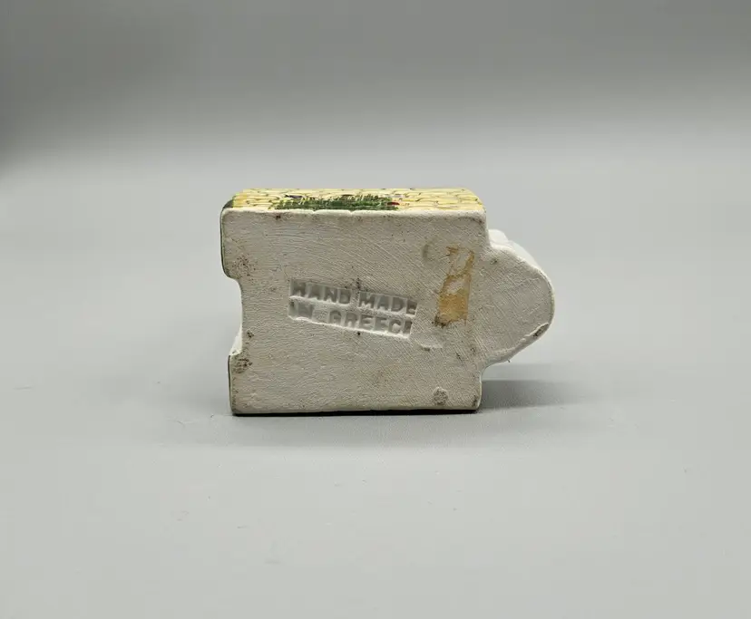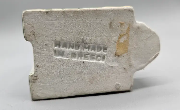 It is impressed, Handmade in Greece, on the bottom. It is in Good, Pre-owned condition, showing minimal wear from previous use. There are no breaks, no cracks, no chips. It is approximately 2 3/4" tall, 1 1/2" wide and 2 1/2" deep.